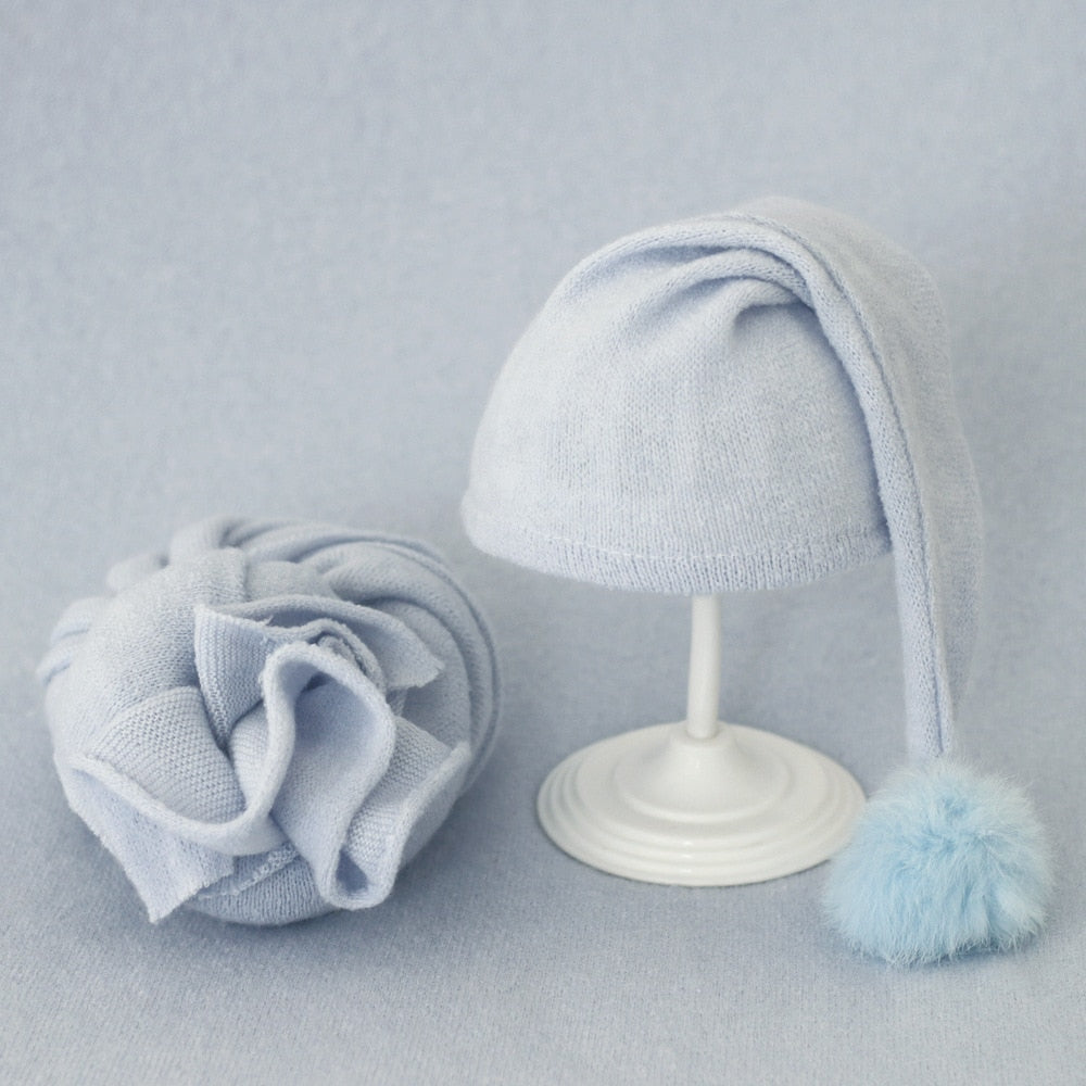 Conjunto de bebé con gorro tejido con bolas de pelo y manta para bebé