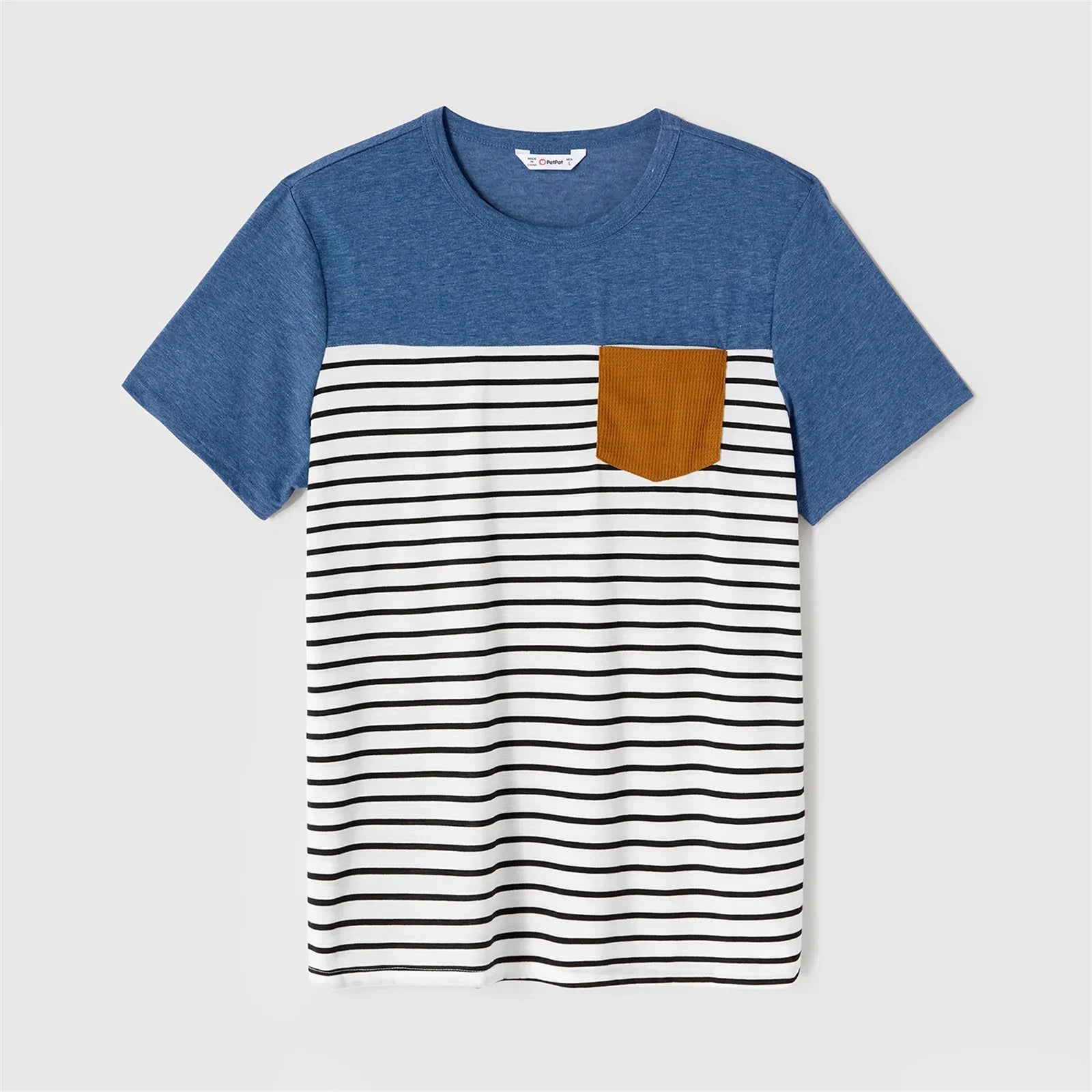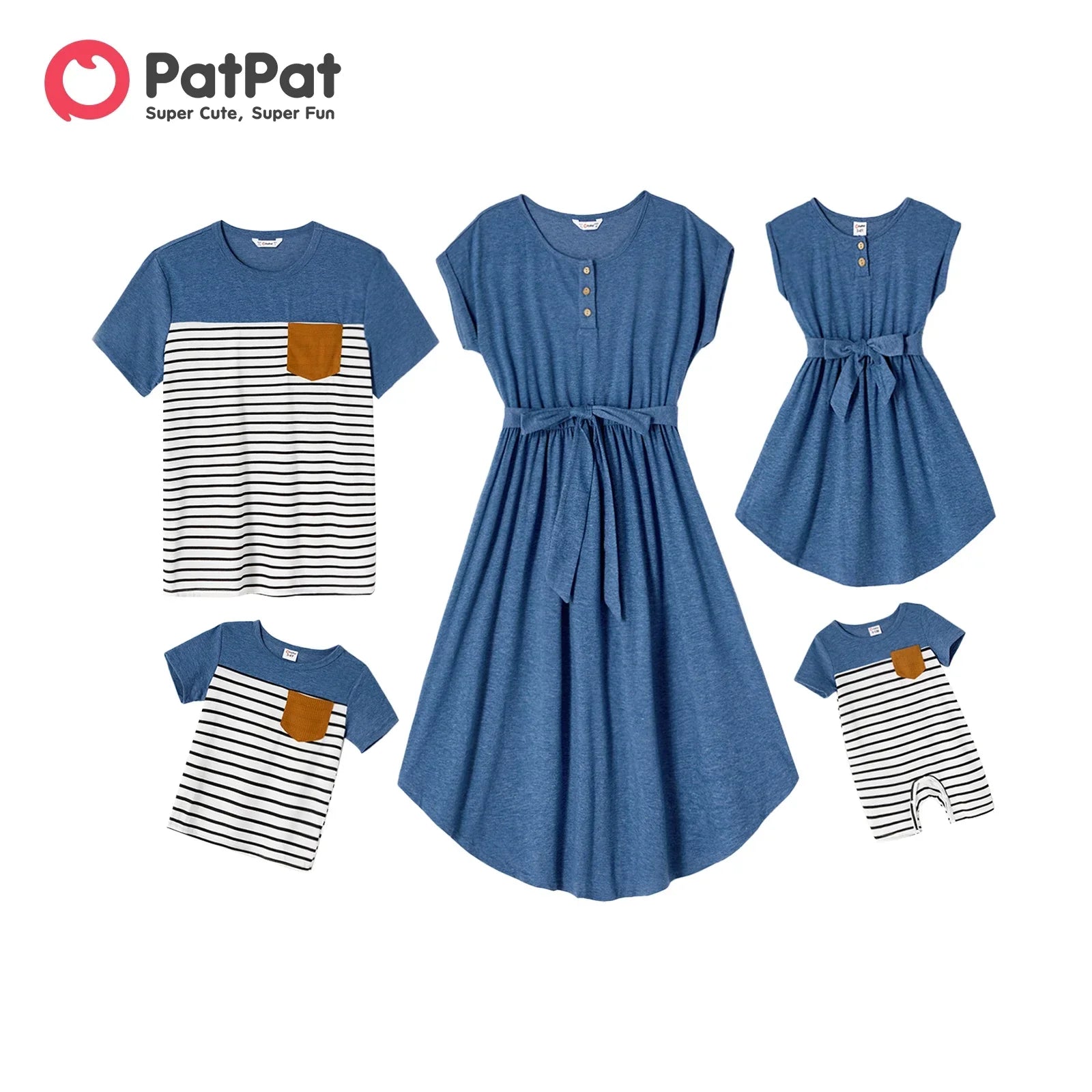 Conjuntos de vestidos con cinturón azul y camisetas a rayas para la familia