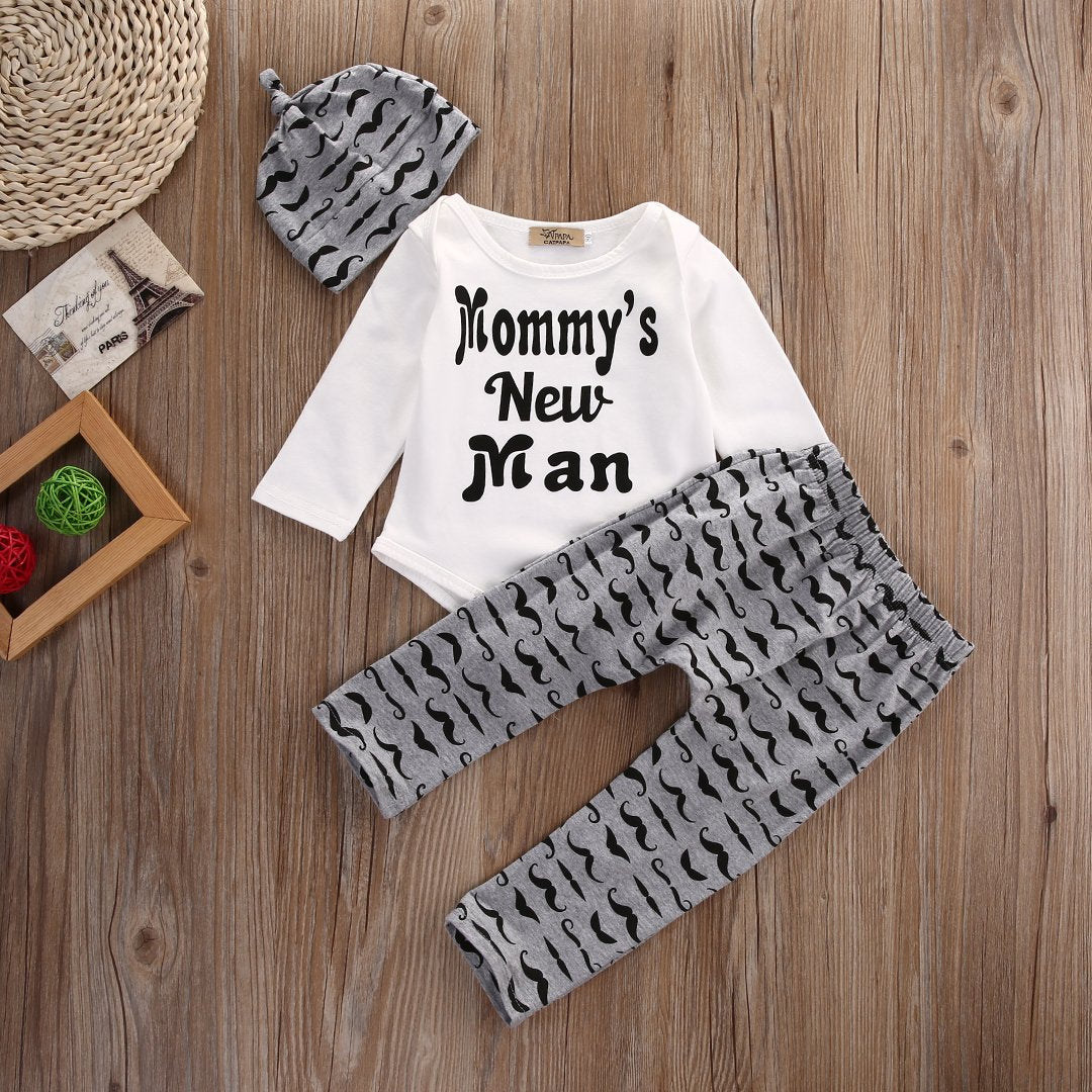 Para toda madre, la máxima curiosidad es ver a su hijo adulto. Siéntete igual con nuestro juego de 3 piezas "Mommy's New Man". Tiene estampado Mommy's New Man en el pelele y bigotes impresos en el gorro y los pantalones. Su material acogedor lo hará sentir cómodo y seguro.