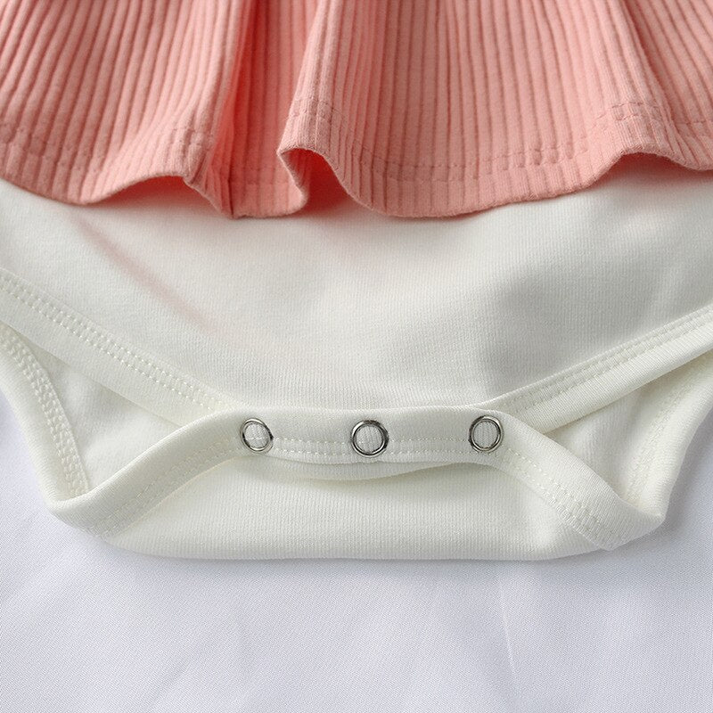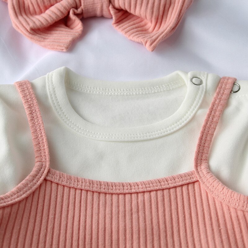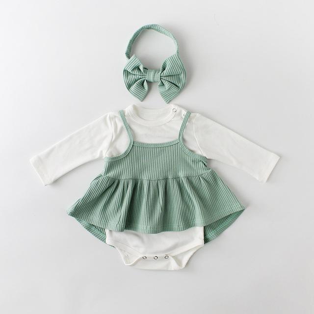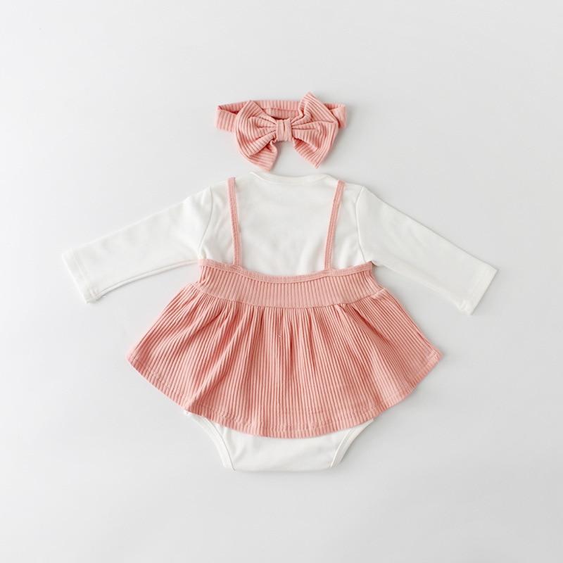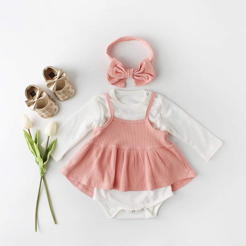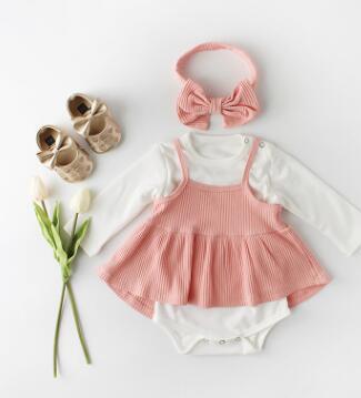 La primavera es una estación en la que a los niños les gusta estar libres de suéteres y chaquetas. El mameluco con vestido de tirantes a rayas hace encantadoras a las niñas a las que les gusta vestirse para dar un paseo por el parque o simplemente descansar en la cuna. El tejido de algodón es súper cómodo y transpirable, por lo que el niño puede disfrutar de una suave y agradable brisa primaveral. Los botones a presión del pelele hacen que el cambio de pañal sea fácil y rápido. El mono liso combinado con el vestido de tirantes a rayas lo convierte en un atuendo moderno. La diadema a juego añade más estilo al conjunto.