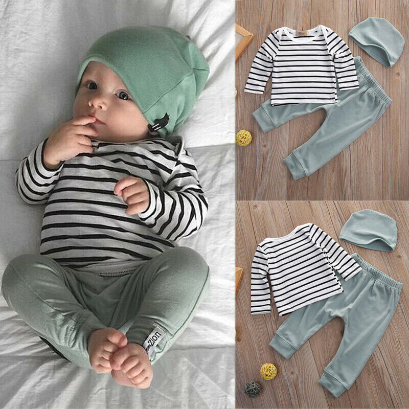 Los bebés deben vestirse con ropa cómoda y abrigada que les permita libre movimiento. Nuestro conjunto de ropa de camisa a rayas es un conjunto básico que toda madre debería tener para sus hijos. La camisa tiene las clásicas rayas negras , que se combinan con calzas y un sombrero verde . El material de algodón es suave y mantiene a los bebés calientes evitando que sufran sarpullidos. El conjunto de ropa es un conjunto completo que se puede usar en días informales o durante un sueño reparador.