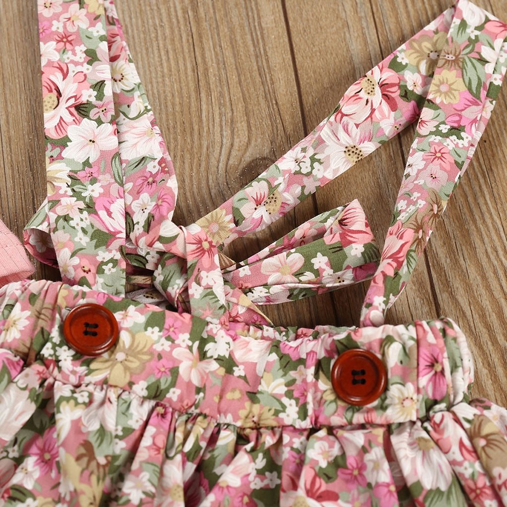The skirt has an array of pastel colors filling the floral design. The colors are subtle and the airy design makes it suitable for wearing in the spring/summer season. The suspensions attached with buttons make a bold fashion statement. The matching bow headband is all you need at the end to complete the look.