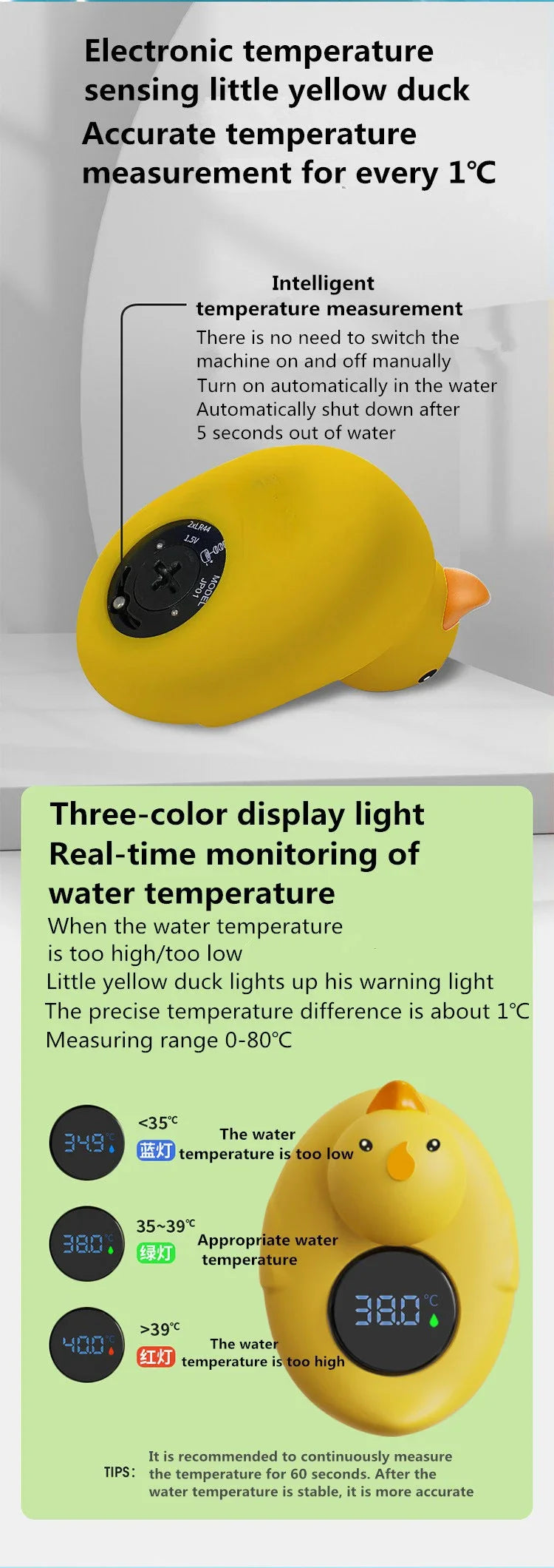 - Adorable Duck Shape: Shaped like a little yellow duck, this thermometer adds a fun and playful element to bath time, delighting both parents and babies alike.
