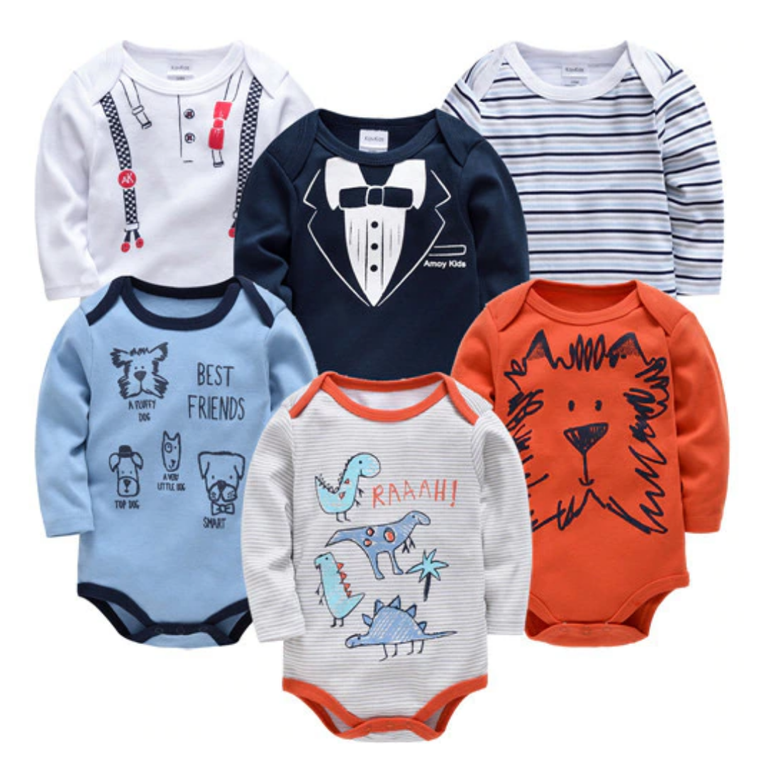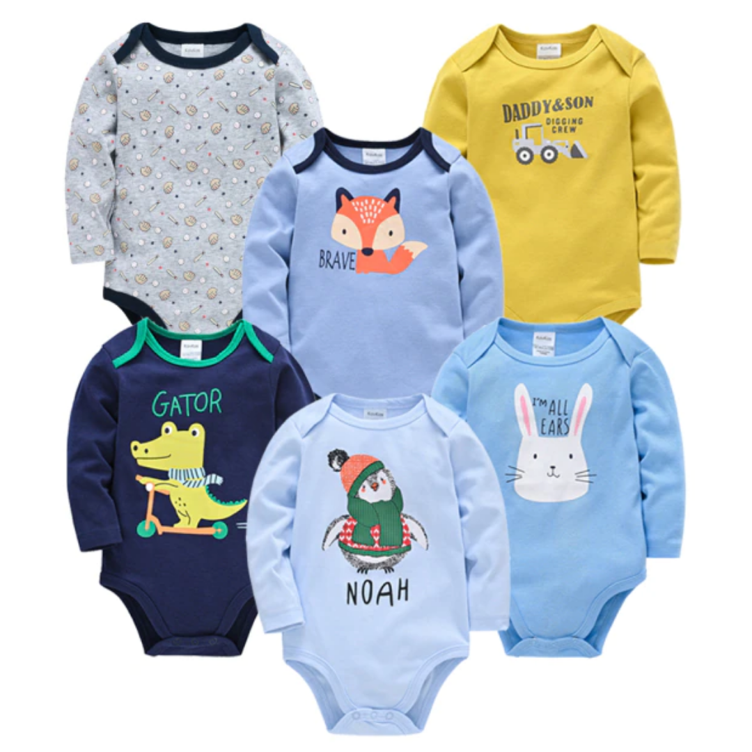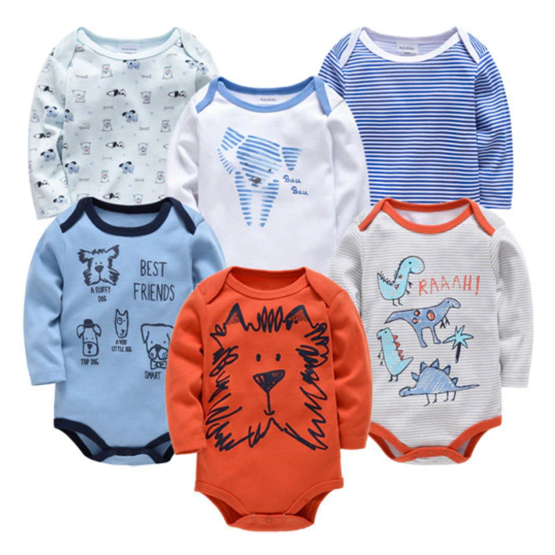 Paquete de 6 piezas de mamelucos de manga larga para bebé con estampado de dibujos animados
