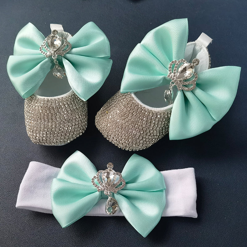 - Elegantes primeros caminantes adornados con cuentas y strass.