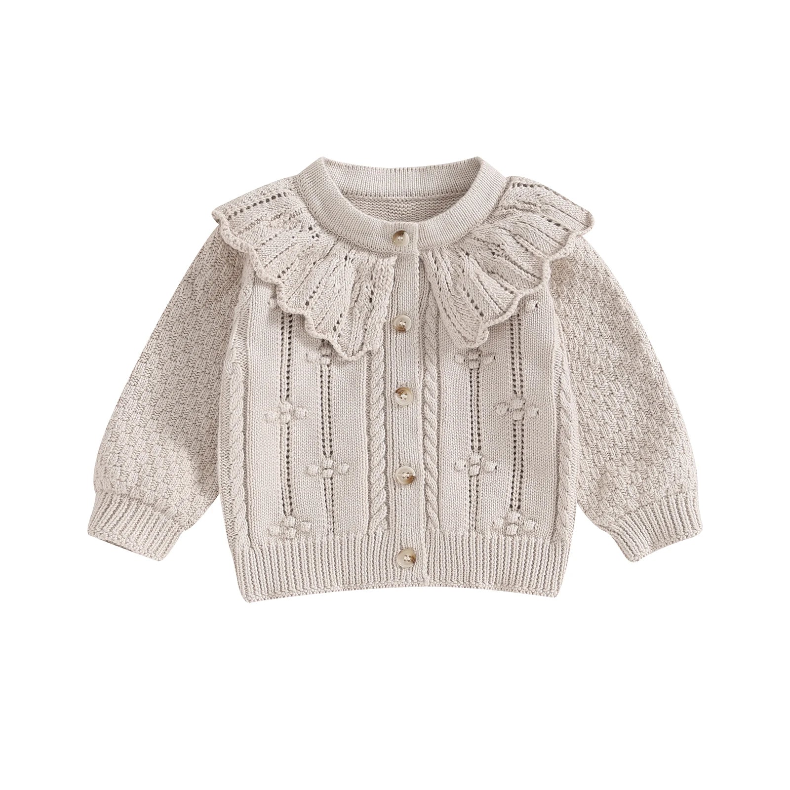 Diseñado para bebés niñas de 6 a 24 meses, este suéter presenta un cuello redondo para un ajuste cómodo. El intrincado collar de muñeca y el cierre de botón de crochet elevan su atractivo estético, creando una apariencia adorable y atemporal para su ser querido.