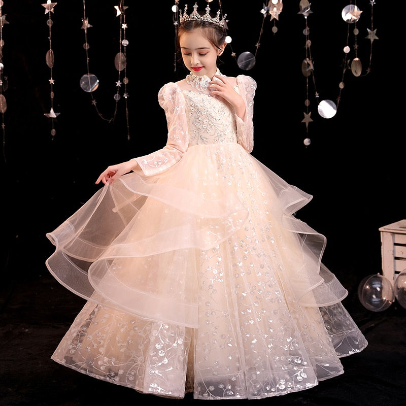 Elegant Sequin Long Sleeve Layer Luxury Gown