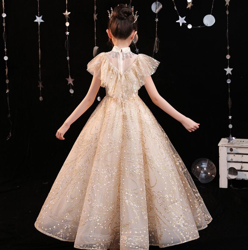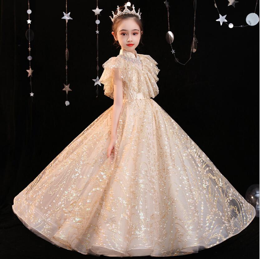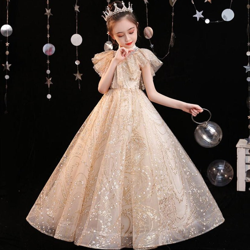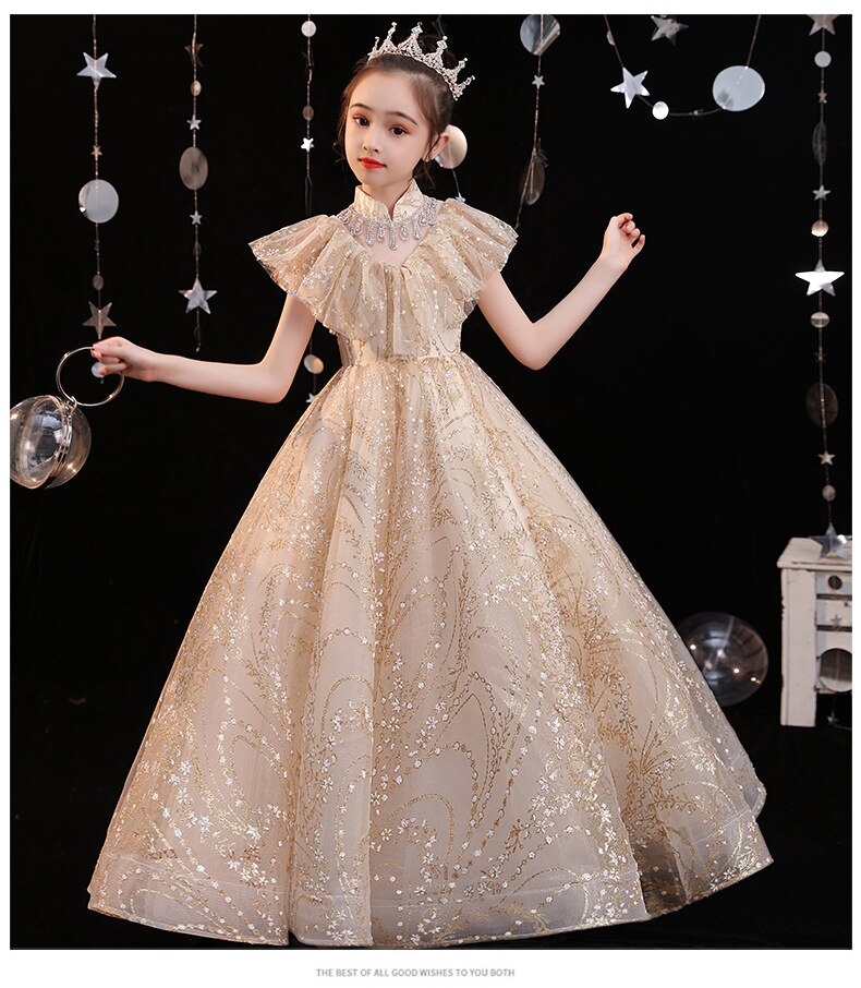 Este vestido de princesa con lentejuelas doradas definitivamente lucirá mágico y soñador en tu pequeña. Cada detalle está perfeccionado para brindar ese aspecto real y elegante que toda chica desea experimentar.