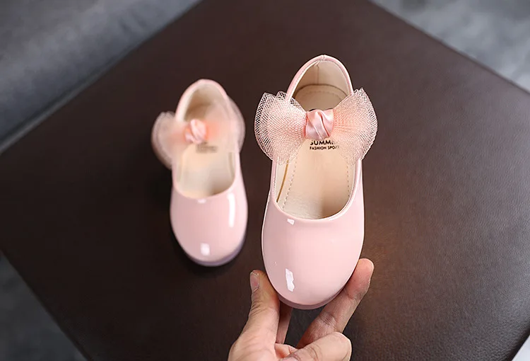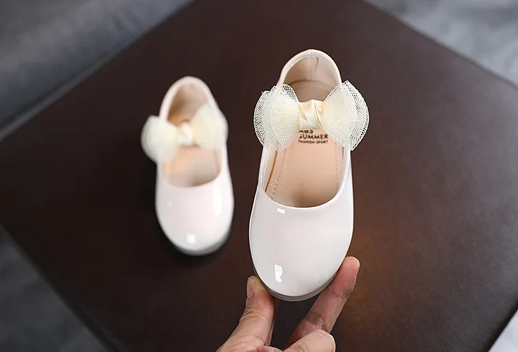 Zapatos planos de cuero de moda para niñas con diseño de pajarita de encaje
