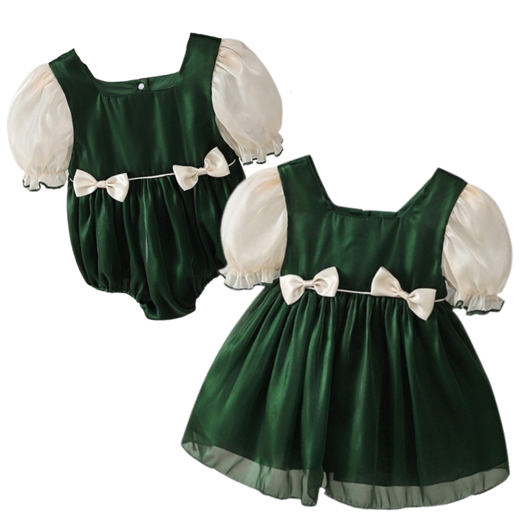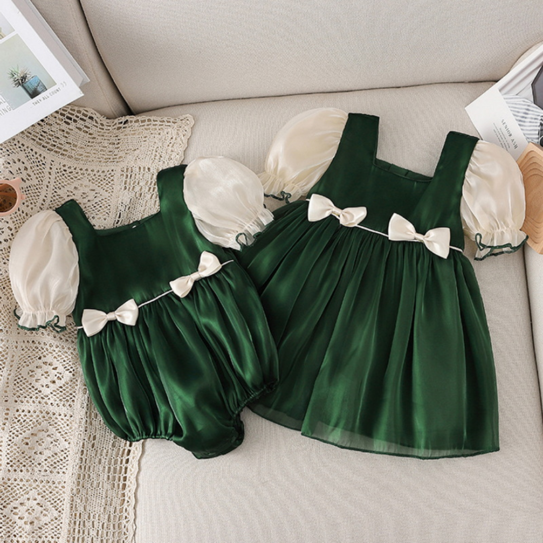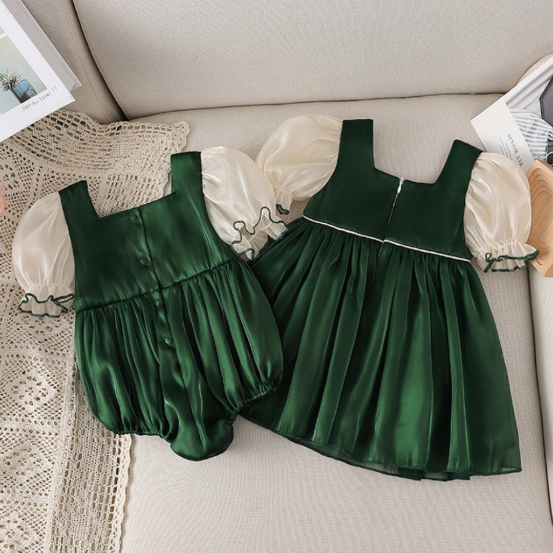 Este conjunto a juego para hermanos con diseño de lazo y mangas abullonadas presenta un estilo de diseño de moda europeo con un detalle de lazo blanco y un estilo de mangas abullonadas que complementa la tela verde sedosa. Un conjunto de moda perfecto para hermanas pequeñas y mayores en su primera sesión de fotos o fiesta de cumpleaños juntas.