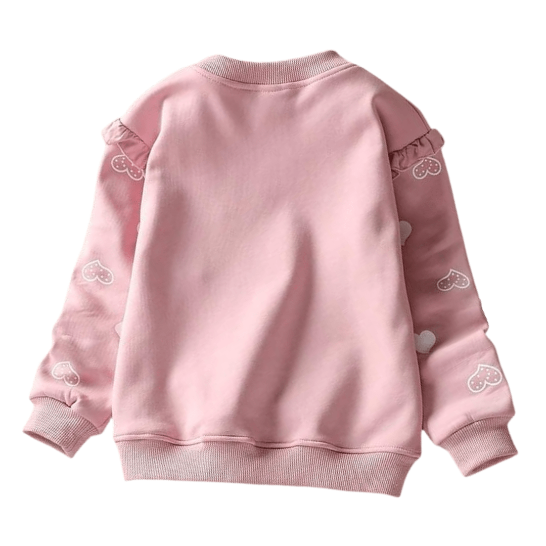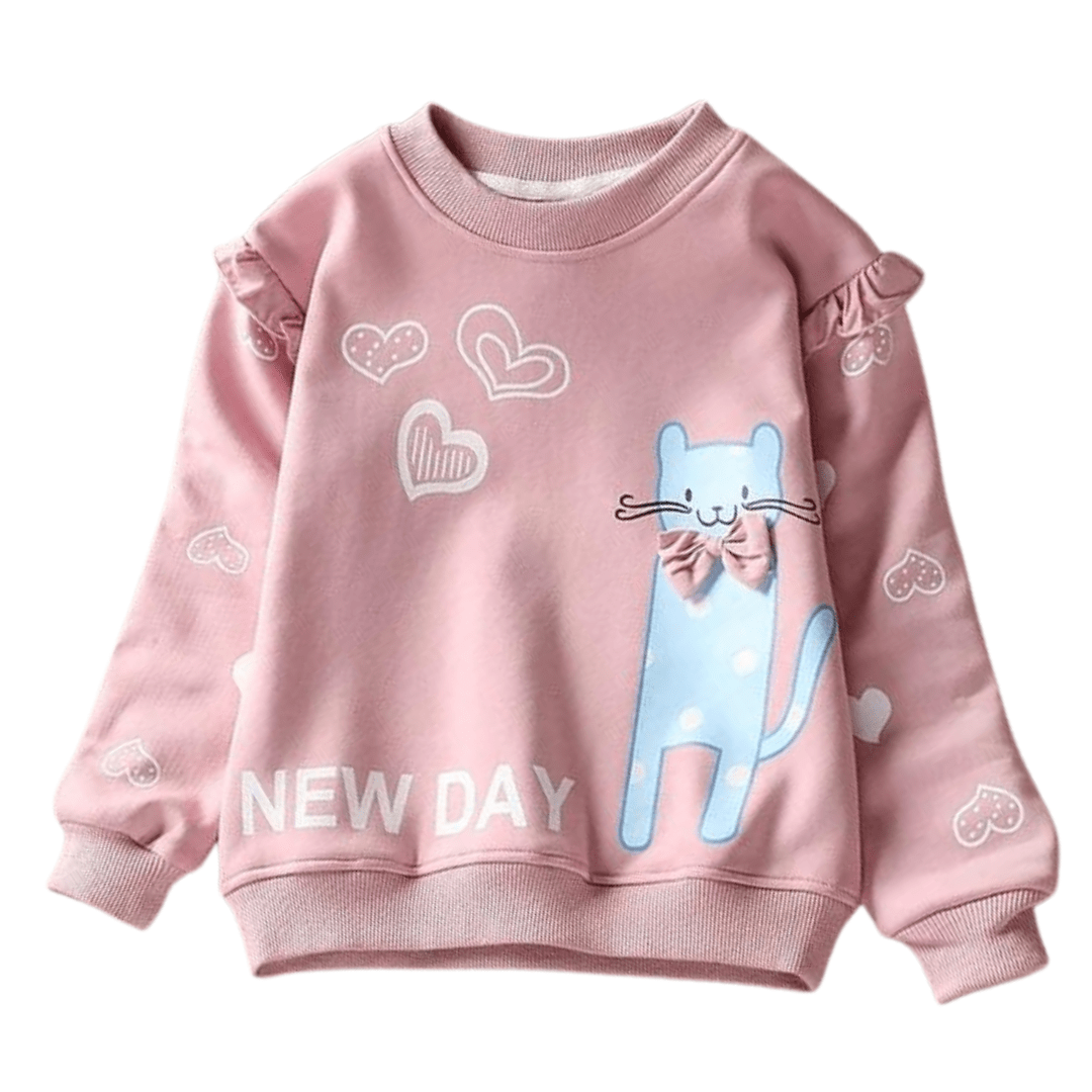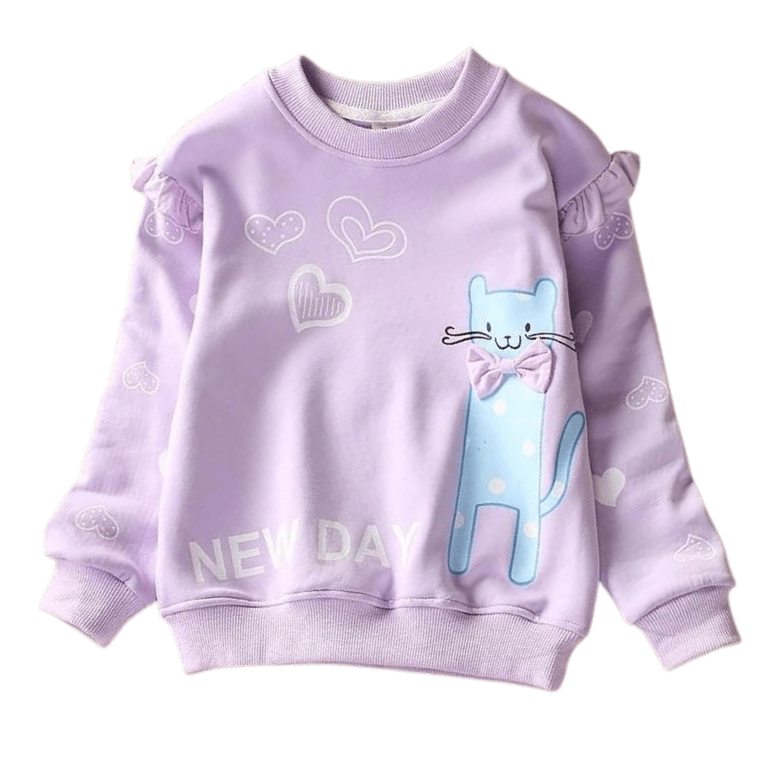 Este suéter con diseño de dibujos animados de gato de New Day es un suéter muy lindo y moderno para niñas. Está hecho de algodón que es cómodo de llevar. Tiene cuello redondo, manga completa y estampados de corazones por todas partes. El diseño con estampado de gato lo hace lucir tan encantador. Es un suéter que mantiene abrigada a tu pequeña durante la temporada de frío.