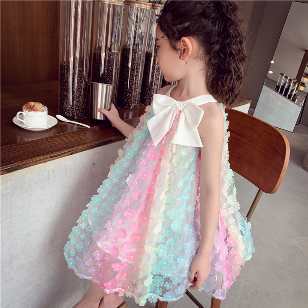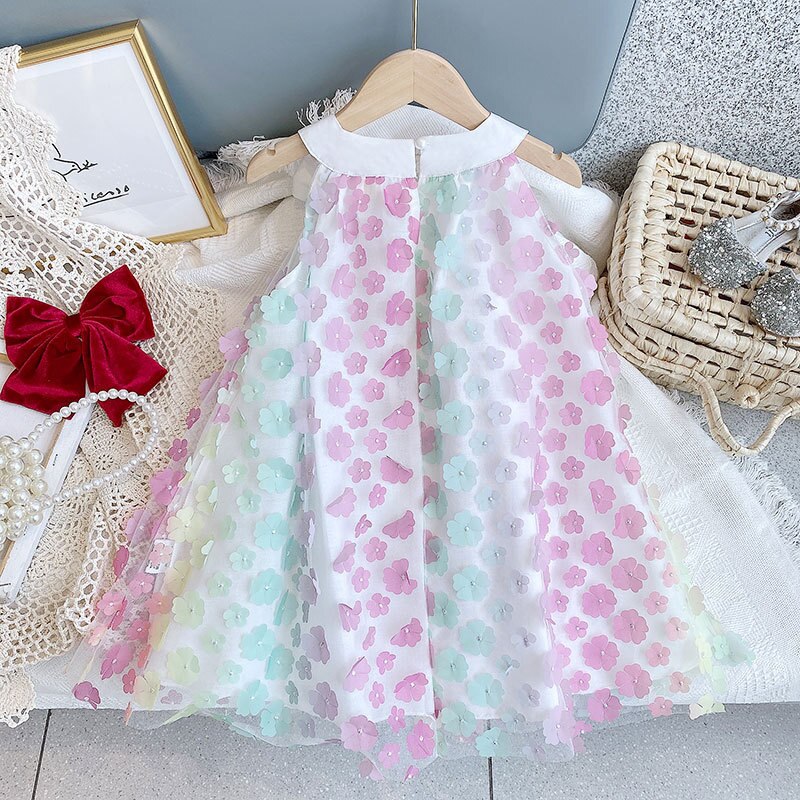 Este vestido hasta la rodilla de princesa de verano sin mangas con flores y arcoíris es muy lindo y adecuado para el estilo de moda de tu pequeña princesa. Se puede usar tanto en fiestas como en el día a día.