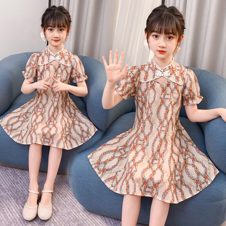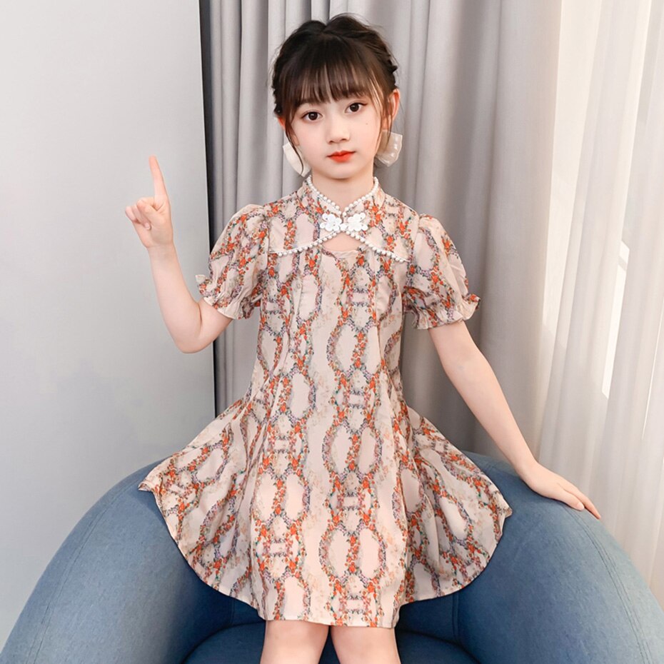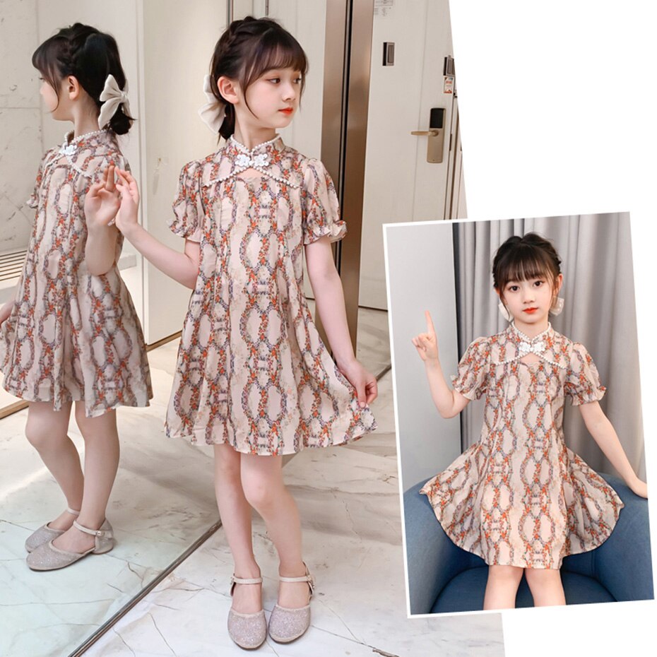 Vestido casual de princesa estilo Qipao con estampado floral y mangas abullonadas