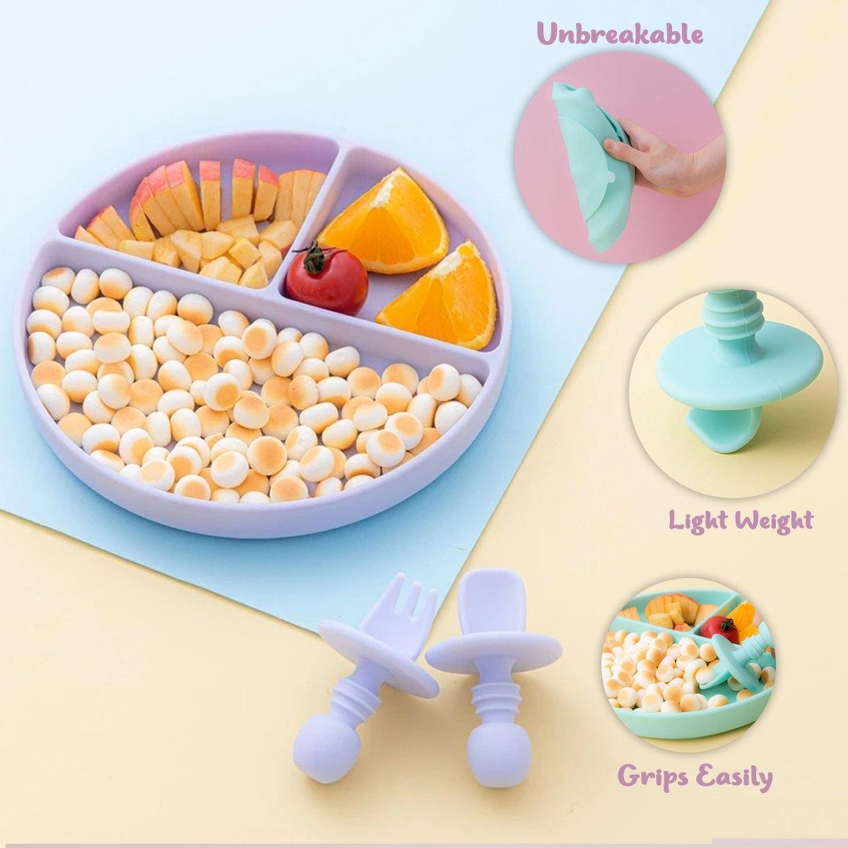Presentamos Platos de Silicona Especiales para Bebés. Estas placas están fabricadas con material de silicona biodegradable que es fácil de transportar y liviano. El juego de platos incluye una cucharita de silicona, un tenedor blando y un plato con partición. Este material de silicona es flexible e irrompible, ofrece un agarre firme y se mantiene en la mesa y en las manos de los pequeños. Ideal para cuando tu pequeño empieza a comer solo (no se menciona ningún punto de seguridad e higiene)