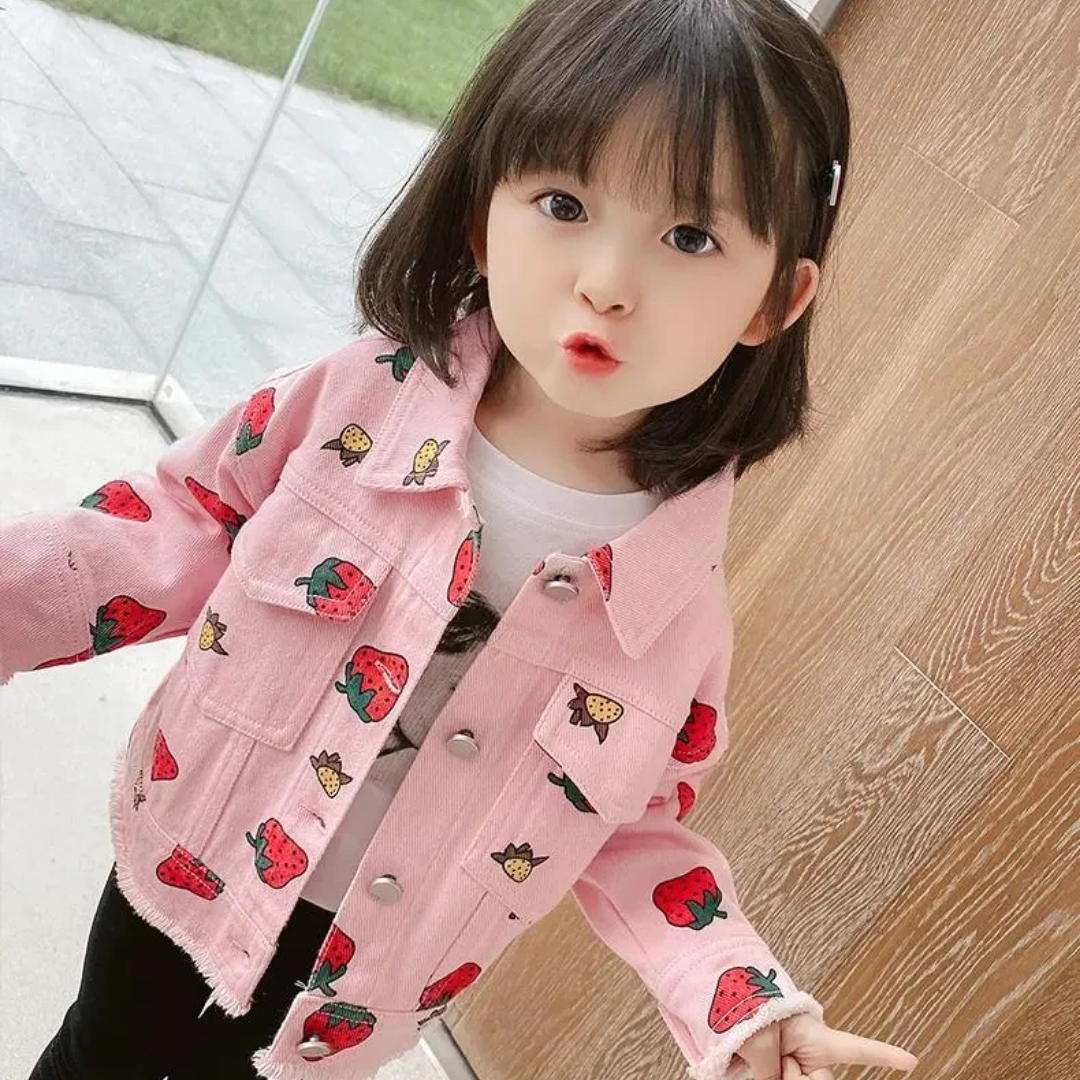 Esta chaqueta vaquera con estampado de fresas es un abrigo súper lindo para tu pequeña. La hará lucir adorable y al mismo tiempo muy cómoda. El material de la chaqueta es muy suave y cálido, lo que mantendrá a tu bebé a una temperatura adecuada en todas las condiciones climáticas.