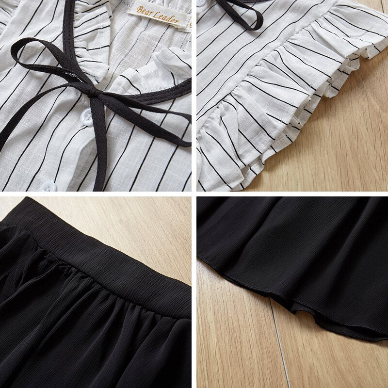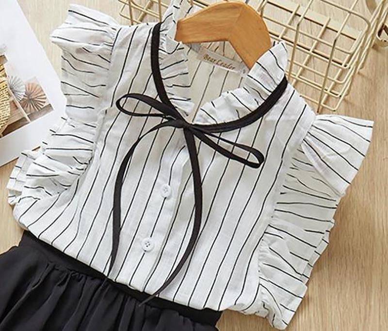 Traje sin mangas a rayas Es un atuendo elegante para tus queridas niñas. Está confeccionado en algodón suave, transpirable y cómodo de llevar . La blusa es una sencilla blusa con botones a rayas blancas y negras . El escote y las sisas sin mangas están forrados con volantes. Además de eso, el escote con volantes está adornado con una cinta negra marcada que está atada en un lazo. La falda plisada es negra que aporta un toque de elegancia al conjunto. El atuendo se puede usar tanto en reuniones sociales formales como informales. Es un regalo perfecto para las niñas.