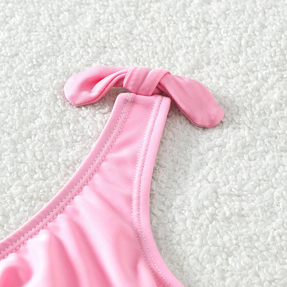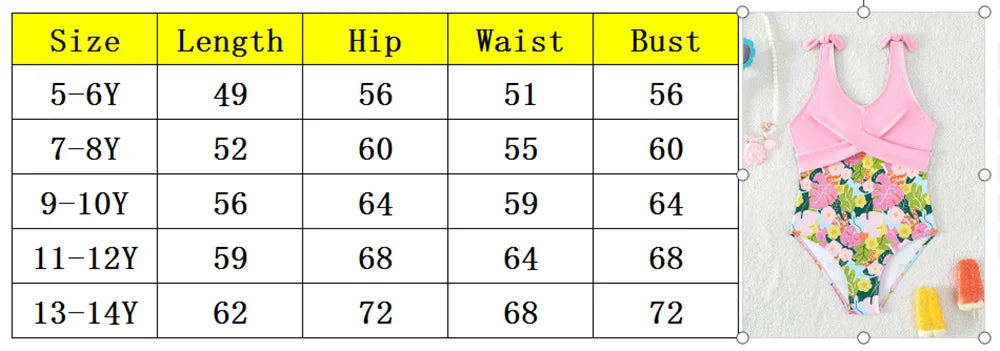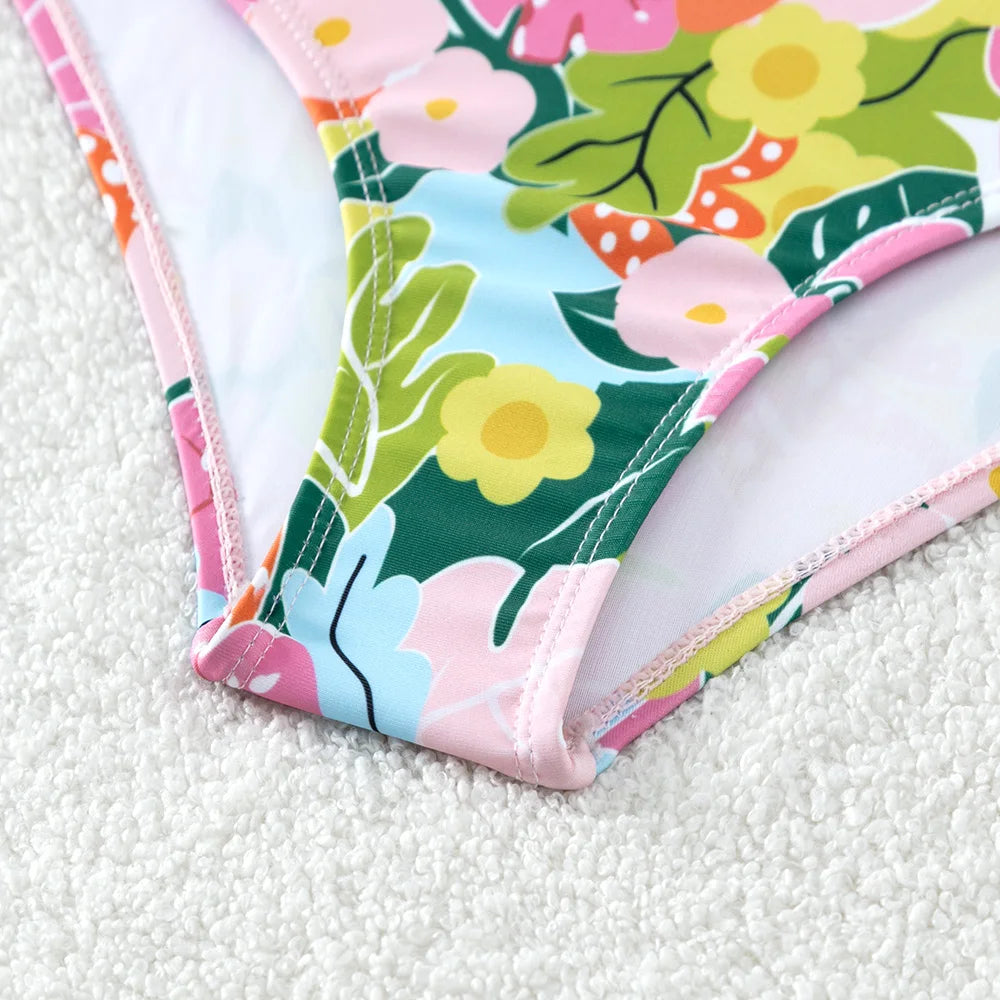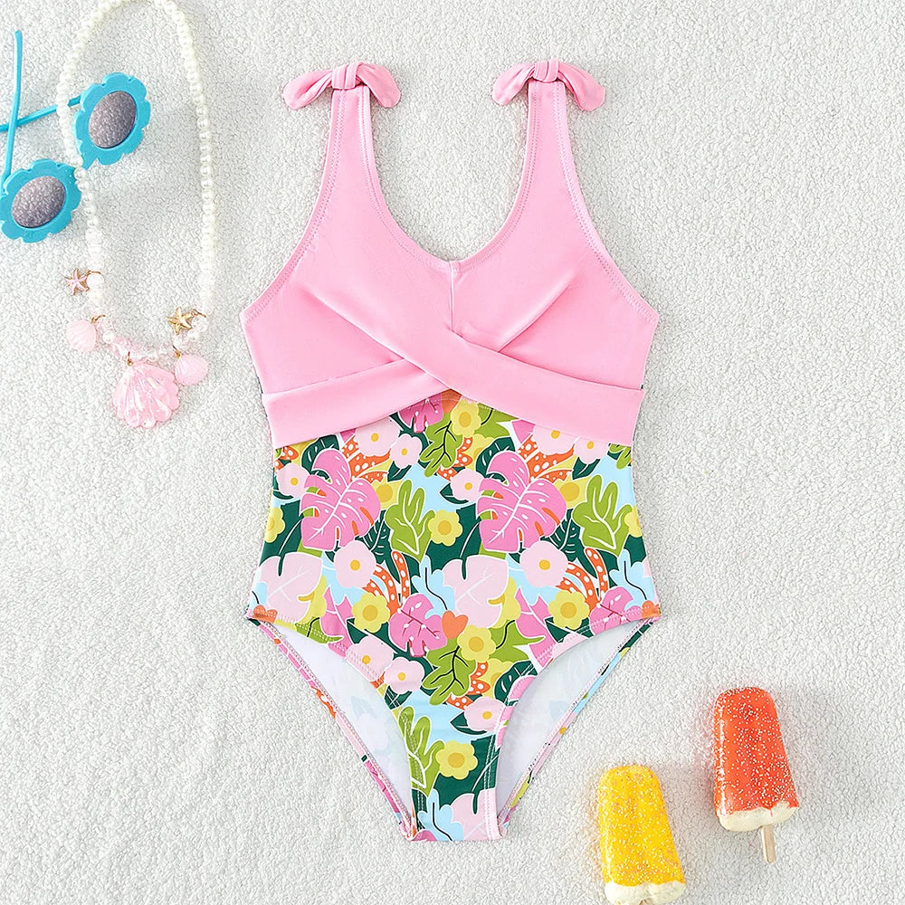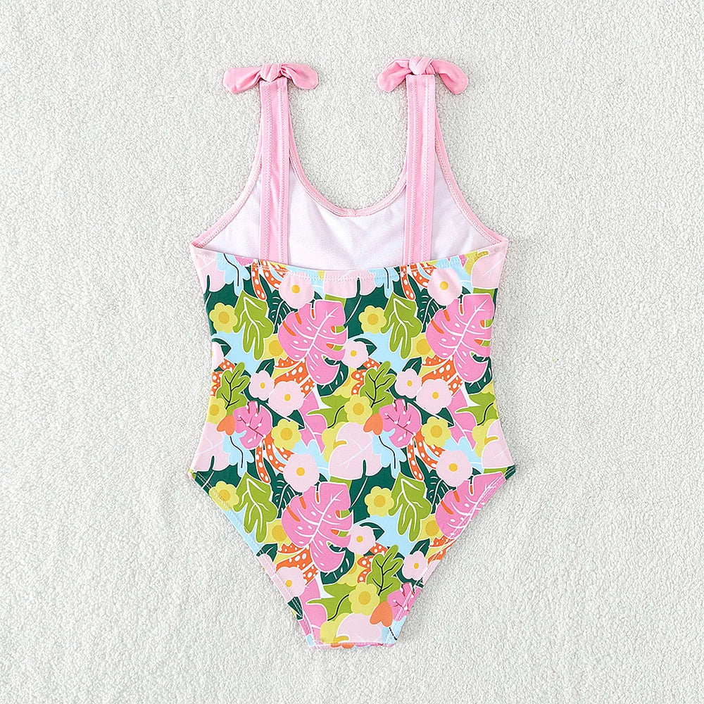 Traje de baño rosa con estampado de plantas tropicales: traje de baño de una pieza con correa de mariposa para niña