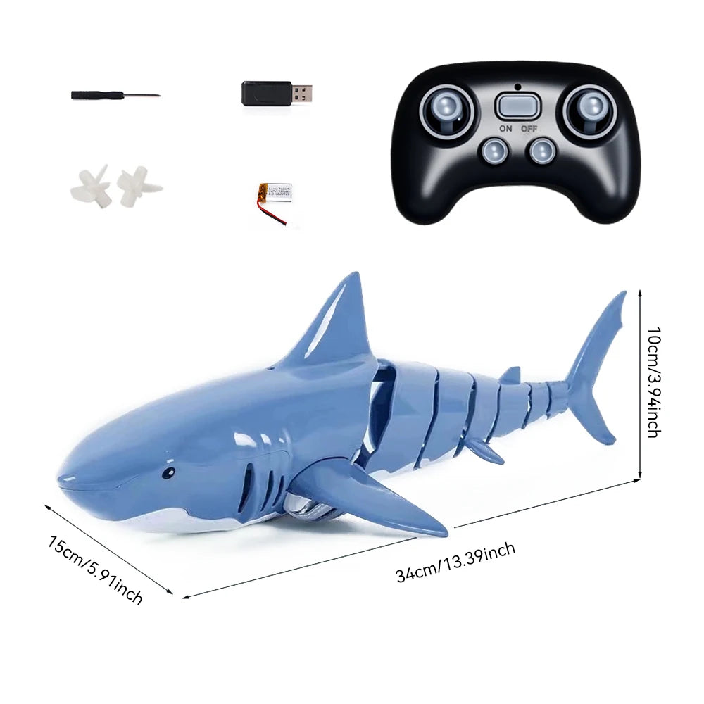 Tiburón simulador eléctrico de control remoto, robot submarino RC 2.4G con capacidades submarinas, función de rociado de agua y batería recargable (edades 7+)