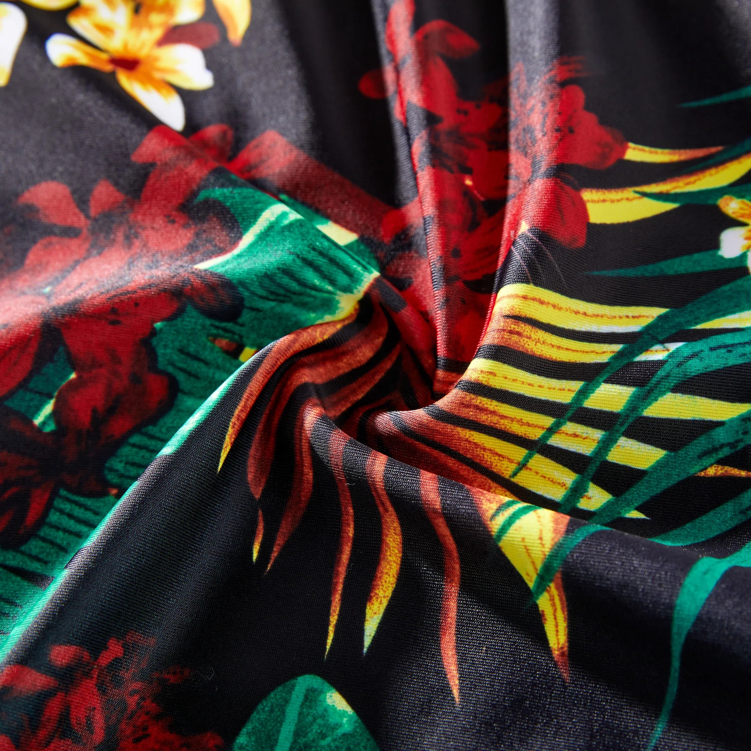 - High-stretch, quick-drying swimsuit material printed with tropical plant patterns.