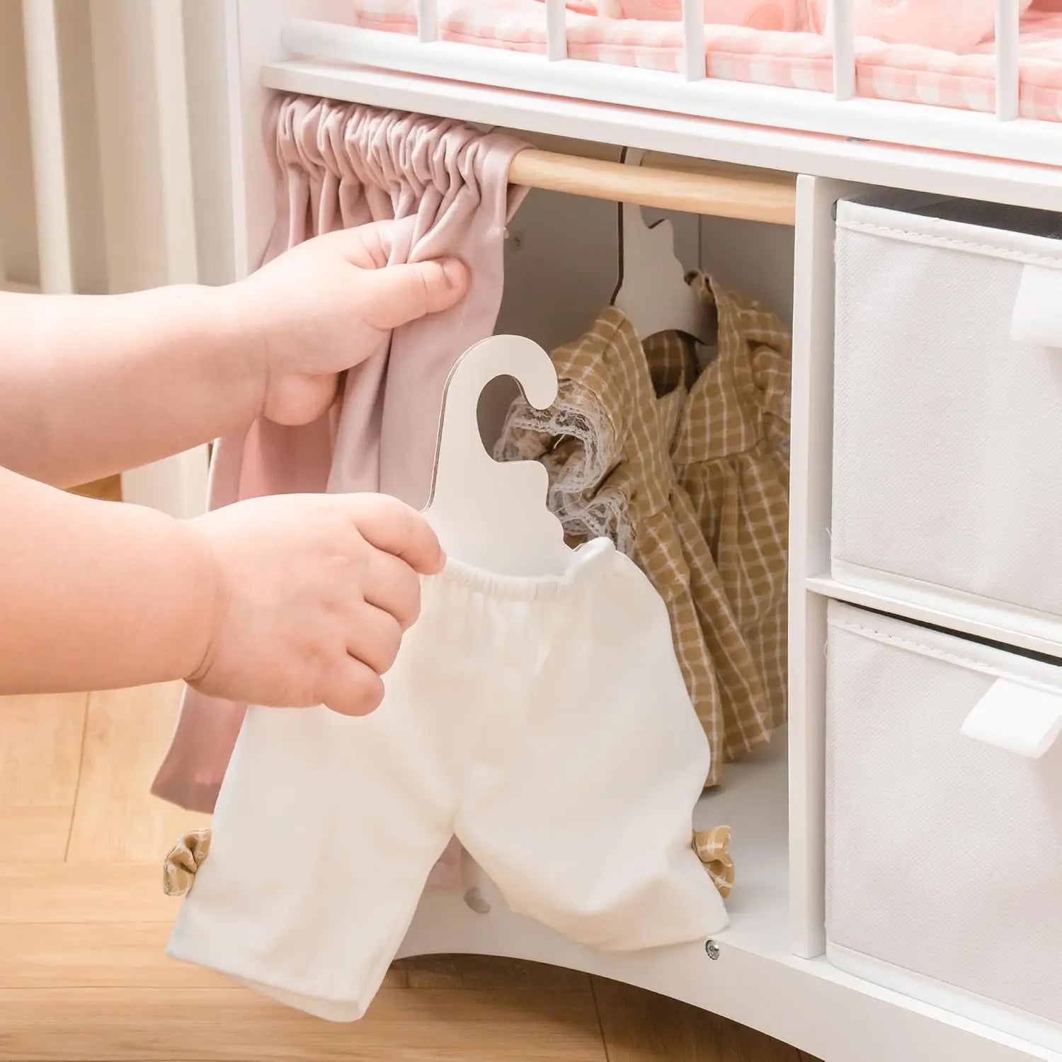 Cuna de madera para muñecas con almacenamiento - Cama rosa para muñecas con ropa de cama y ganchos para niñas a partir de 3 años