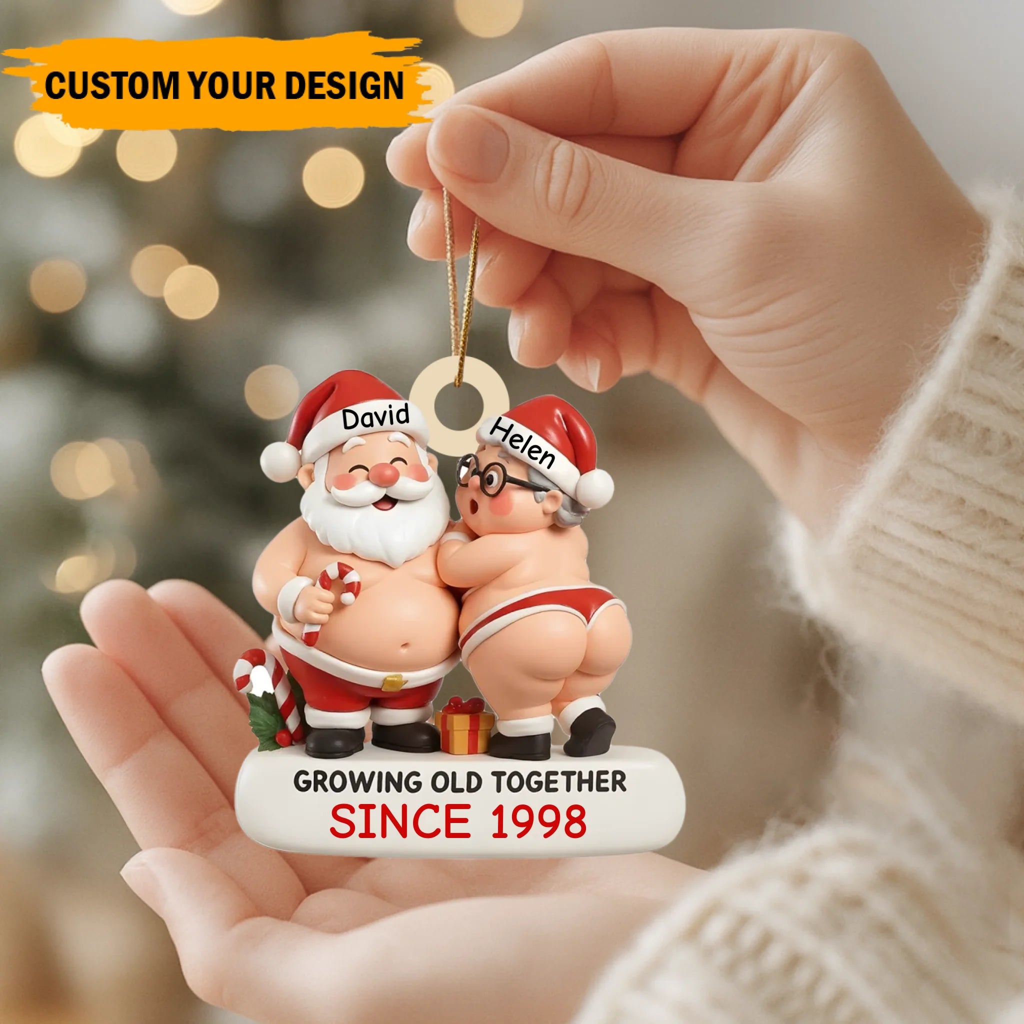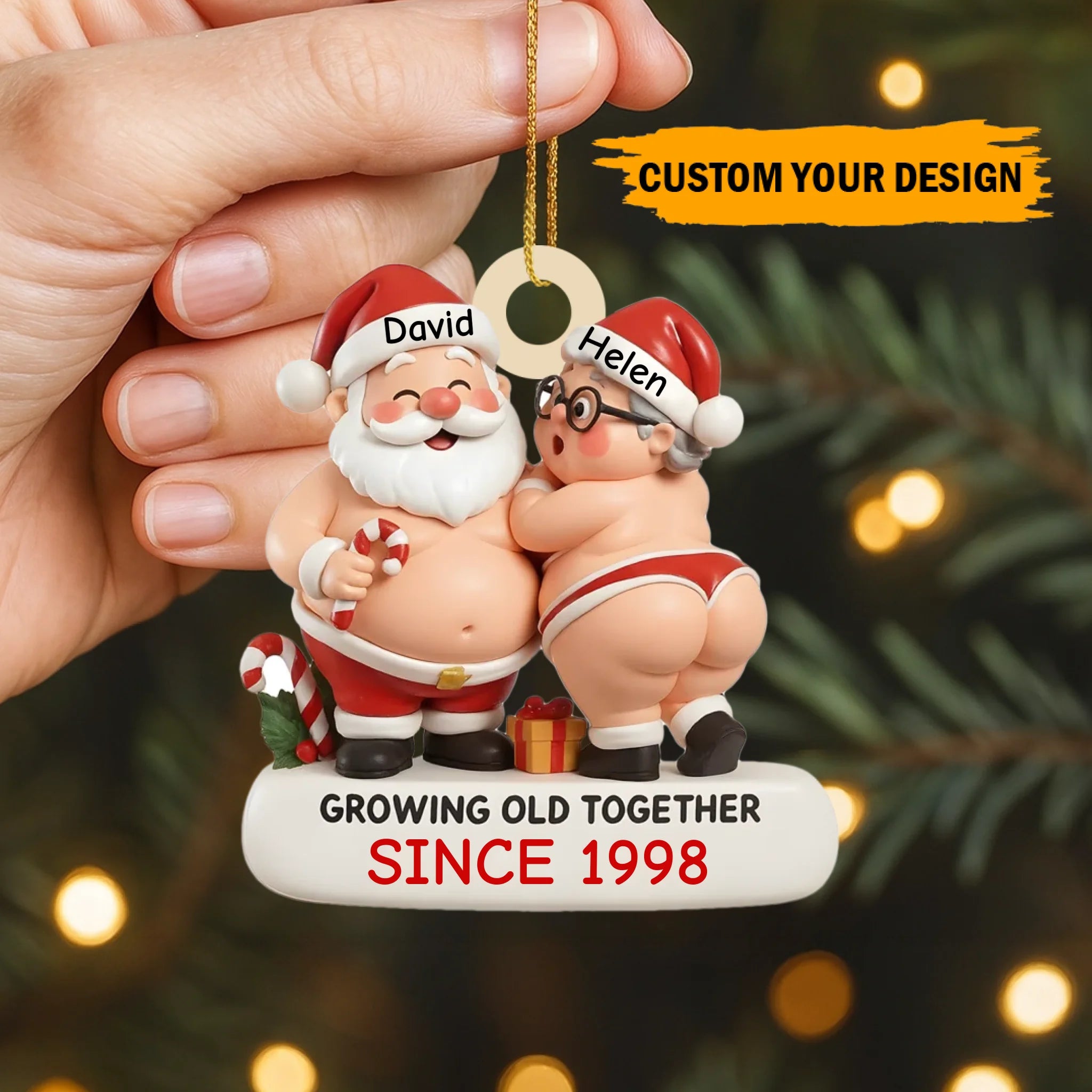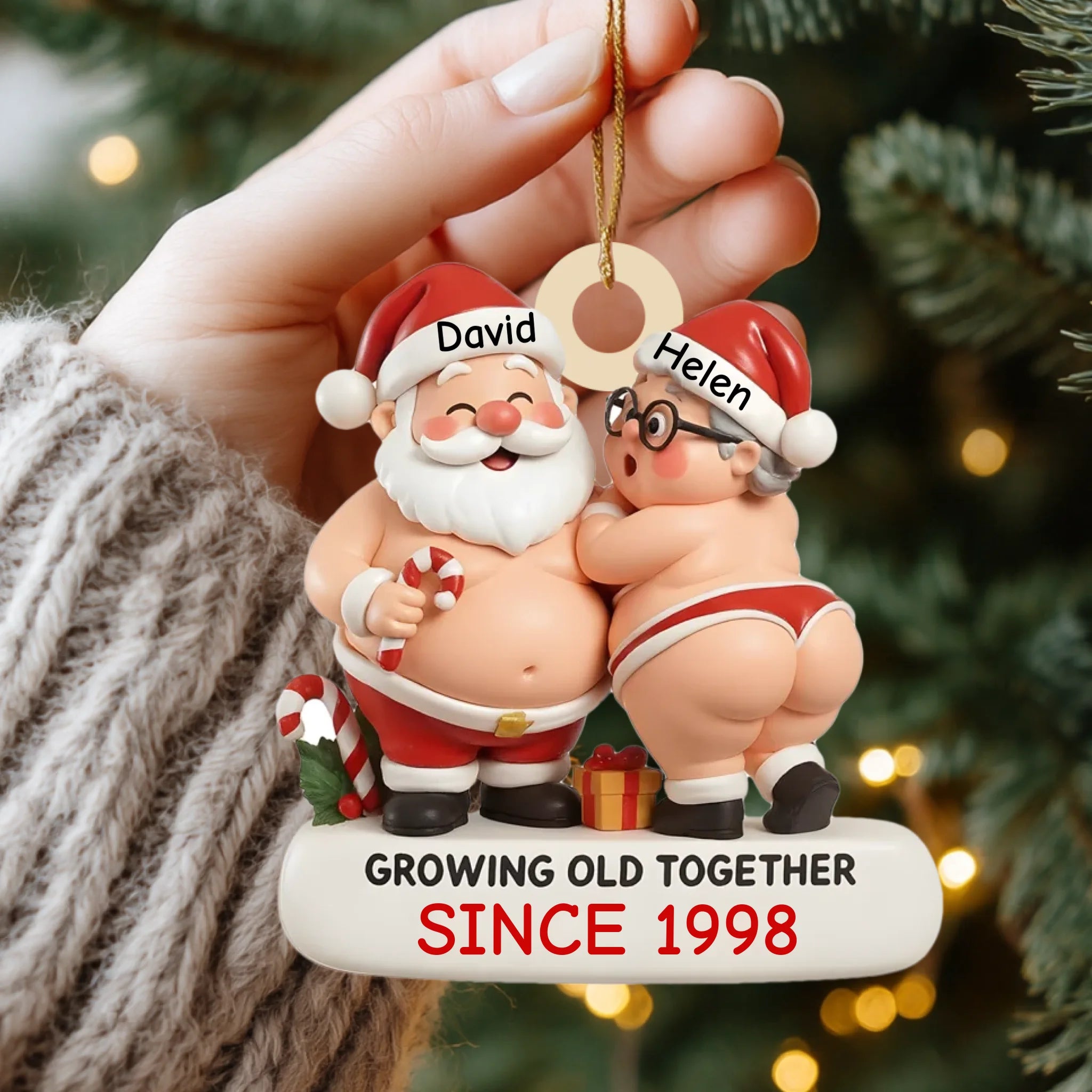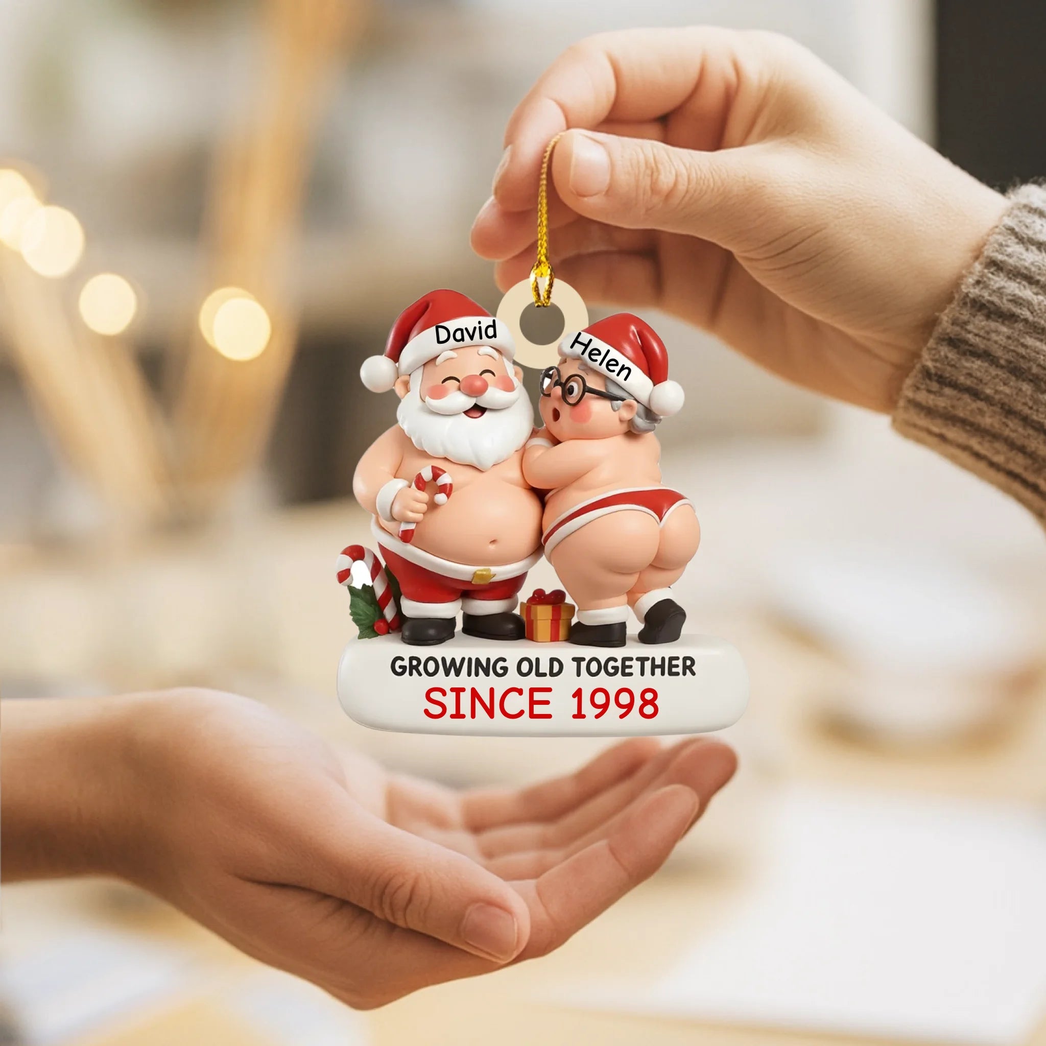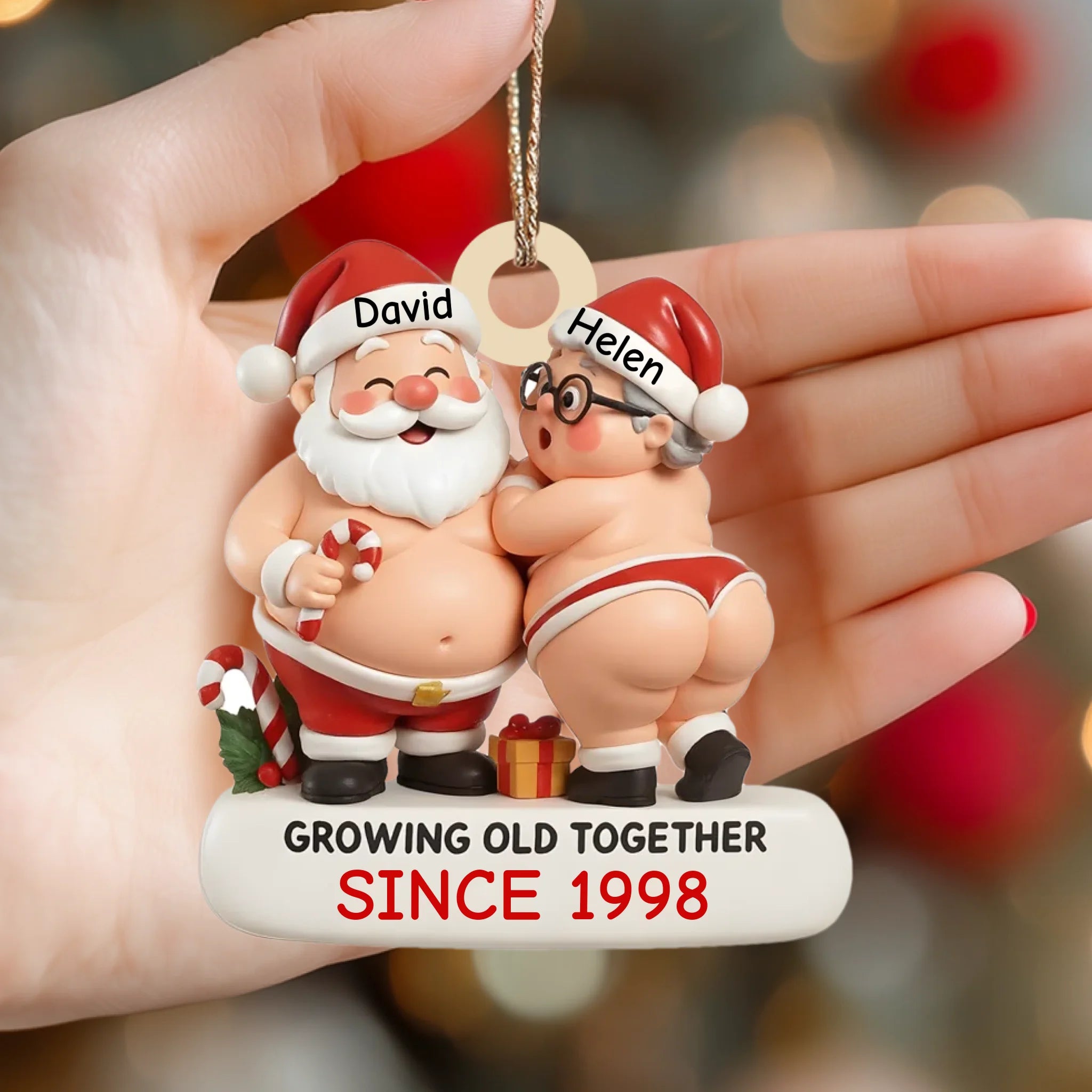 Christmas ornament with Santa Claus and a woman, labeled 'Growing Old Together Since 1998', held by a hand with a blurred festive background.