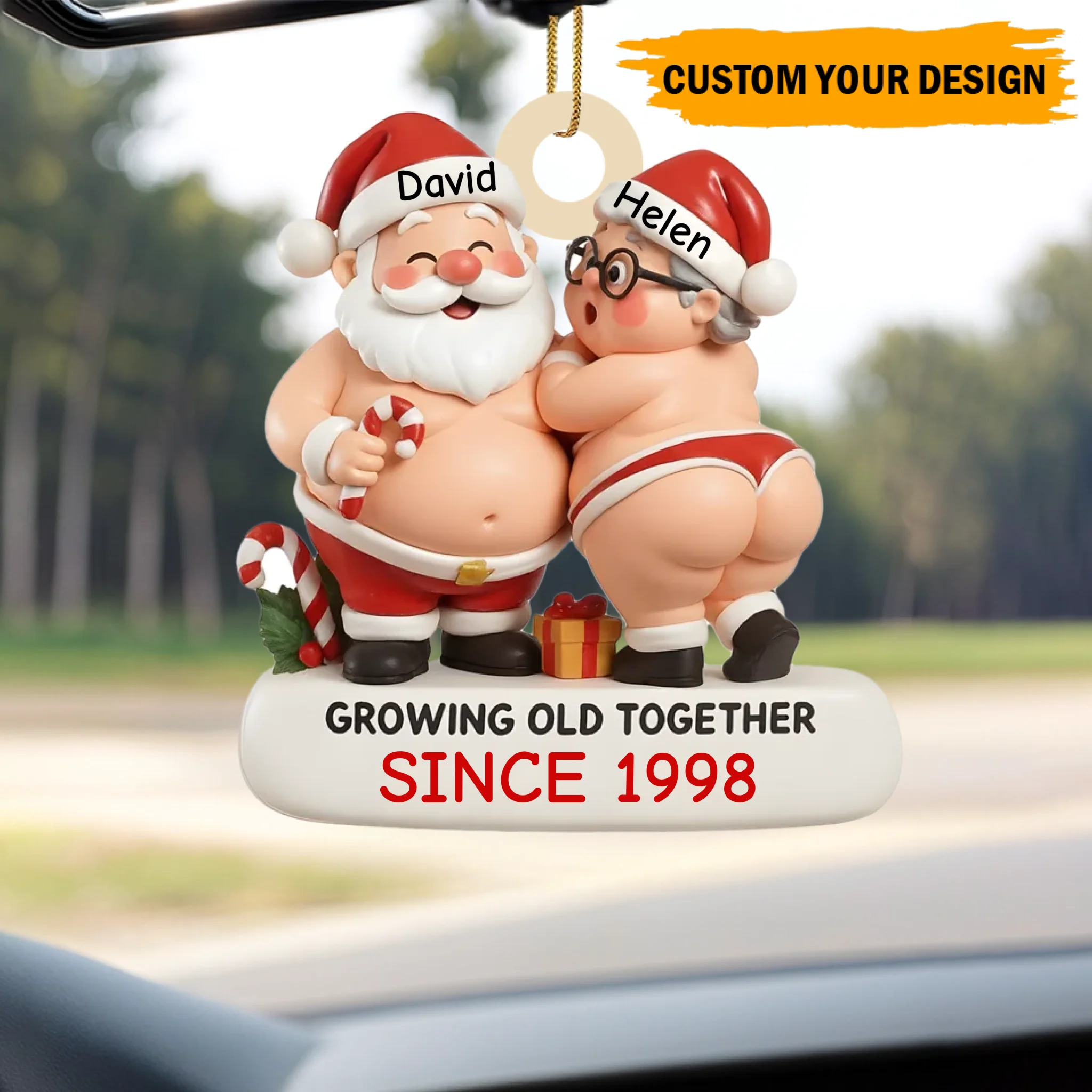 Decorative ornament of two people in Santa hats with text 'Growing old together since 1998' on a car dashboard.