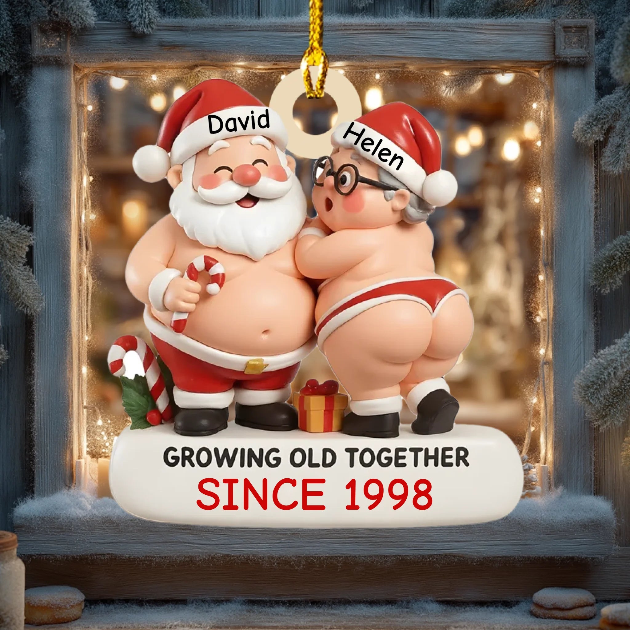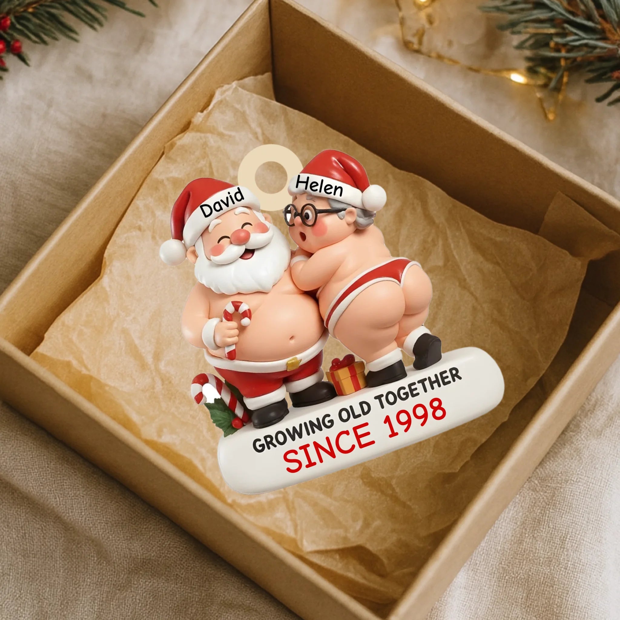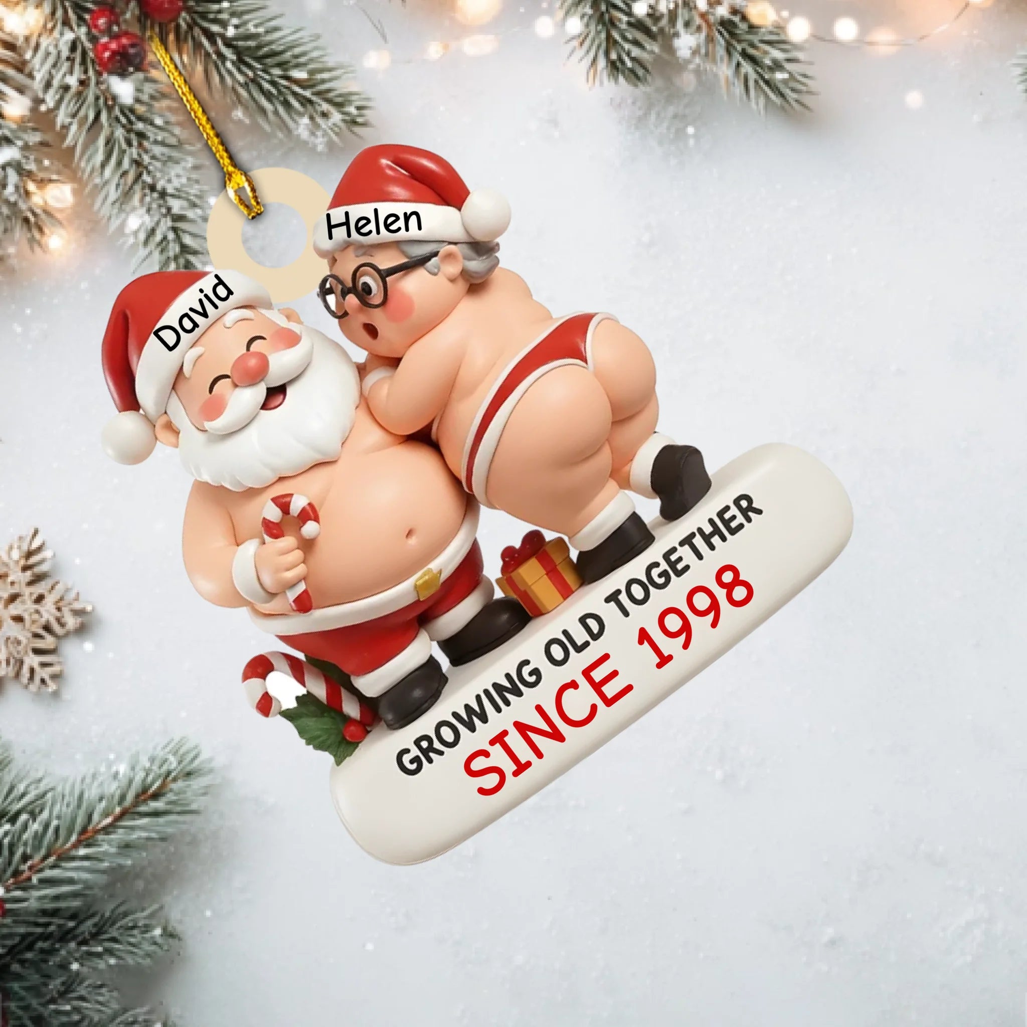 Decorative ornament with cartoon Santa and woman in underwear, labeled 'David' and 'Helen', with text 'Growing old together since 1998'.