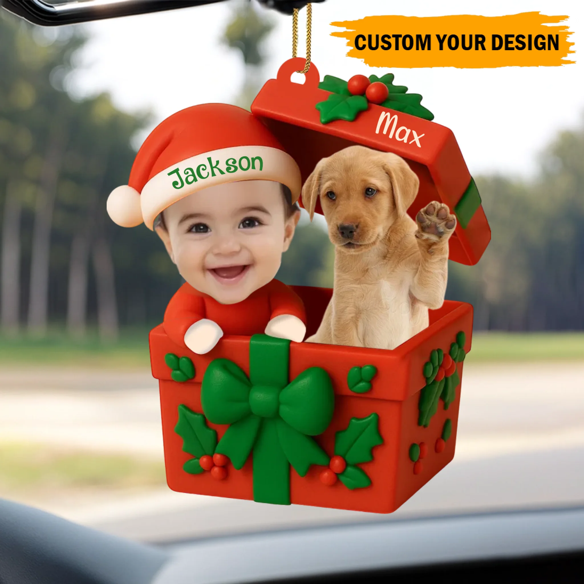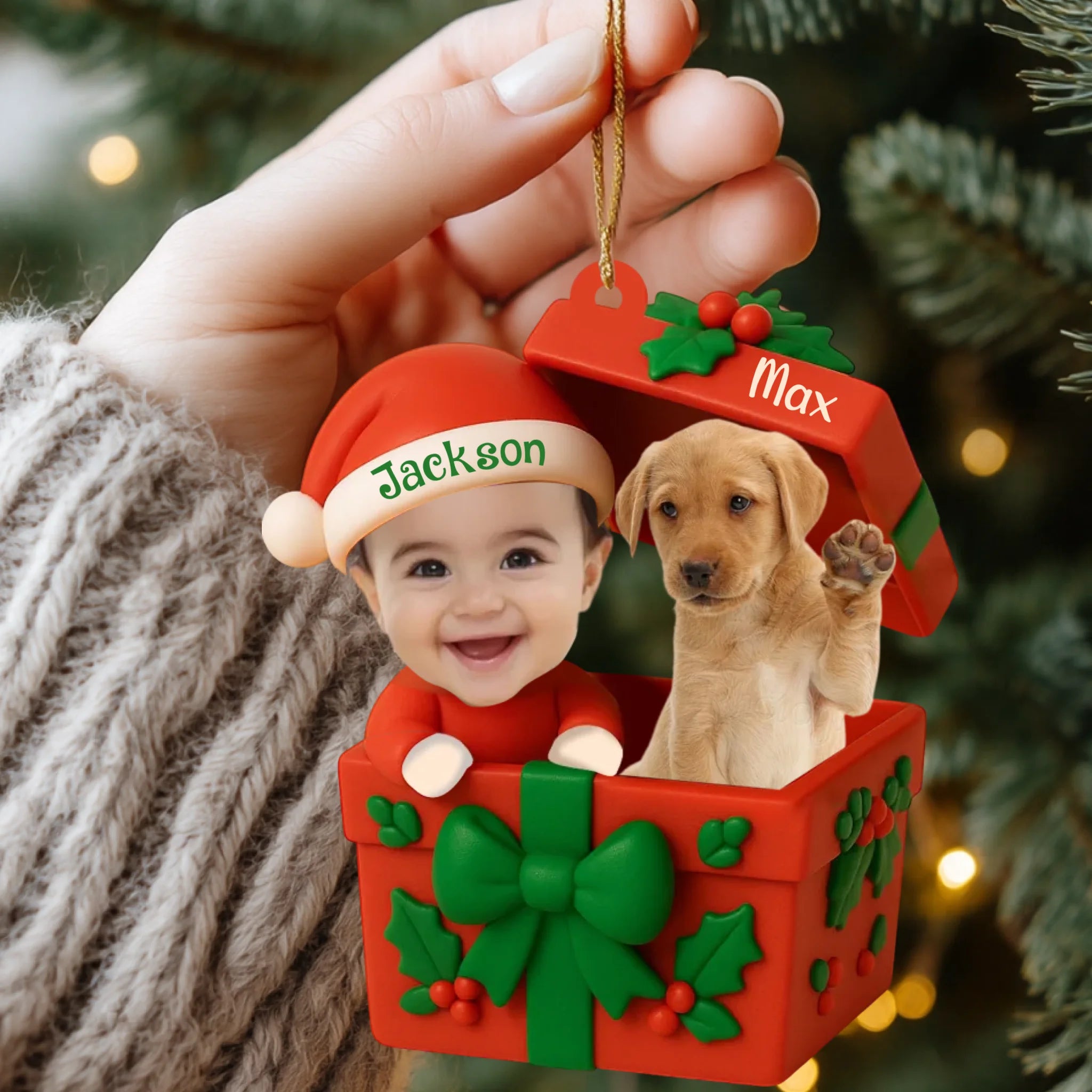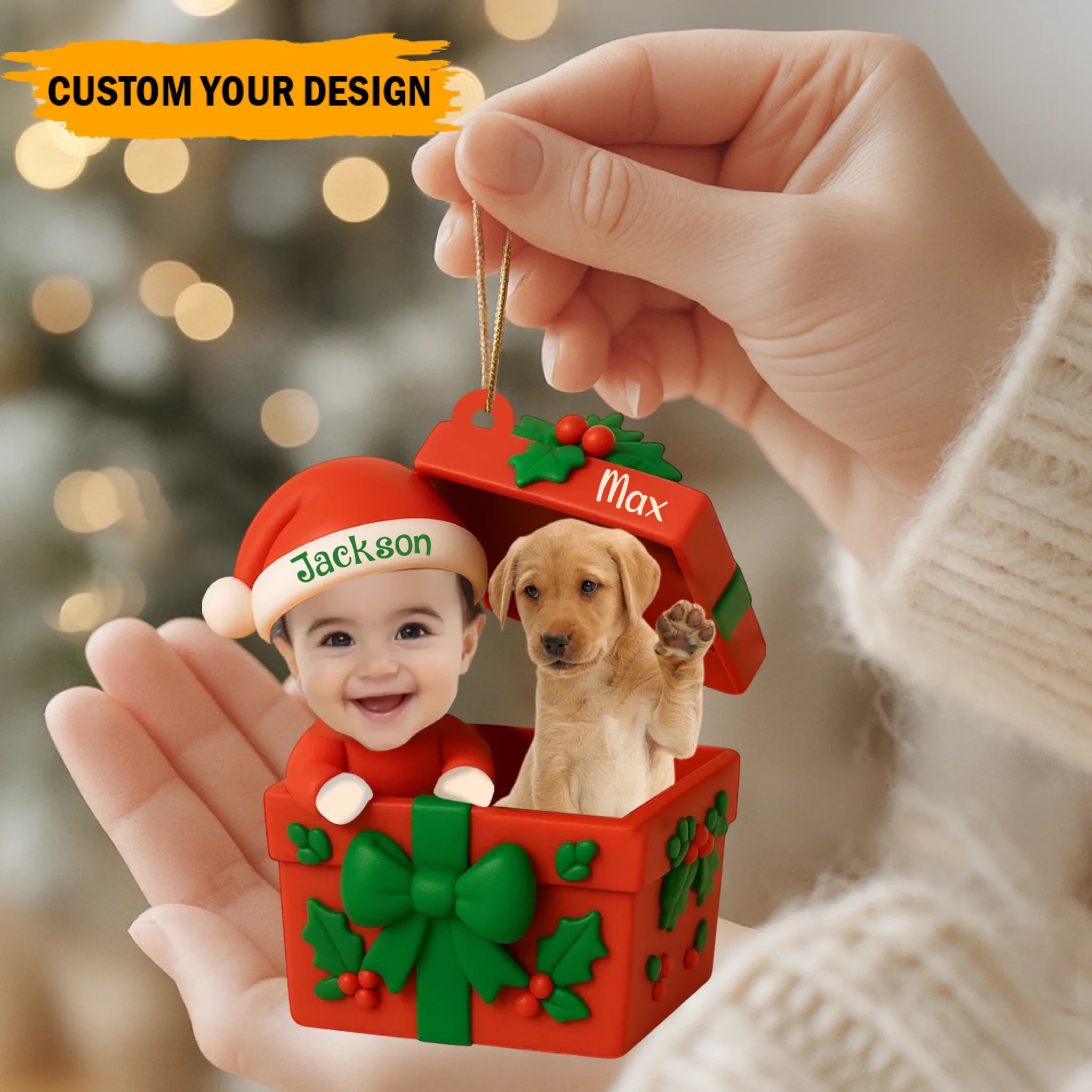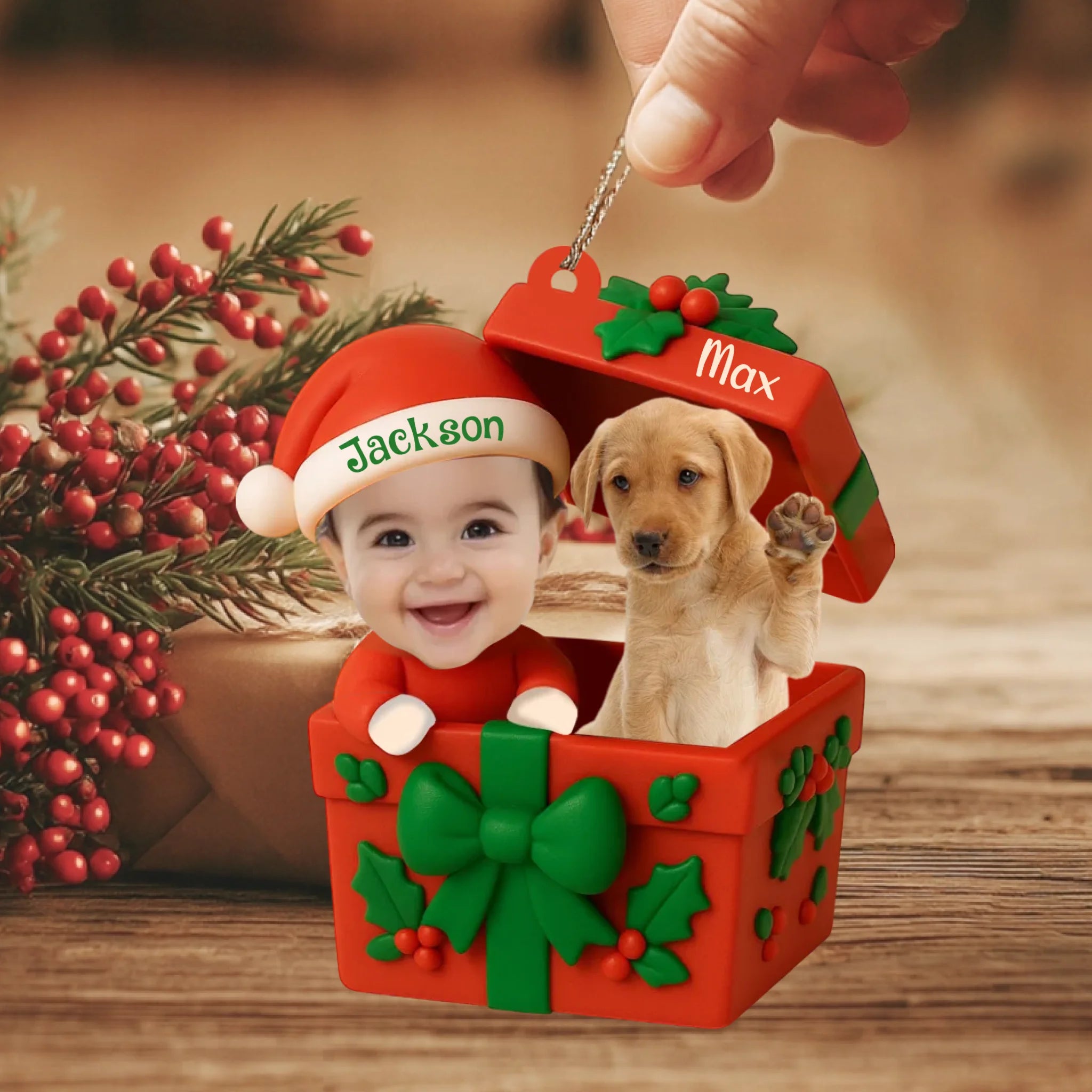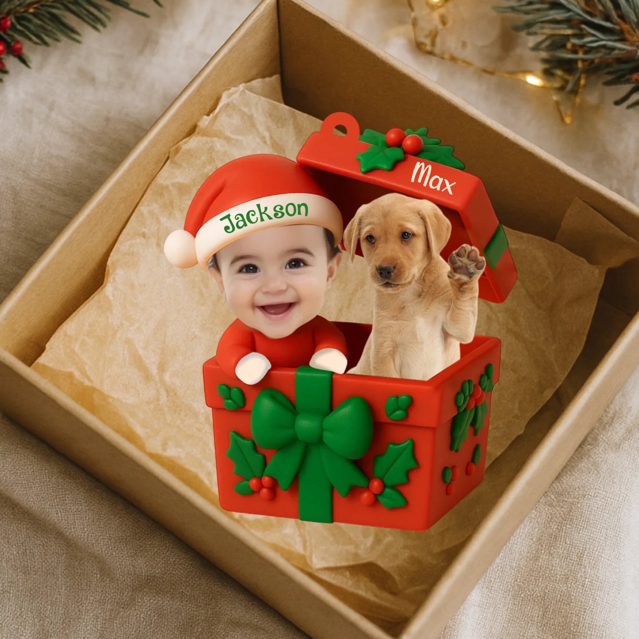 Nuestro Adorno de Acrílico Personalizado para el Primer Navidad del Bebé y la Mascota Es un conmovedor recuerdo que muestra a tu hijo y su cachorro o gatito juntos en un adorable diseño de caja de regalo navideño. Personaliza con ambos nombres para crear un adorno único que traiga alegría a cada árbol de Navidad o espacio de exhibición.