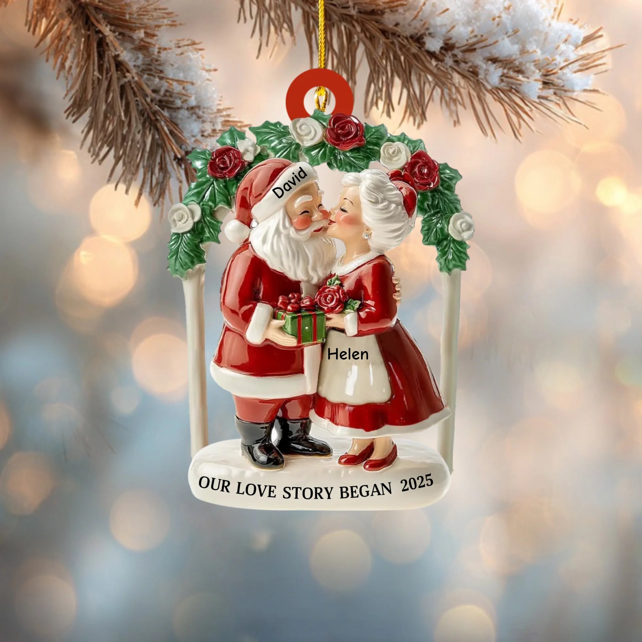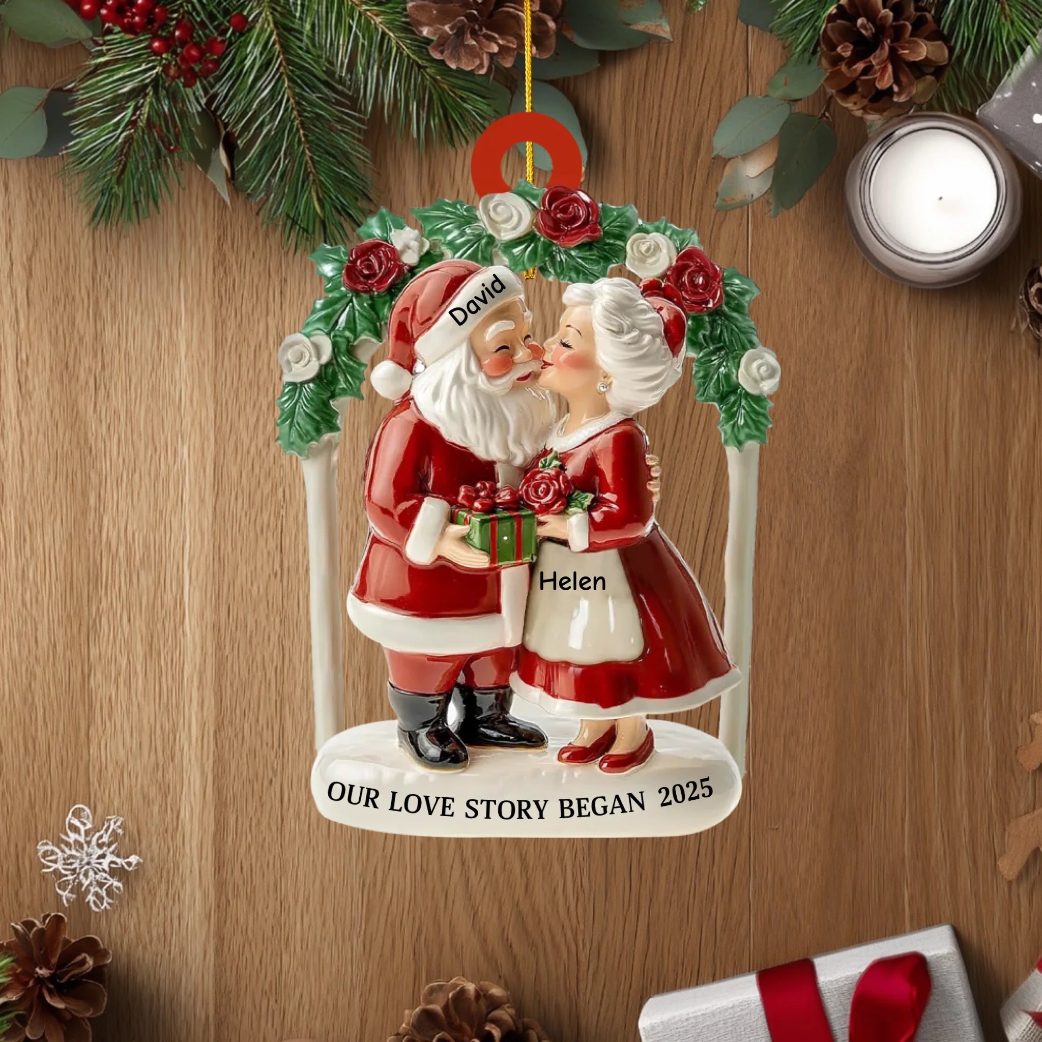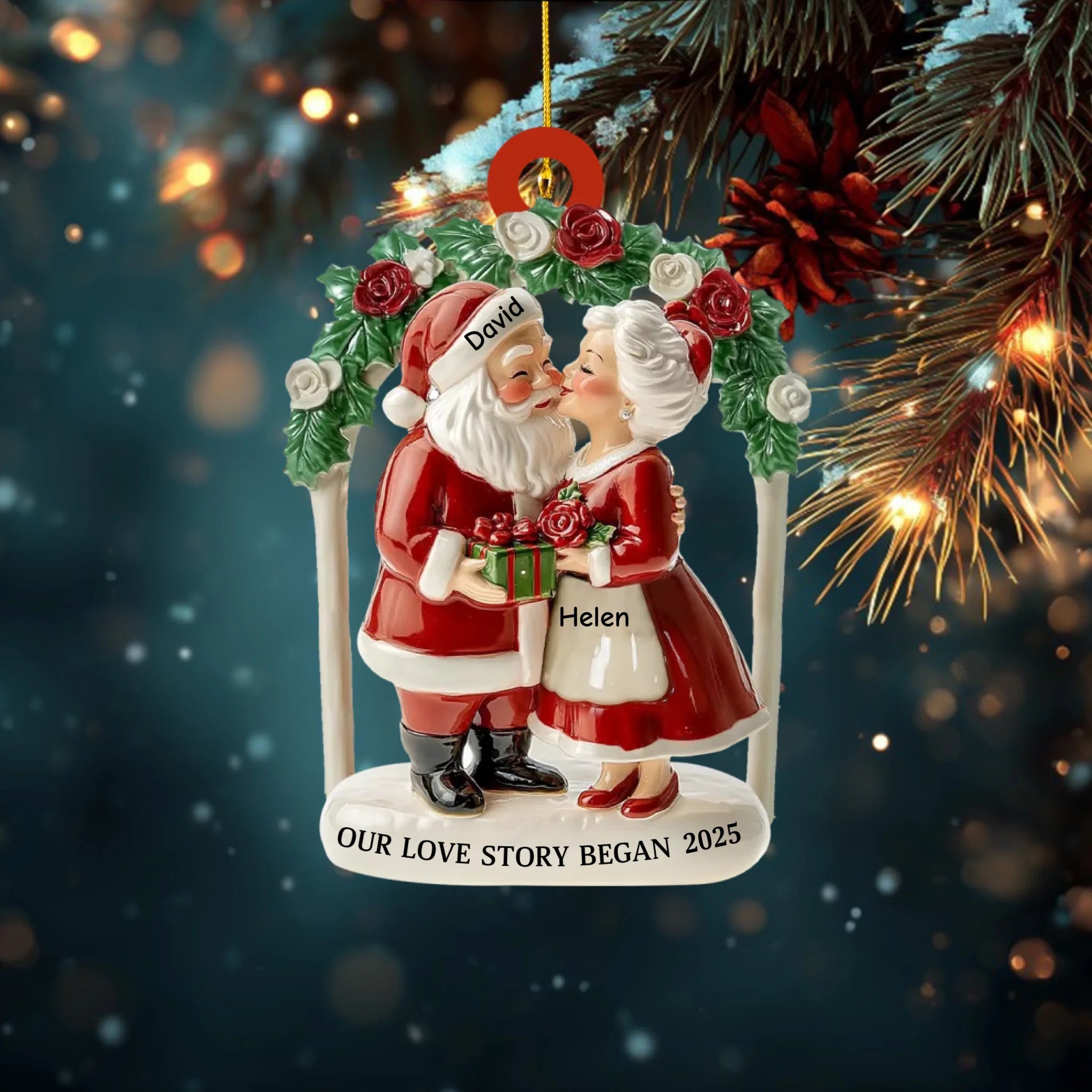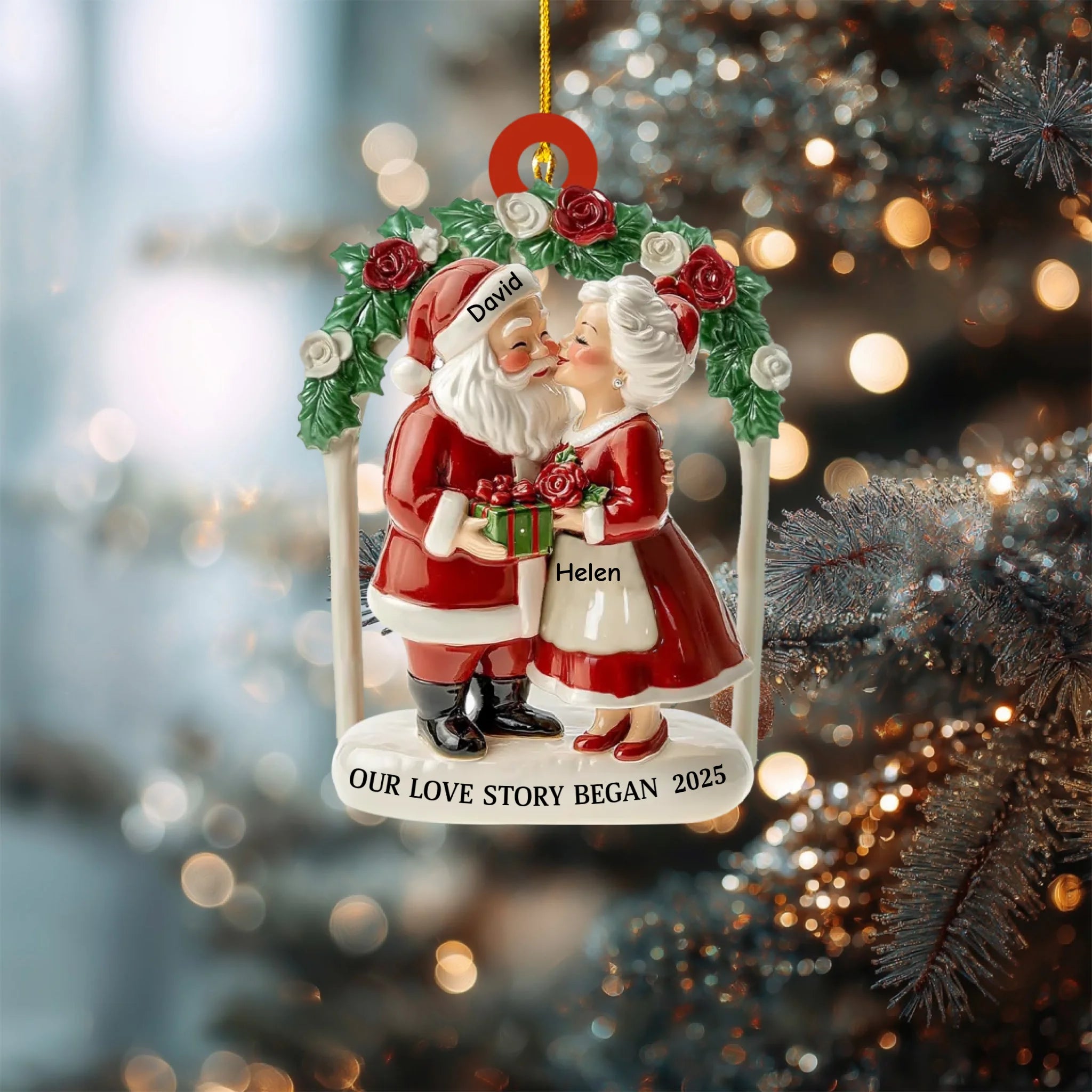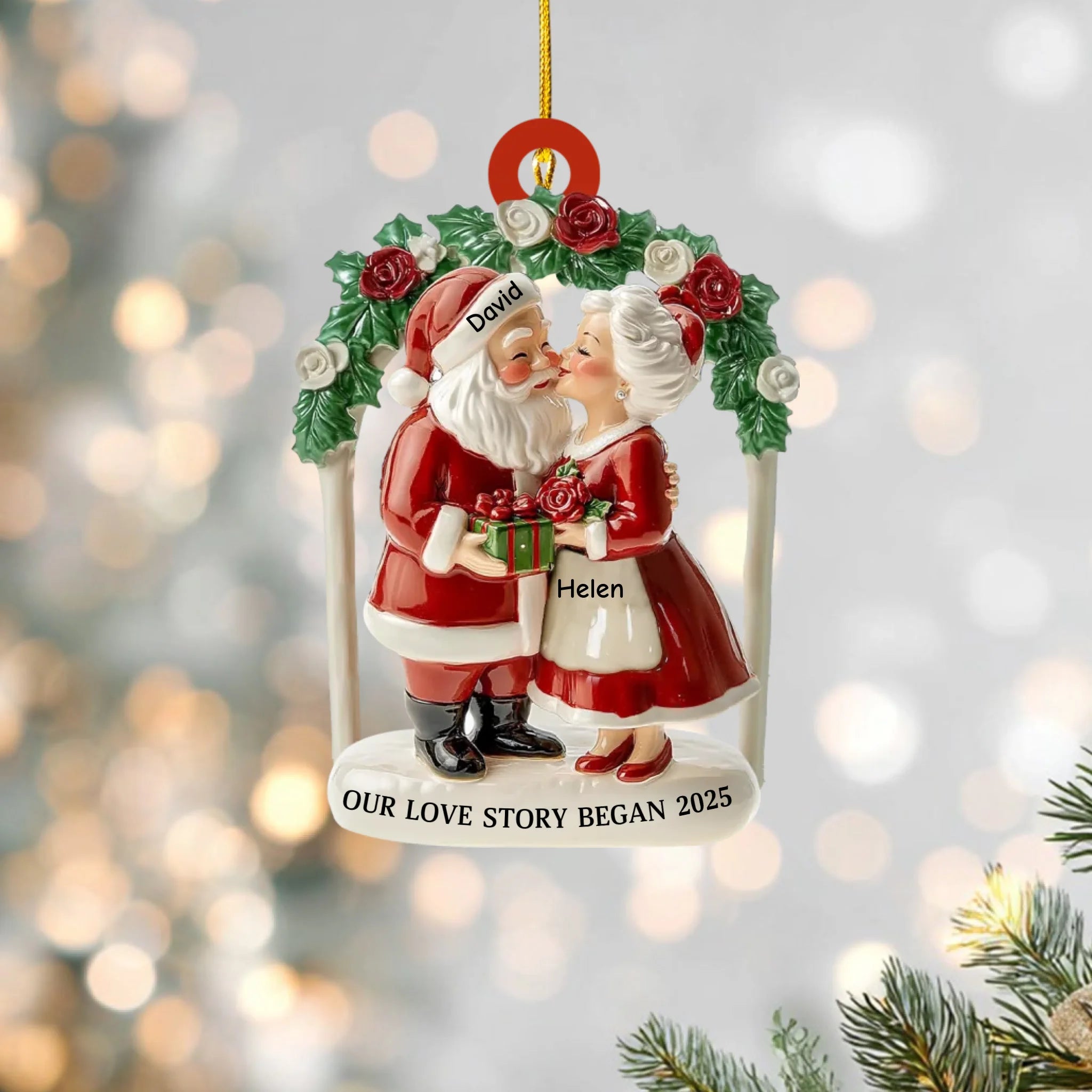Celebrate love and the magic of Christmas with this Personalized Couple Santa Claus Ornament. Featuring a sweet Santa and Mrs. Claus sharing a tender moment under a festive arch of roses, this ornament is a perfect symbol of warmth, togetherness, and lasting love.