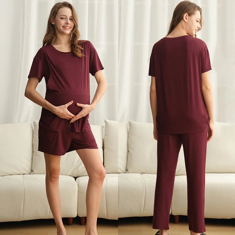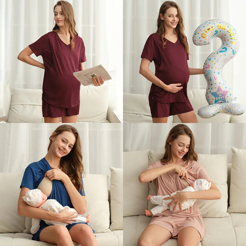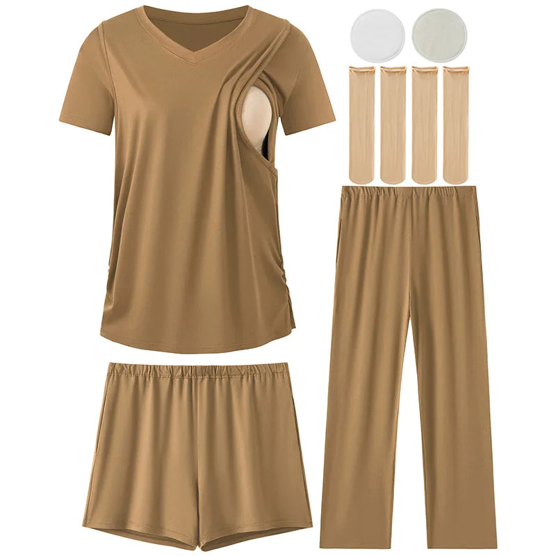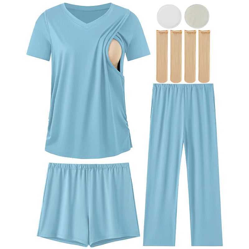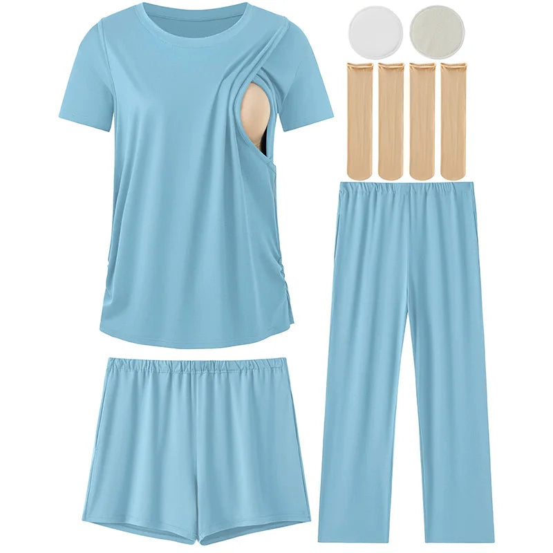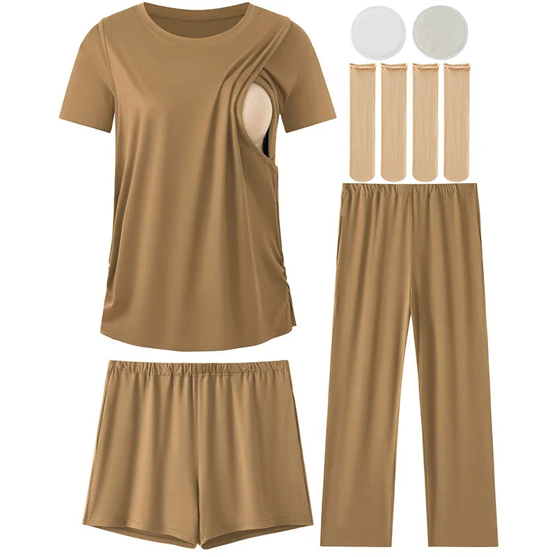 Complete Multi-Piece Set – Includes 1 short-sleeve nursing top, 1 pair nursing shorts, 1 pair long maternity pants, 2 nursing nipple pads, and 2 pairs of maternity socks.