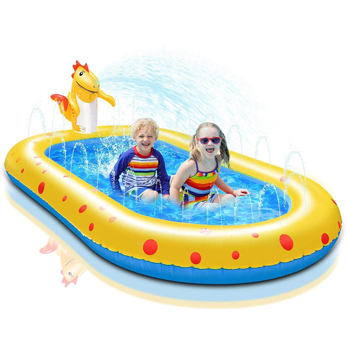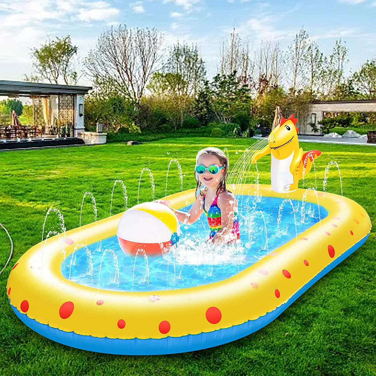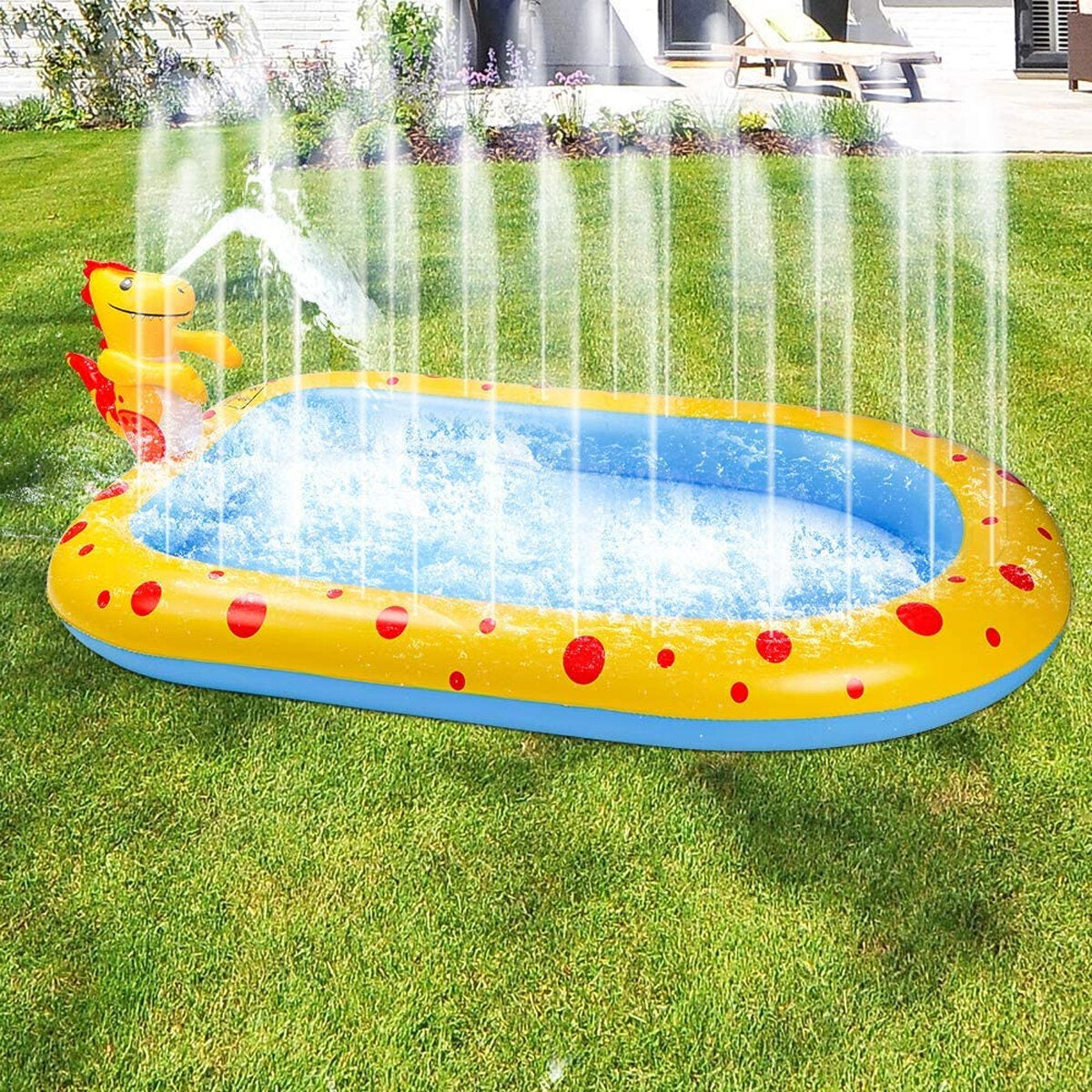 - Piscina inflable 3 en 1: No te pierdas la diversión acuática del verano con una piscina con aspersor inflable, que combina una piscina de juegos para niños y un tapete salpicador. Simplemente conéctala a una manguera de jardín, llénala de agua y úsala como tina de bronceado o piscina poco profunda. Deja que la cabeza de dinosaurio y el borde de la piscina rocié agua ajustando la presión del agua.