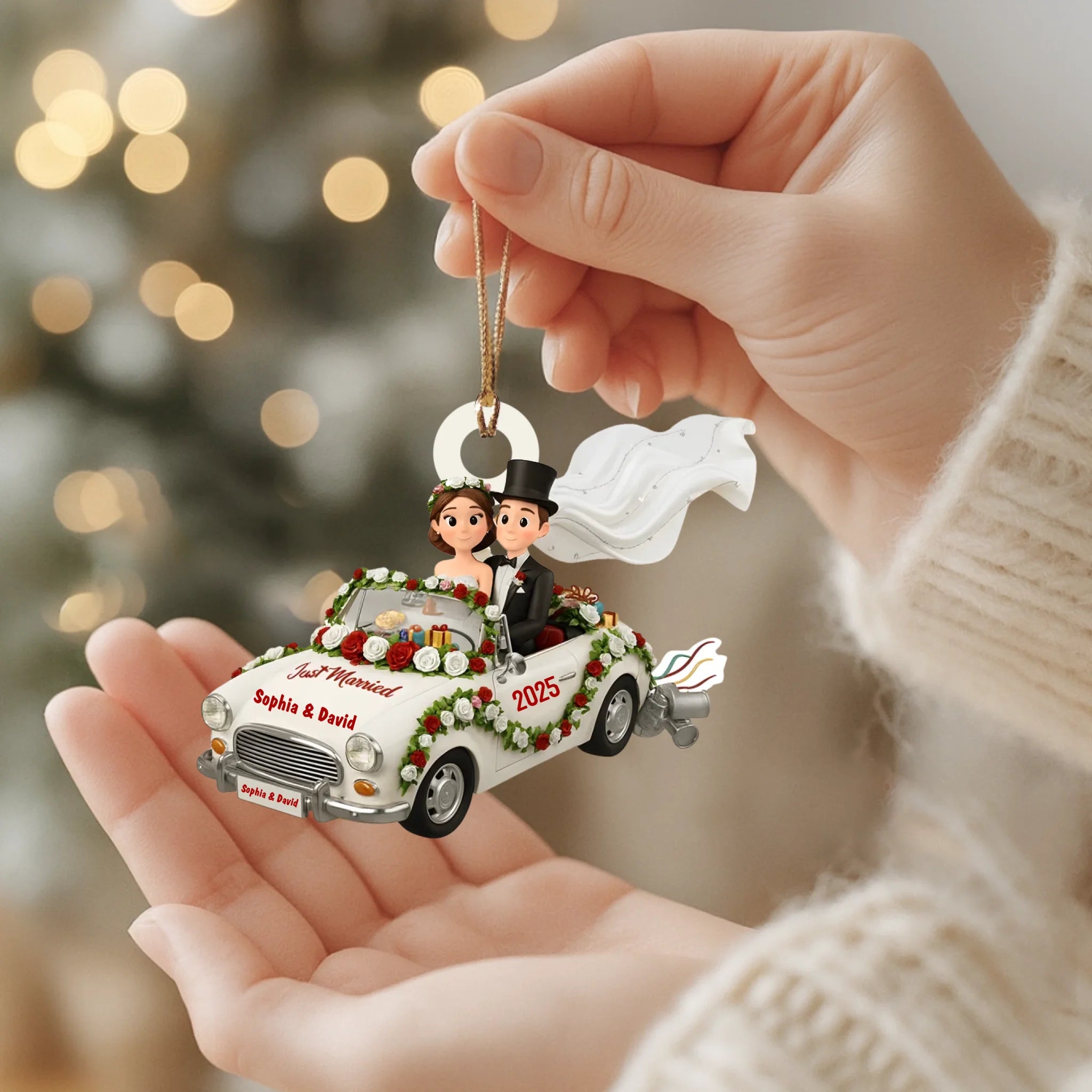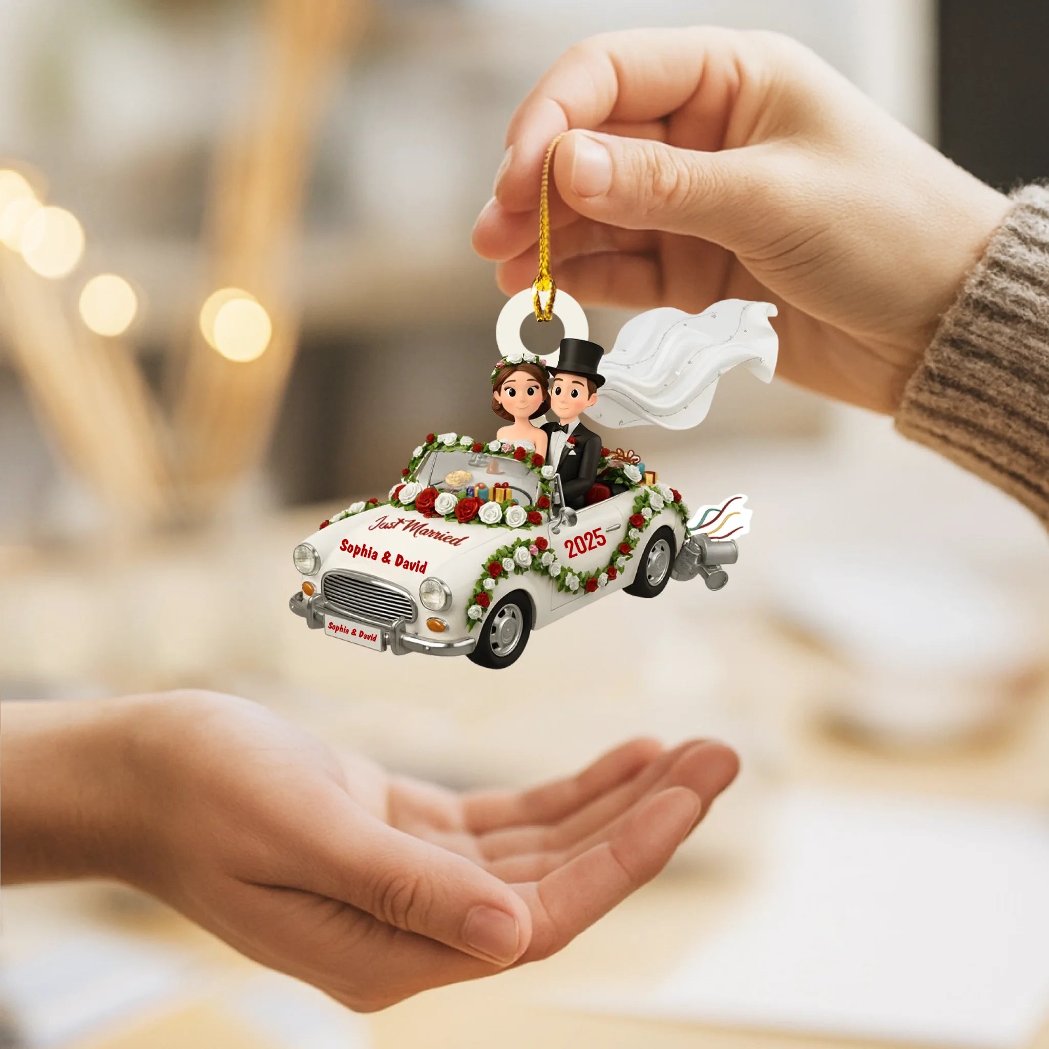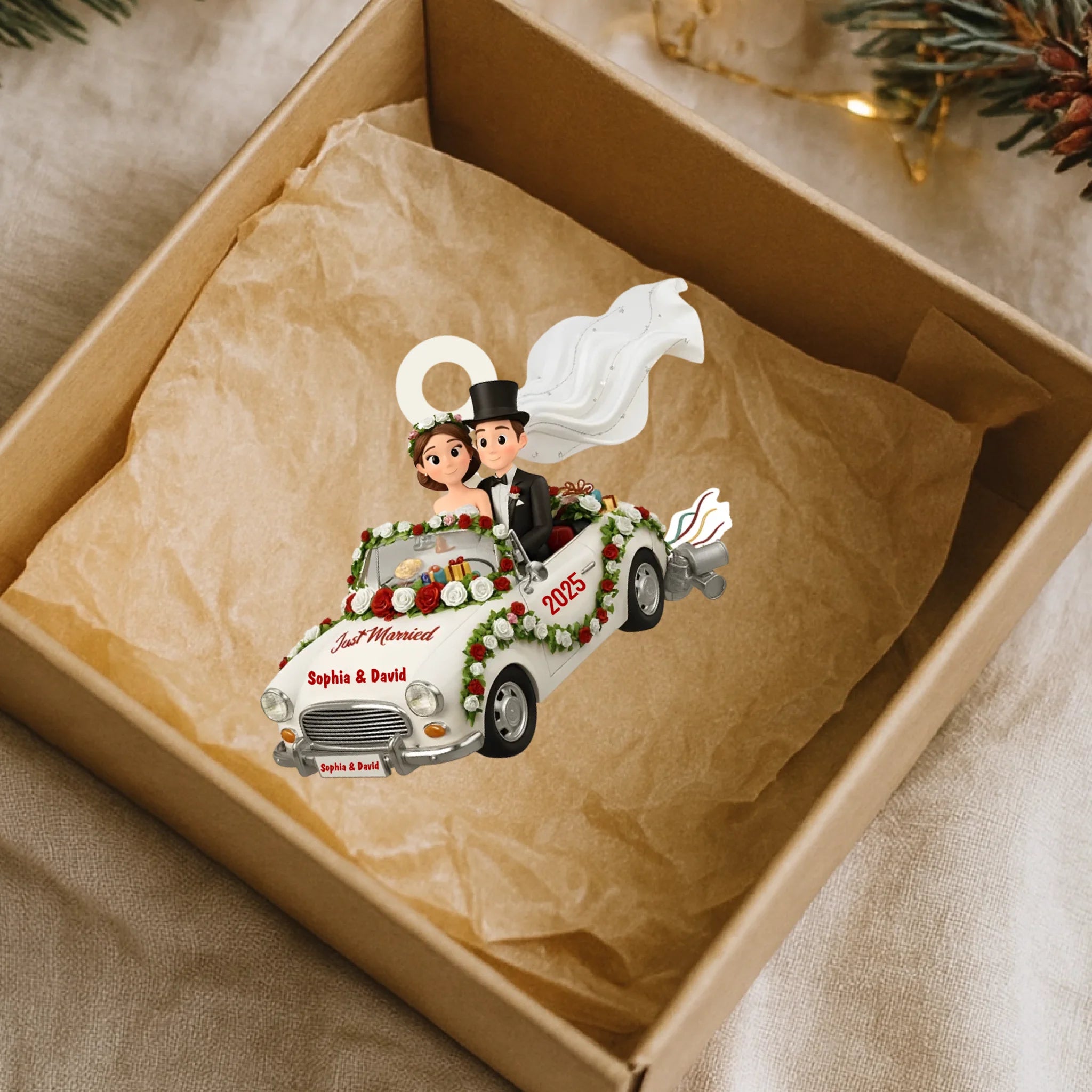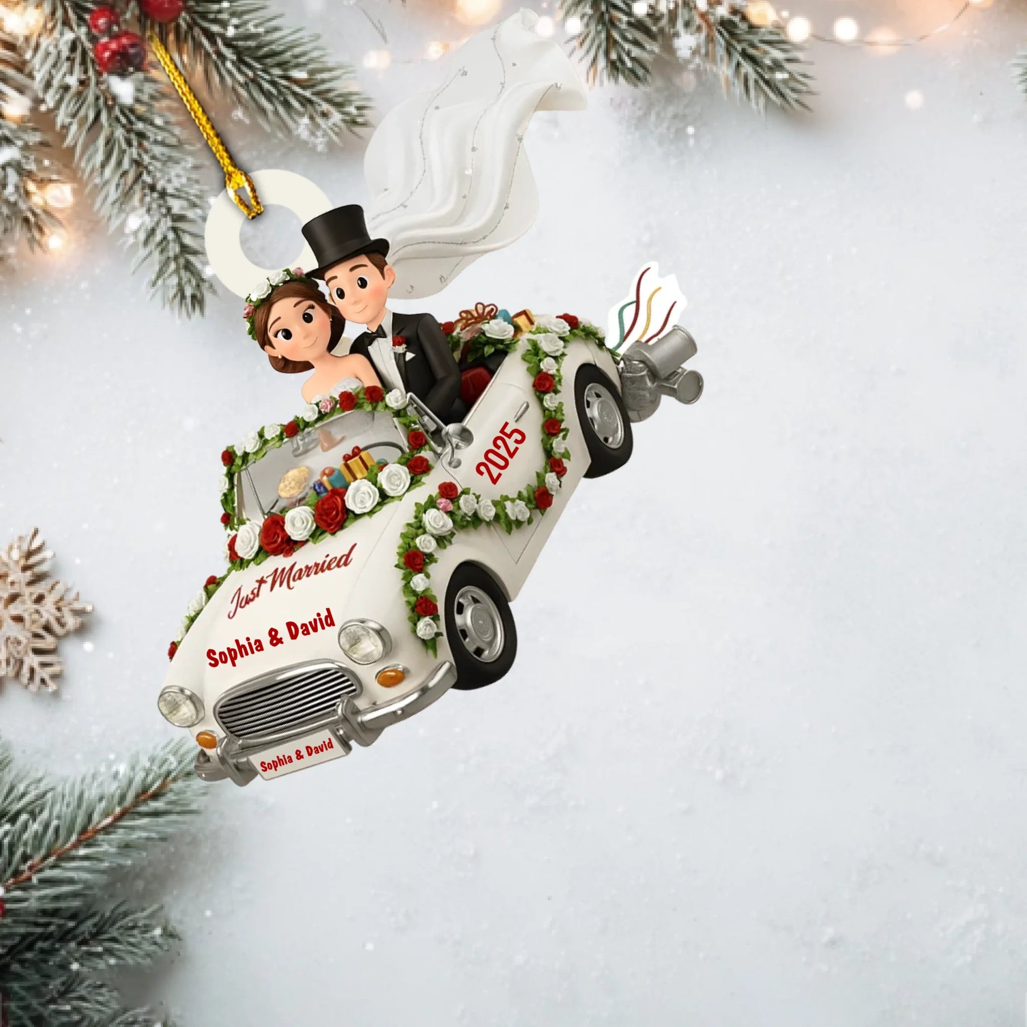 Decorative ornament of a bride and groom in a wedding car with 'Just Married' and '2025' text, against a blurred festive background.