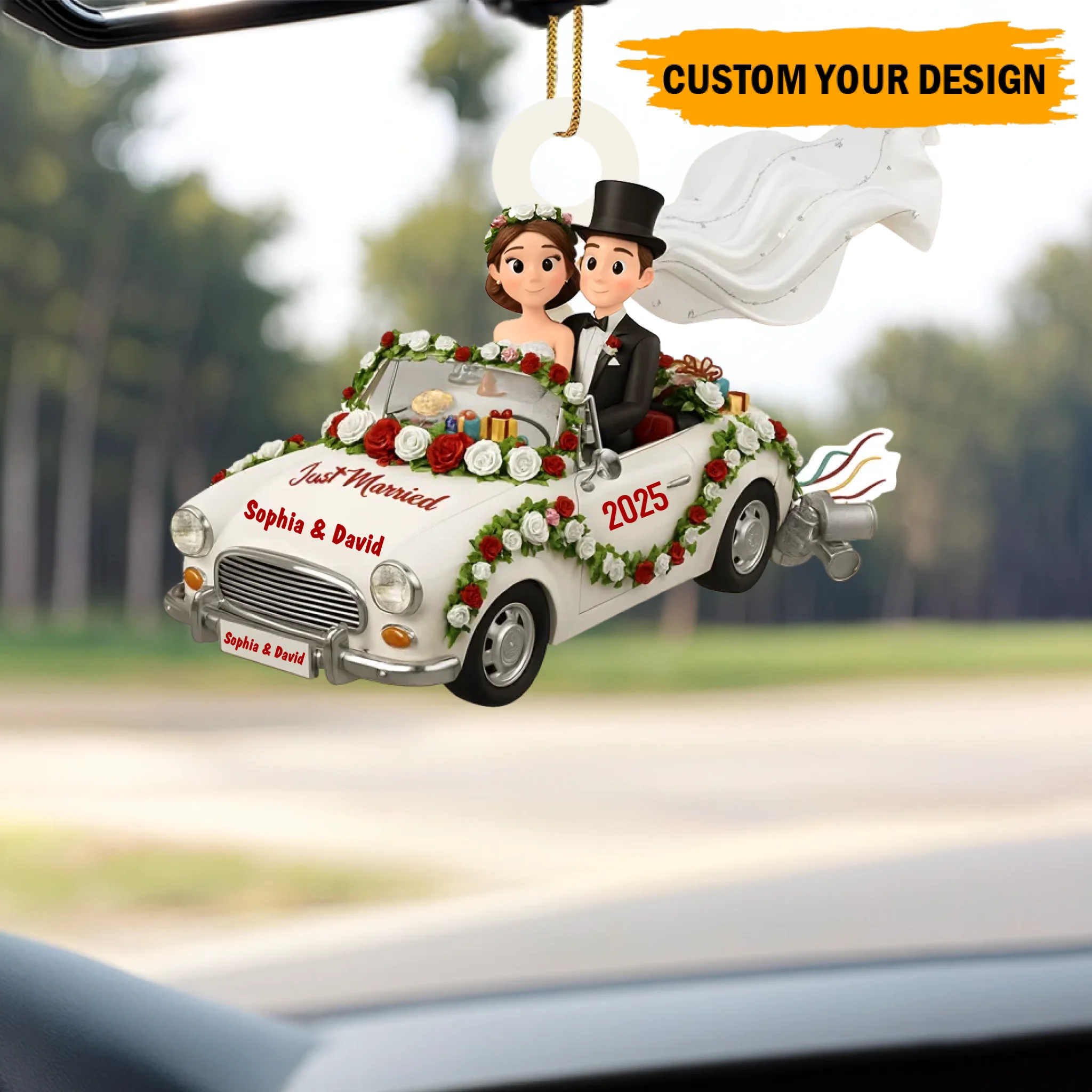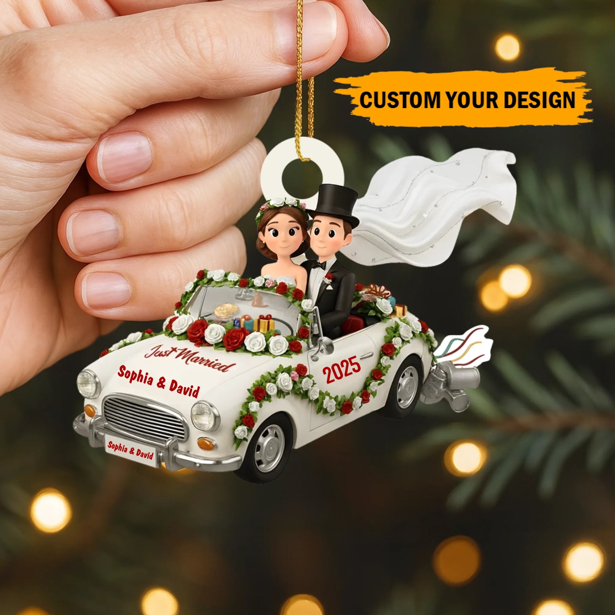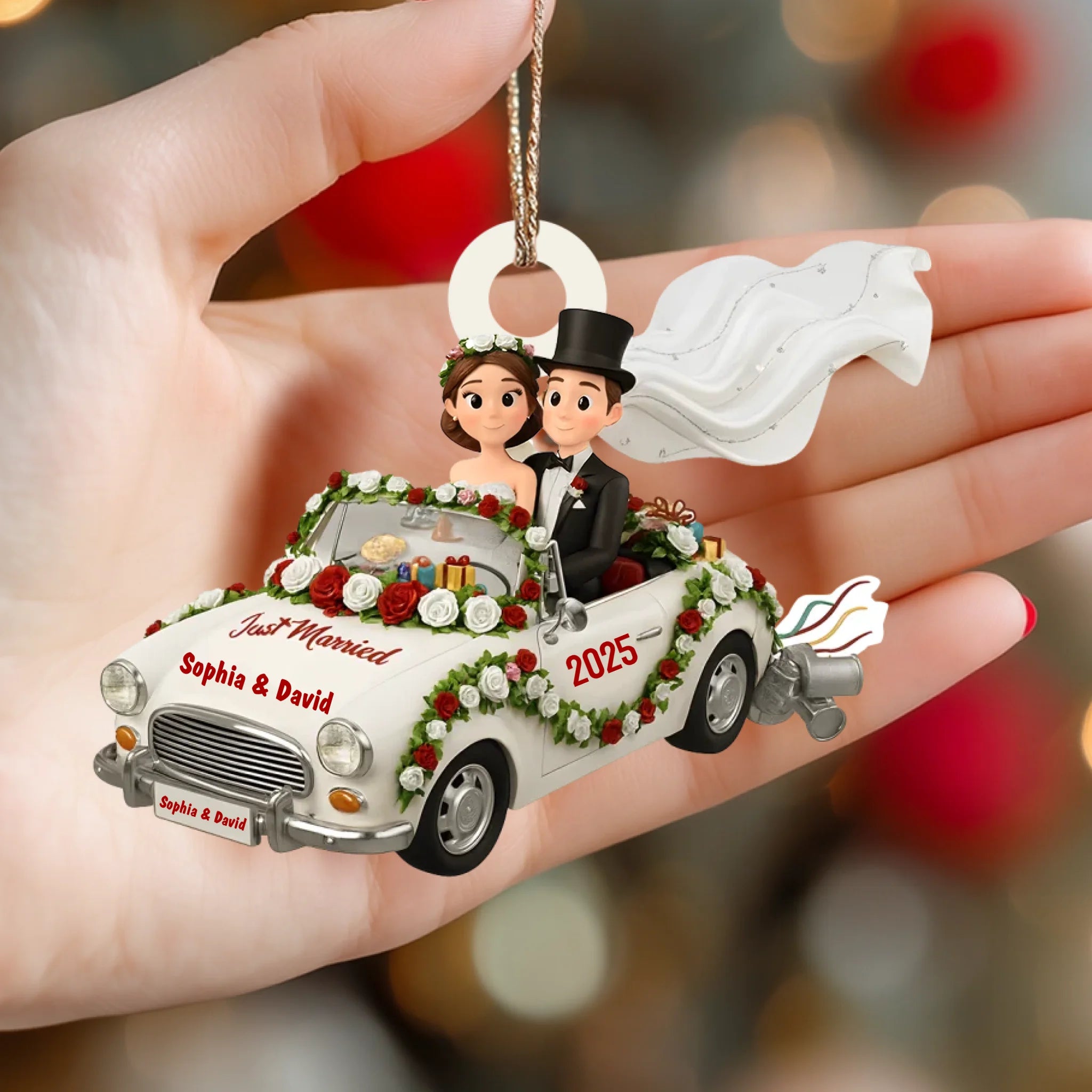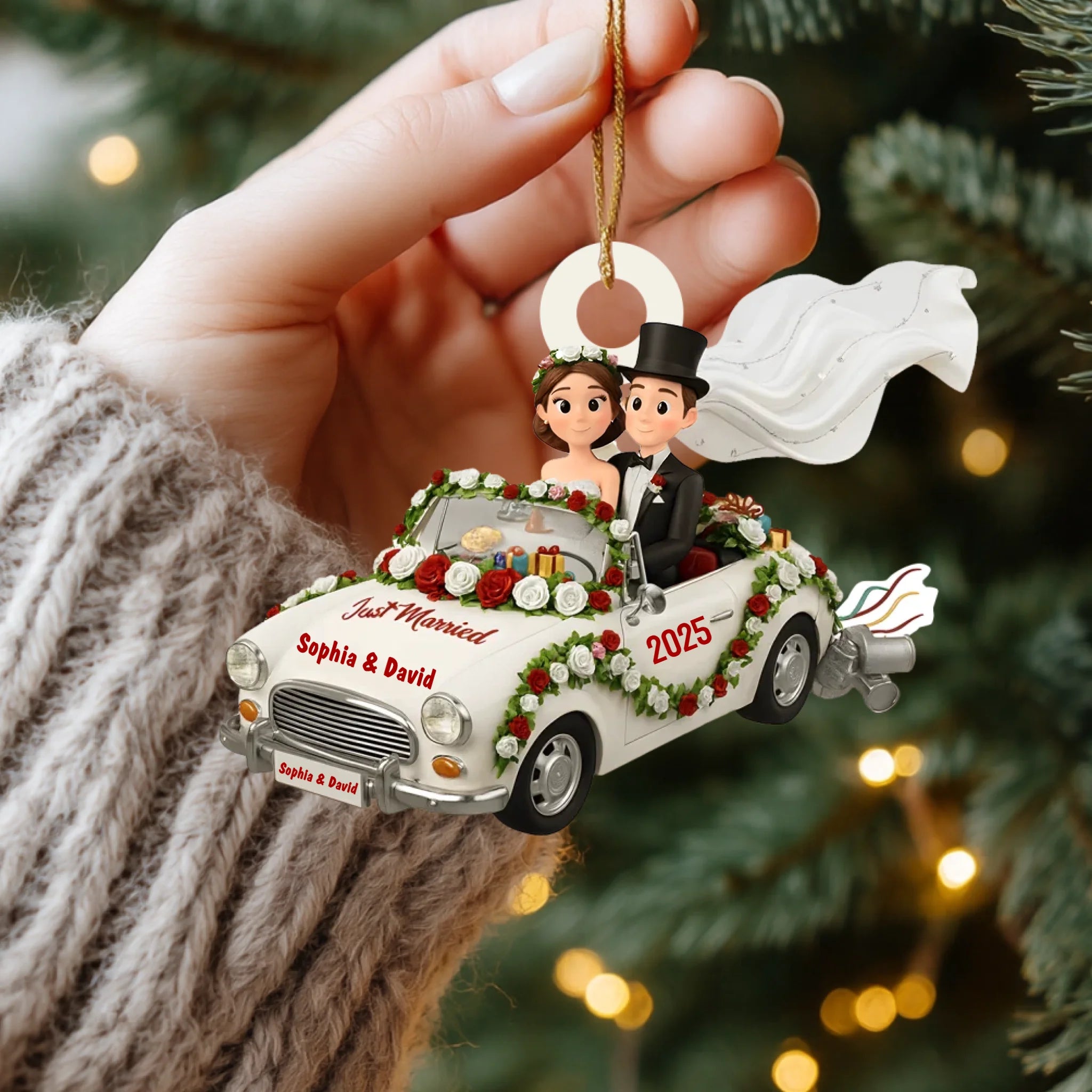 Decorative ornament of a bride and groom in a wedding car with 'Just Married' and '2025' text, against a blurred festive background.