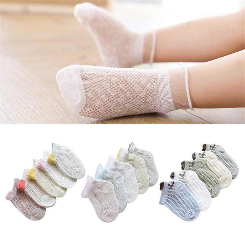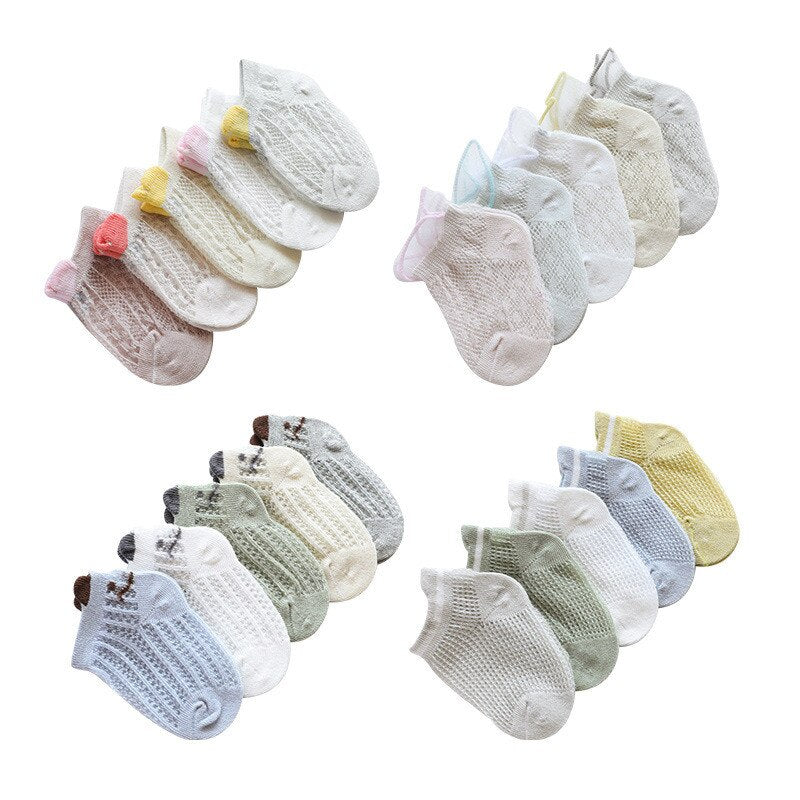 El suave material de algodón con tejido de malla garantiza que el niño no sude, por lo que es especialmente adecuado para que los recién nacidos lo lleven mientras duermen, para evitar los pies fríos o para llevarlo cuando usan zapatos. 1 juego incluye 5 pares para que la mamá elija libremente.