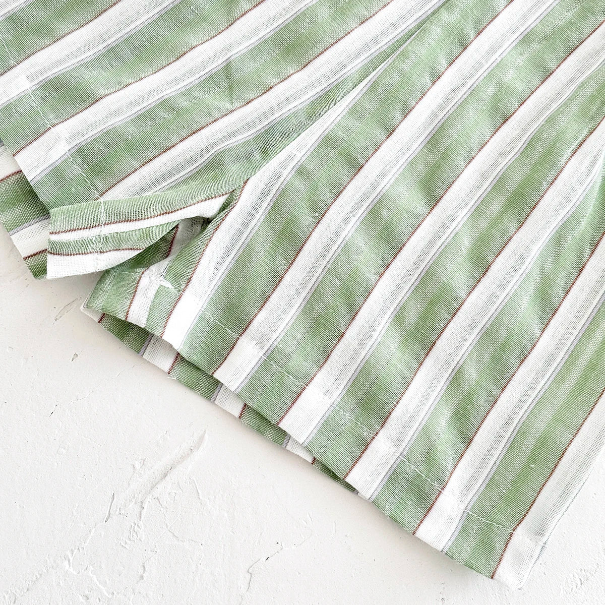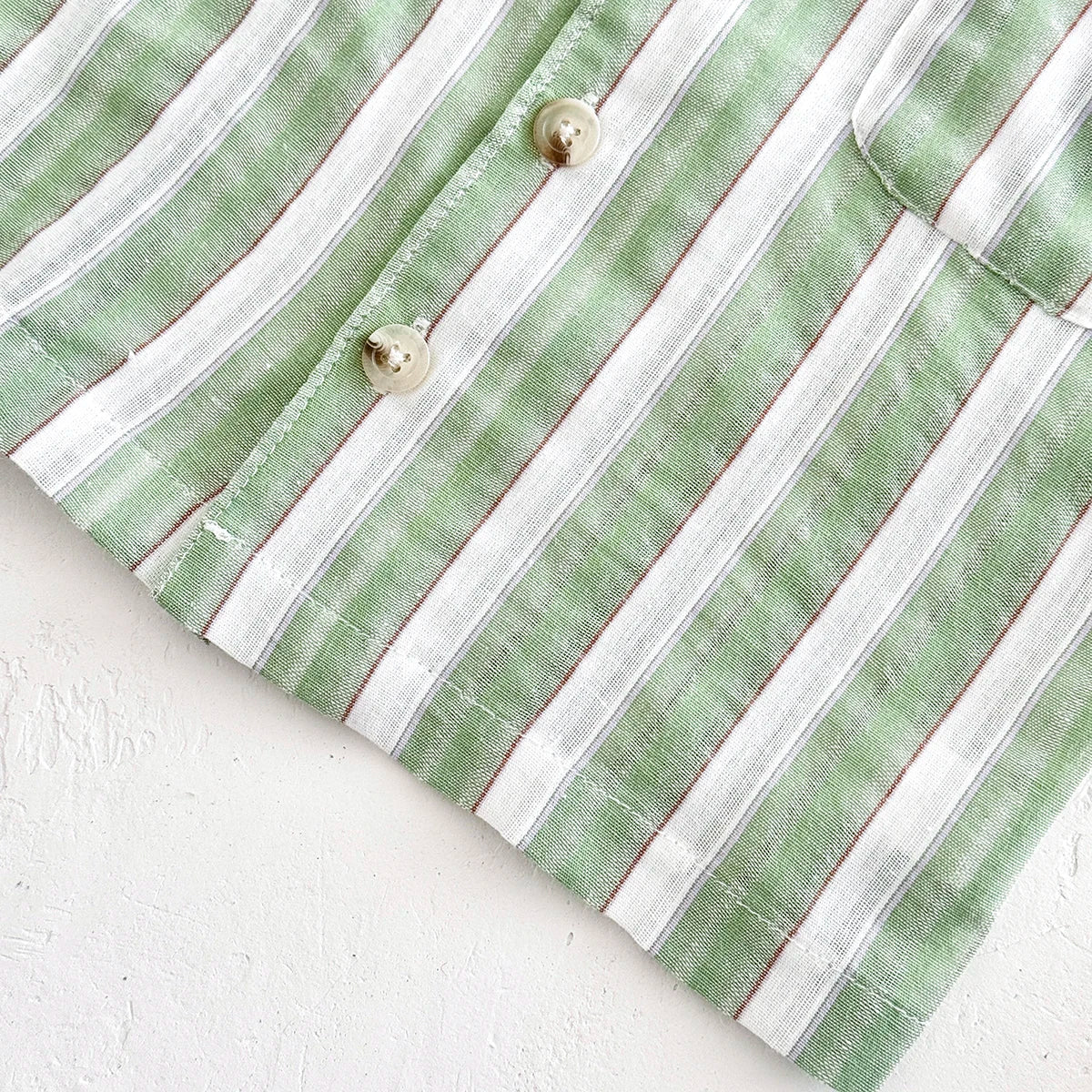 Confeccionado con tejido suave y transpirable, este conjunto garantiza comodidad durante todo el día y un aspecto elegante. El diseño clásico de rayas verdes y blancas aporta un aire fresco y moderno, mientras que el detalle del bolsillo y estilo de botones añade un toque de sofisticación, ¡como un conjunto de mini vacaciones!