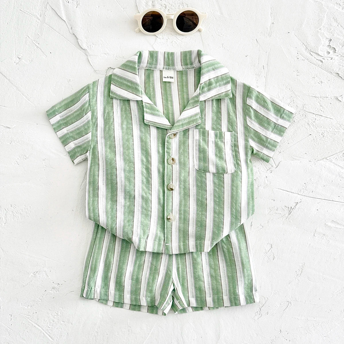 Set de Verano para Recién Nacidos Niños y Niñas | Camisa con Solapa de Rayas Verdes + Conjunto de Pantalones Cortos (6M-3T)