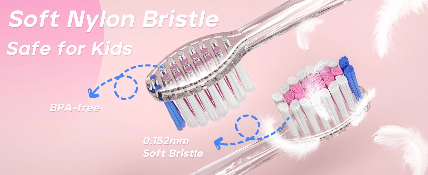 Cerdas suaves para una limpieza cuidadosa : el cabezal del cepillo de dientes está equipado con cerdas suaves hechas de silicona, lo que garantiza una limpieza suave que protege el esmalte dental de su hijo. Los mangos están fabricados con materiales ABS y TPE aptos para alimentos, lo que garantiza seguridad y durabilidad.