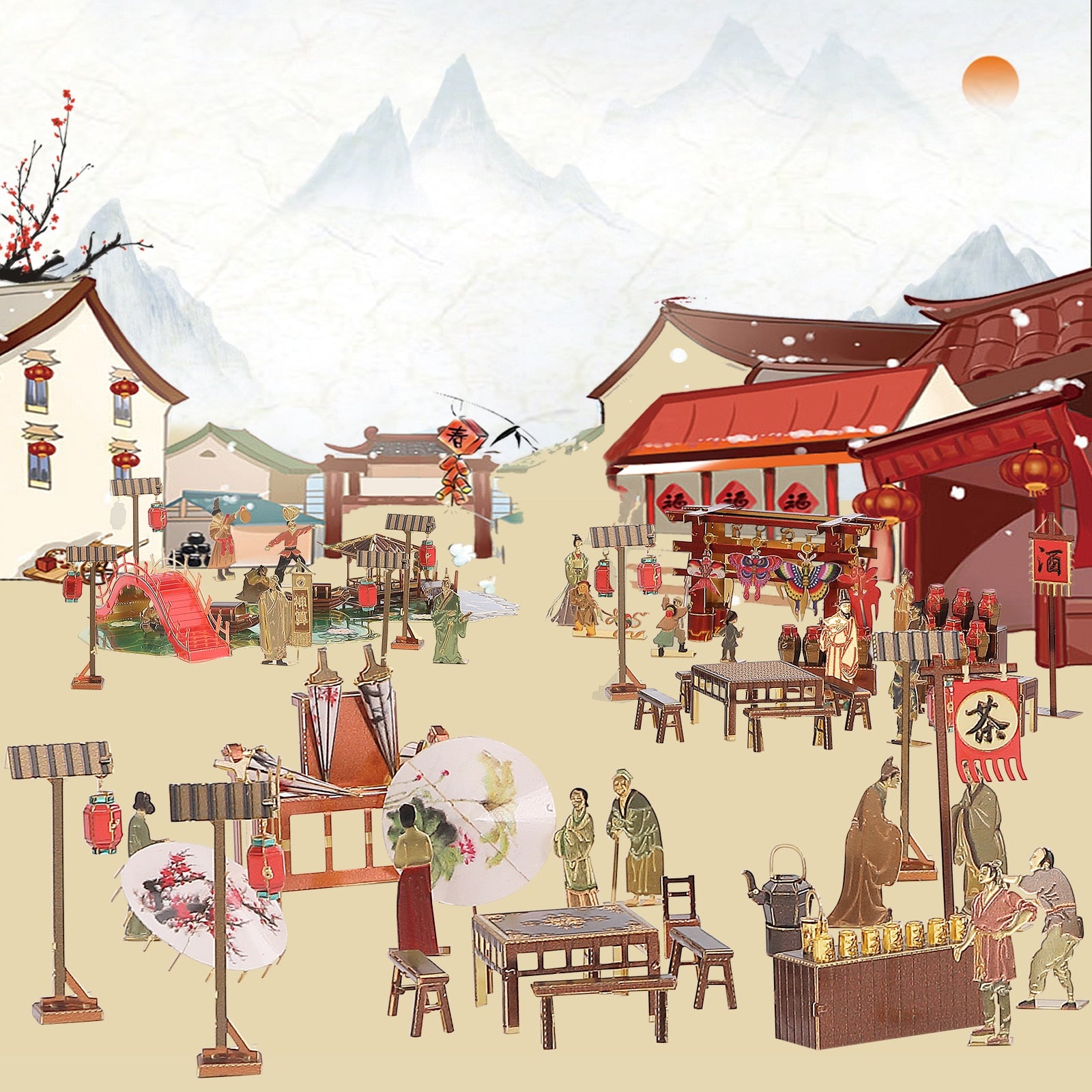 El modelo de ensamblaje de metal 3D del paisaje de la dinastía Tang simula la escena del mercado de personas en la China de la dinastía Tang. Diseño con mucho detalle y colores nítidos y nítidos. Pasa un buen rato instalándolo.