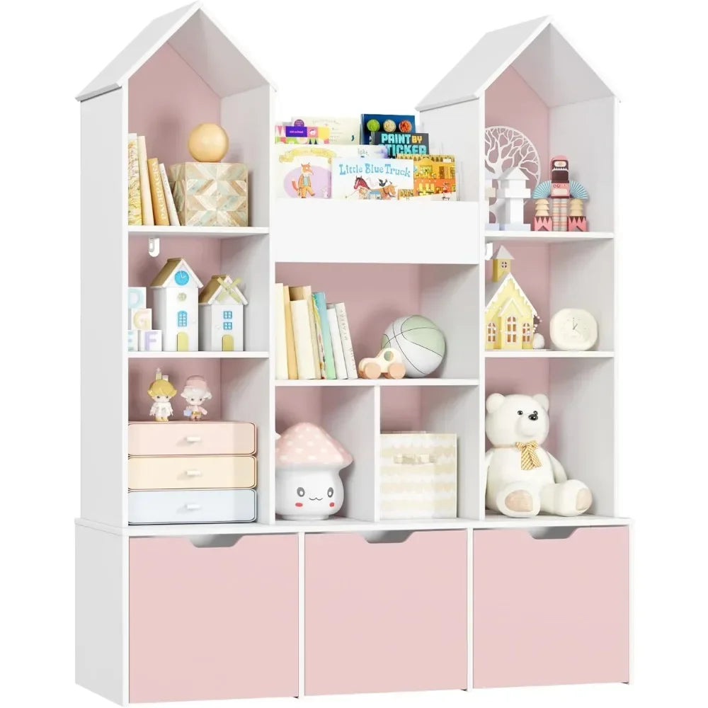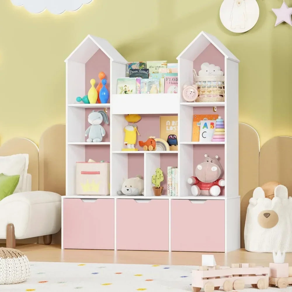 Organizador de almacenamiento de juguetes para niños con techo de castillo – Librero casita de muñecas grande con 3 cajones rodantes y 9 compartimentos abiertos