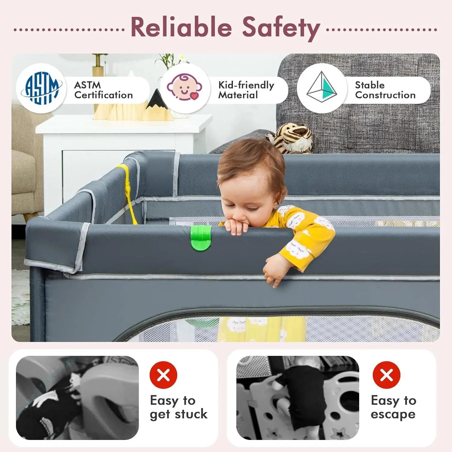 Construido de tela Oxford 210D impermeable de doble grosor, seguro y transpirable para la piel de tu bebé. El marco interno está completamente envuelto para evitar lesiones, y ventosas antideslizantes mantienen el corral de juego firmemente en su lugar, incluso en pisos lisos. -
