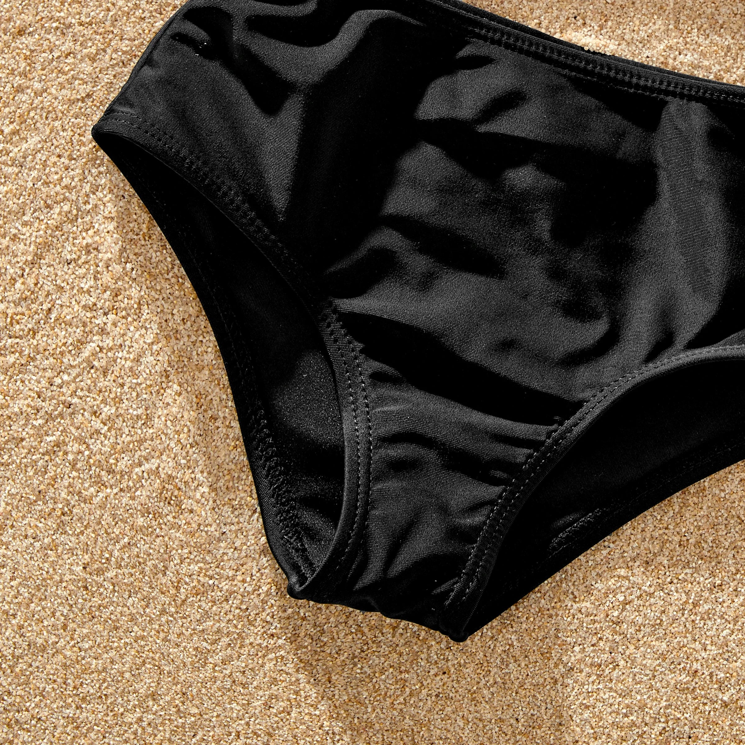 Características principales : cada conjunto incluye bañadores para hombres y niños, un bikini de dos piezas para mujeres y niñas y una falda tipo pareo opcional. El bañador tiene cordones ajustables y una cinturilla negra, mientras que el bikini tiene mangas con volantes para las niñas y cuello en V para las mamás. La falda pareo para mujer está adornada con borlas negras, añadiendo un toque de elegancia a tu look playero.