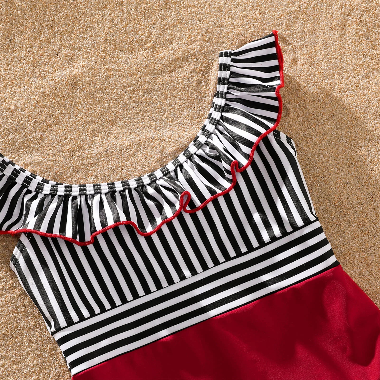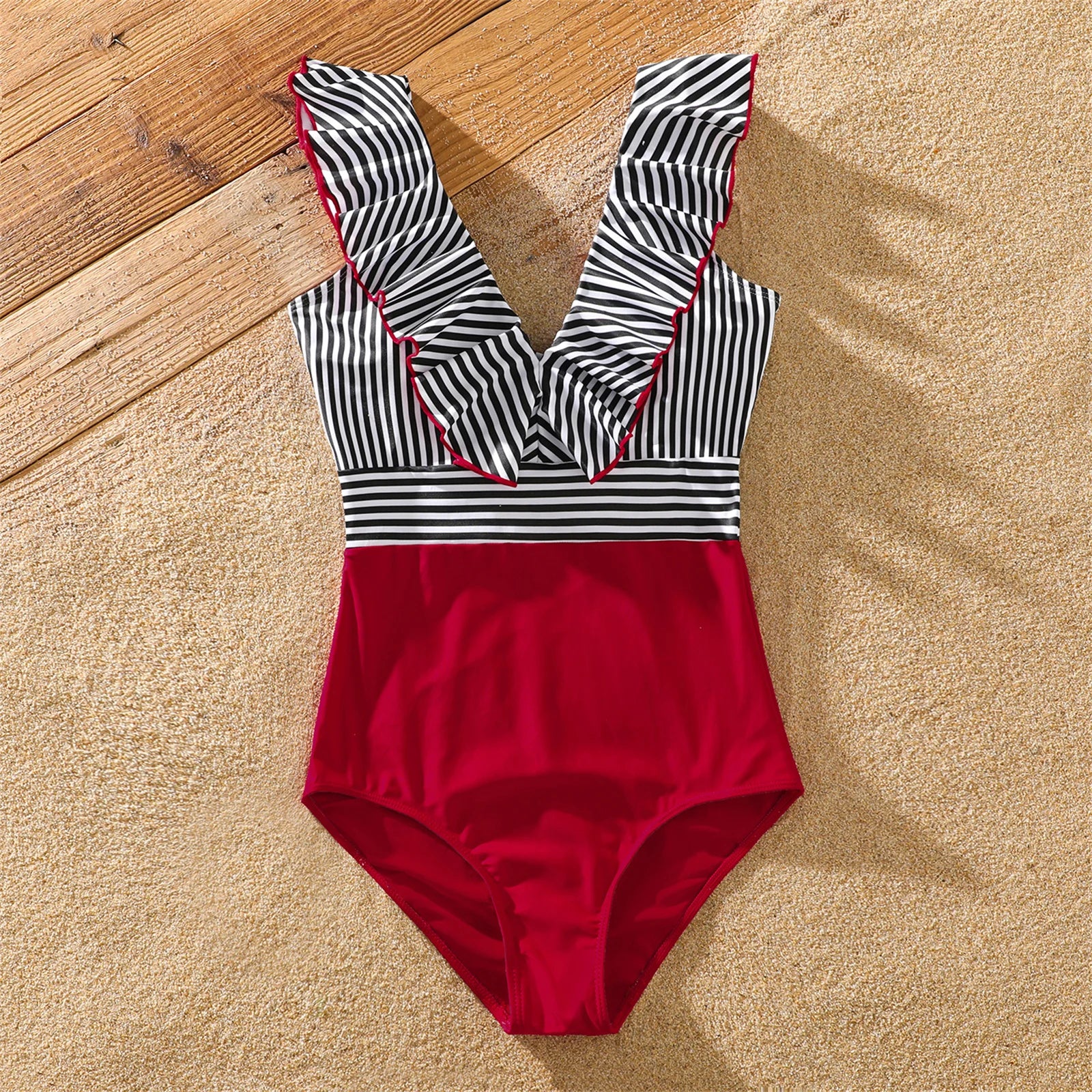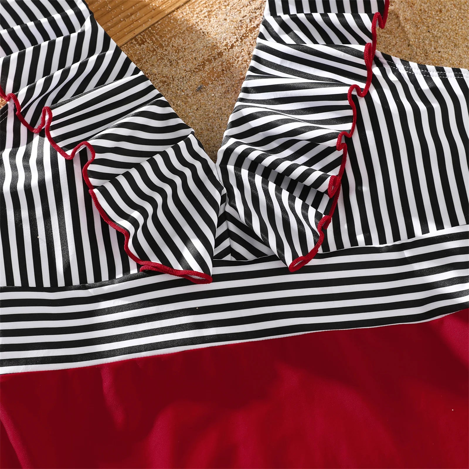 - Diseño de rayas: elegantes pantalones cortos de natación a rayas y traje de baño de una pieza con detalle de empalme de volantes.