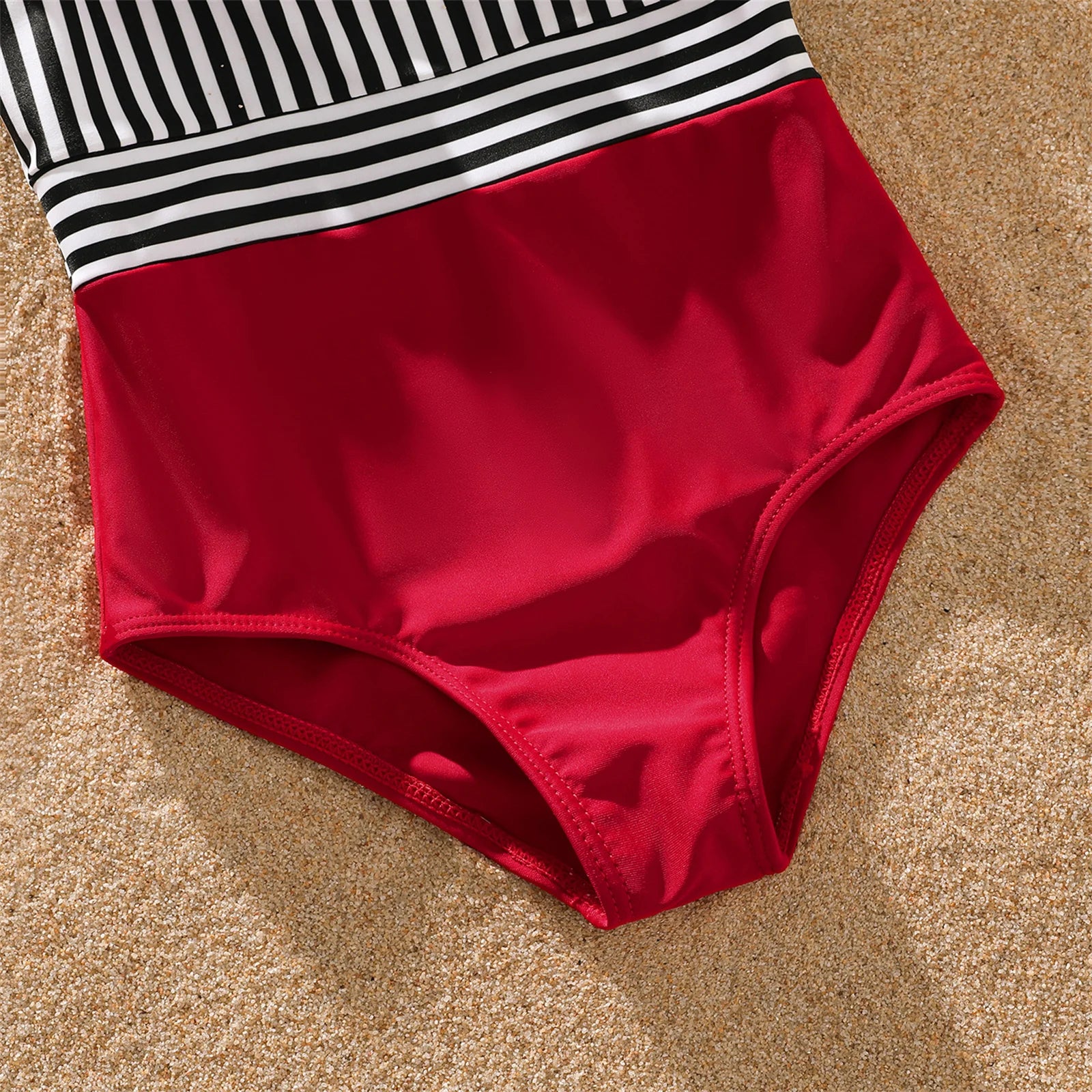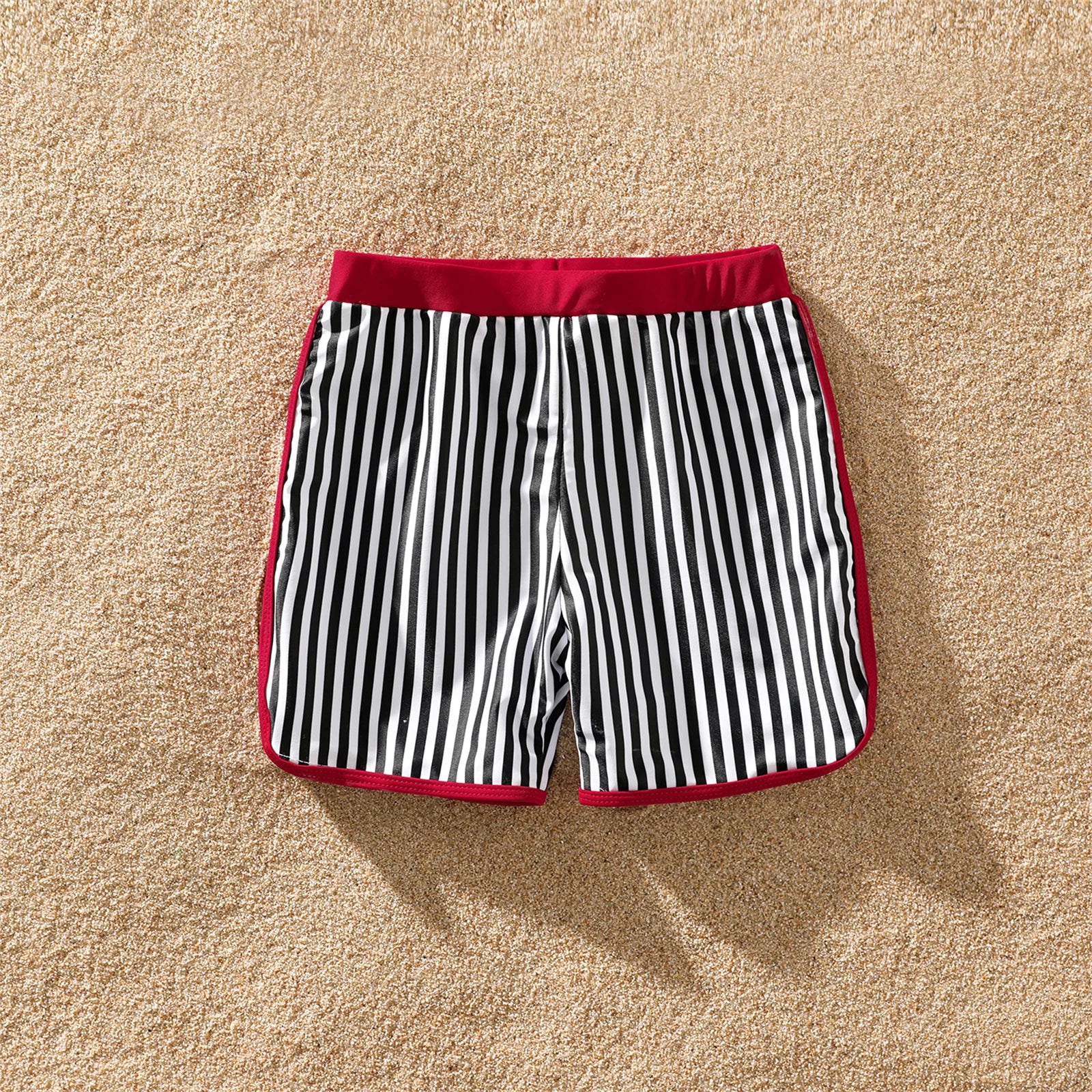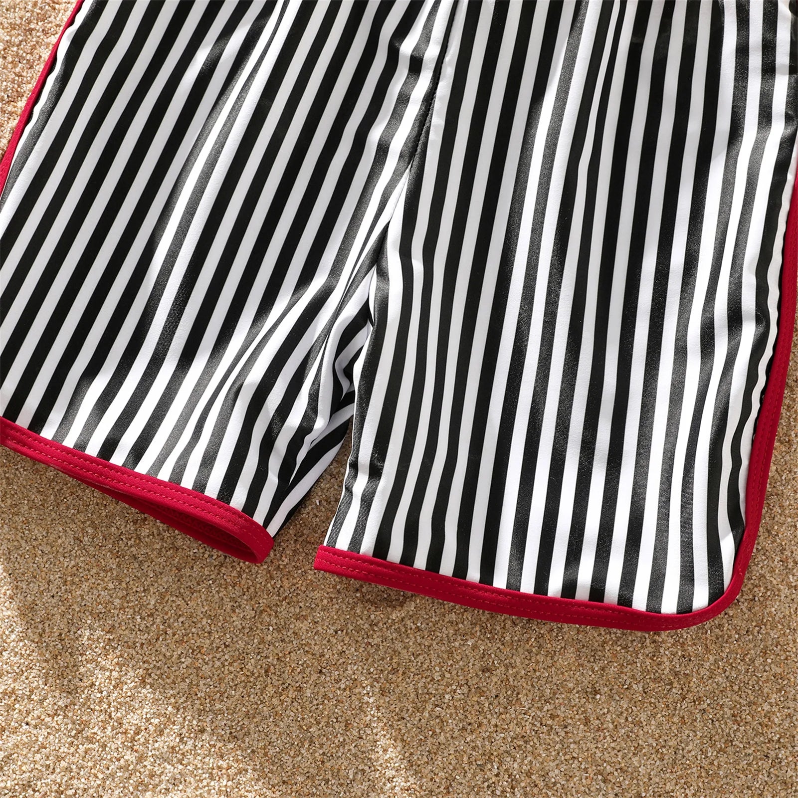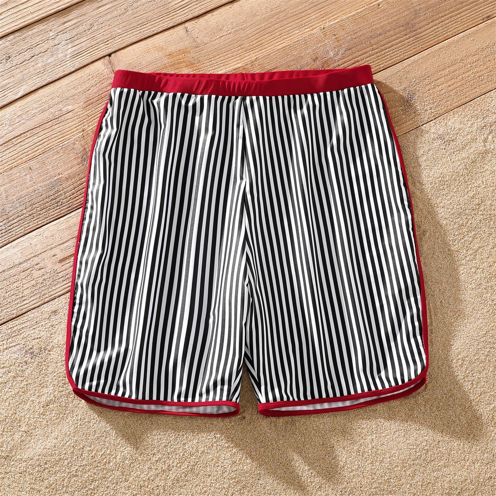- Diseño de rayas: elegantes pantalones cortos de natación a rayas y traje de baño de una pieza con detalle de empalme de volantes.