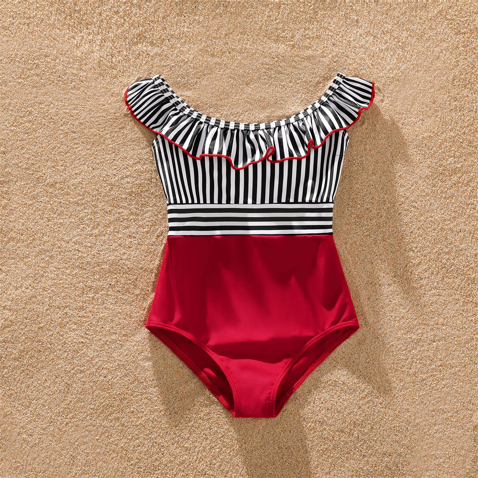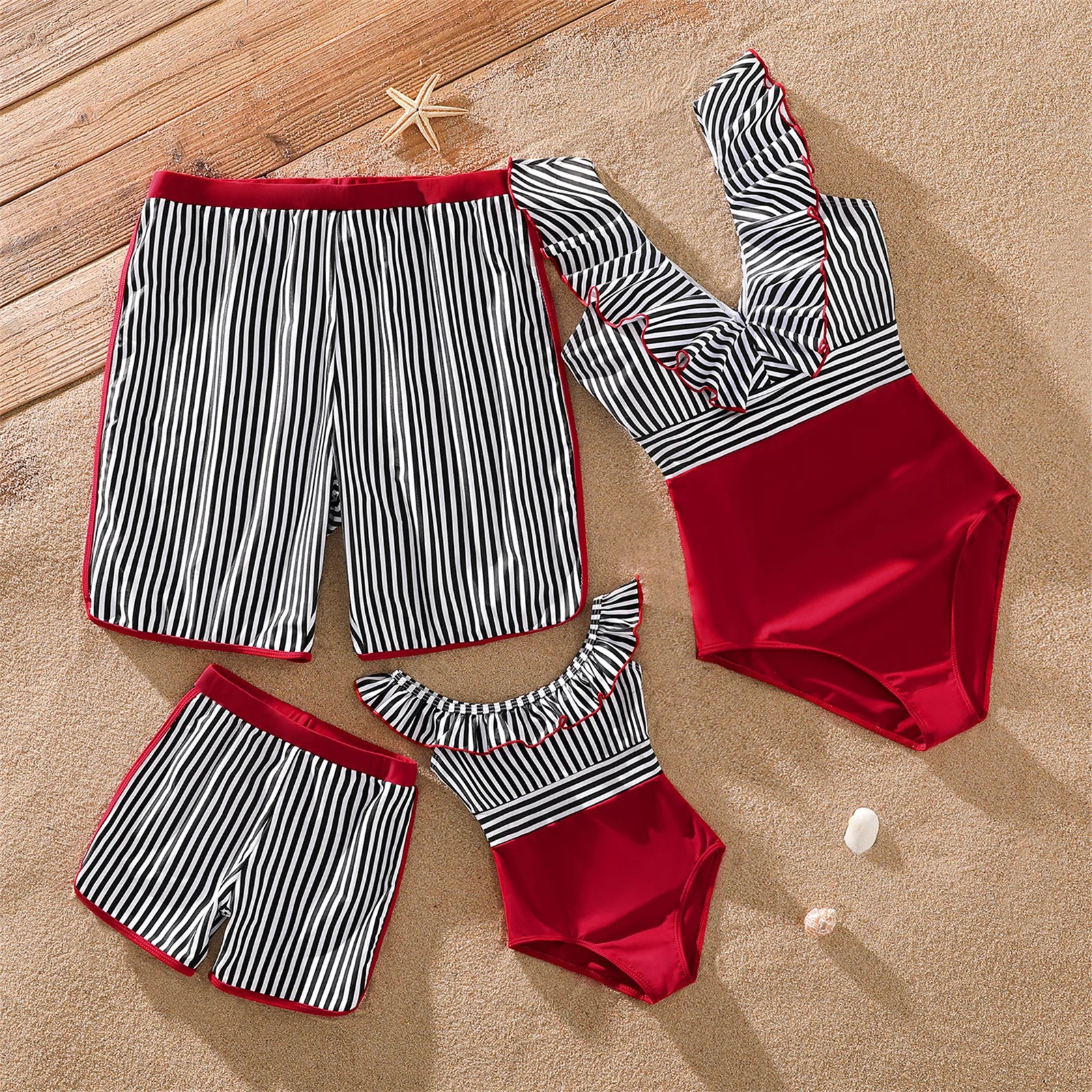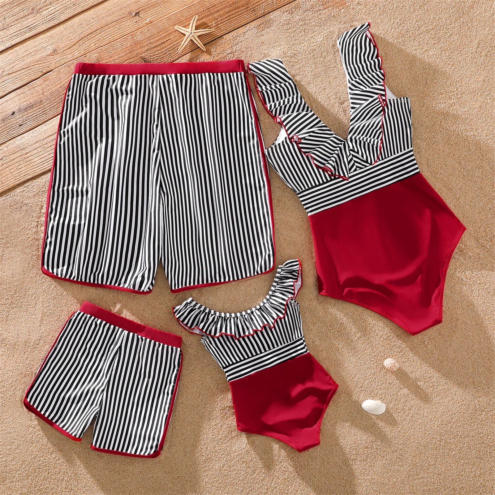 Introducción del producto: ¡Sumérjase en la diversión del verano con nuestro conjunto de trajes de baño a juego para toda la familia! Este conjunto incluye pantalones cortos de natación a rayas para hombres y niños, combinados perfectamente con un traje de baño de una pieza con empalme de volantes para mujeres y niñas. Ideal para los días soleados junto a la piscina o la playa, este elegante y cómodo conjunto a juego presenta volantes decorativos y un favorecedor diseño de cuello en V con almohadillas desmontables para mujer.