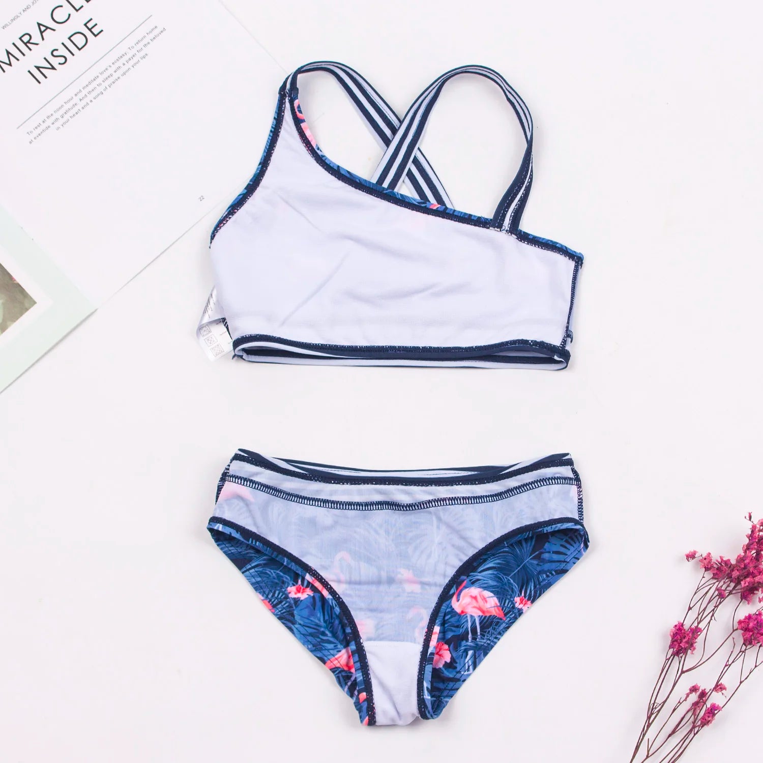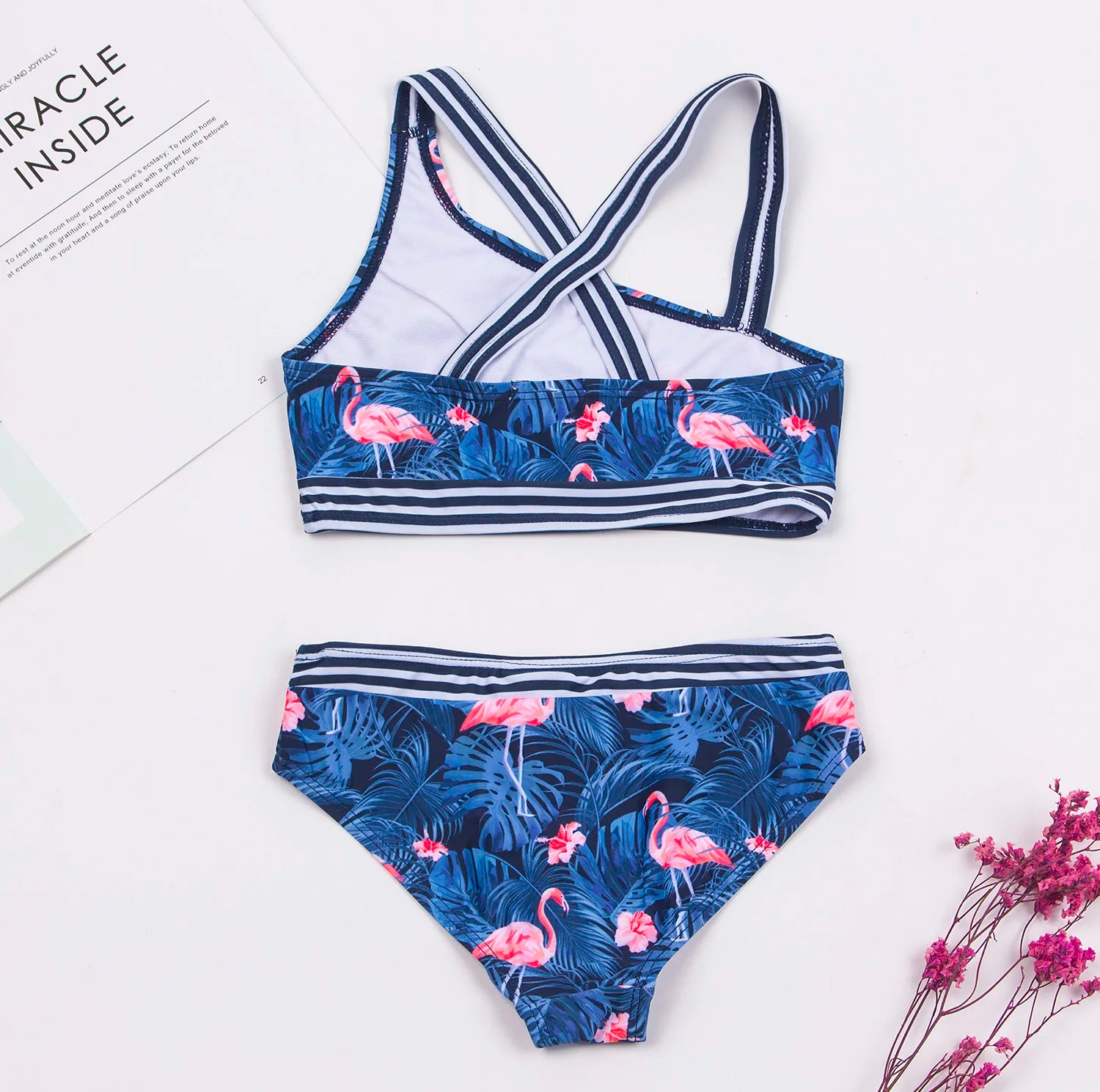 Presentamos nuestra elegante creación: ¡Conjunto de bikini para niñas con estampado de flamencos!