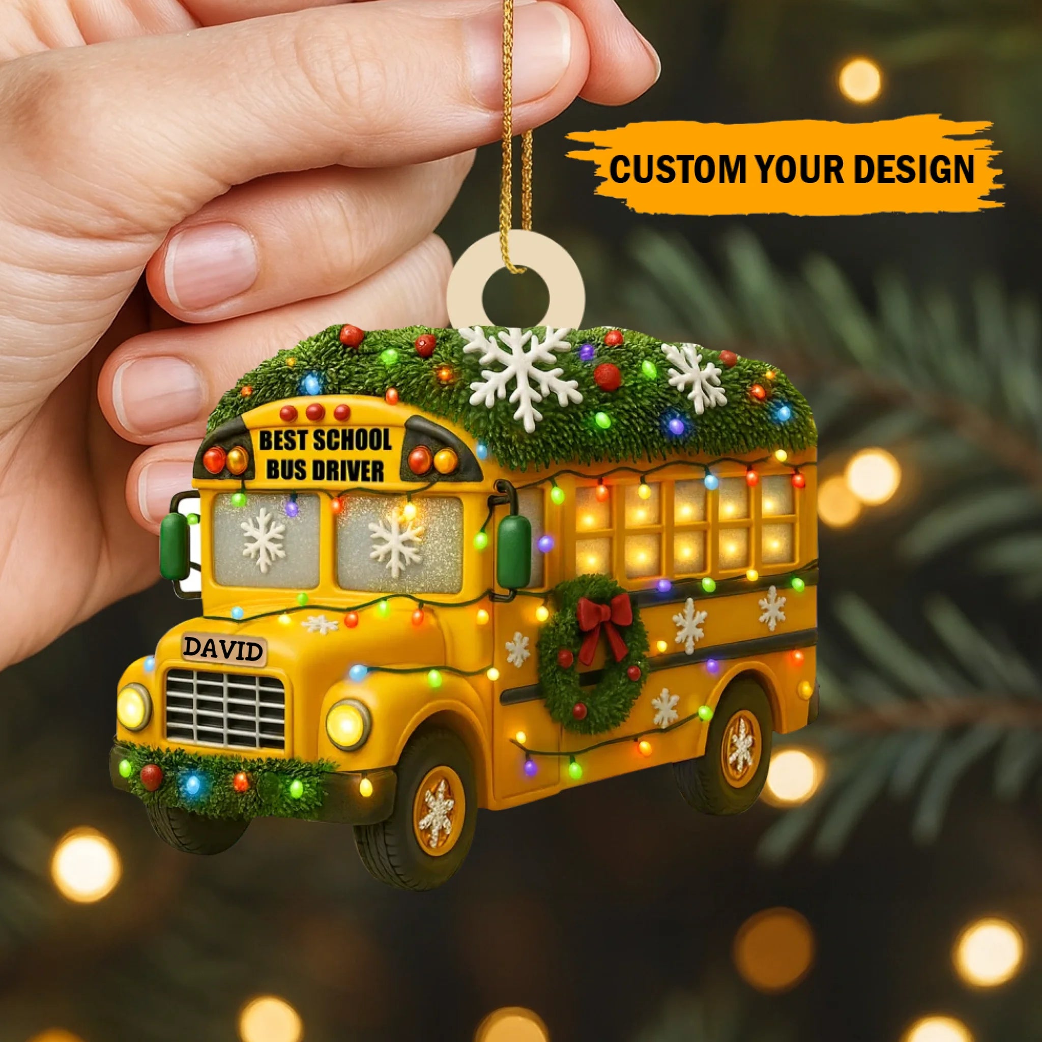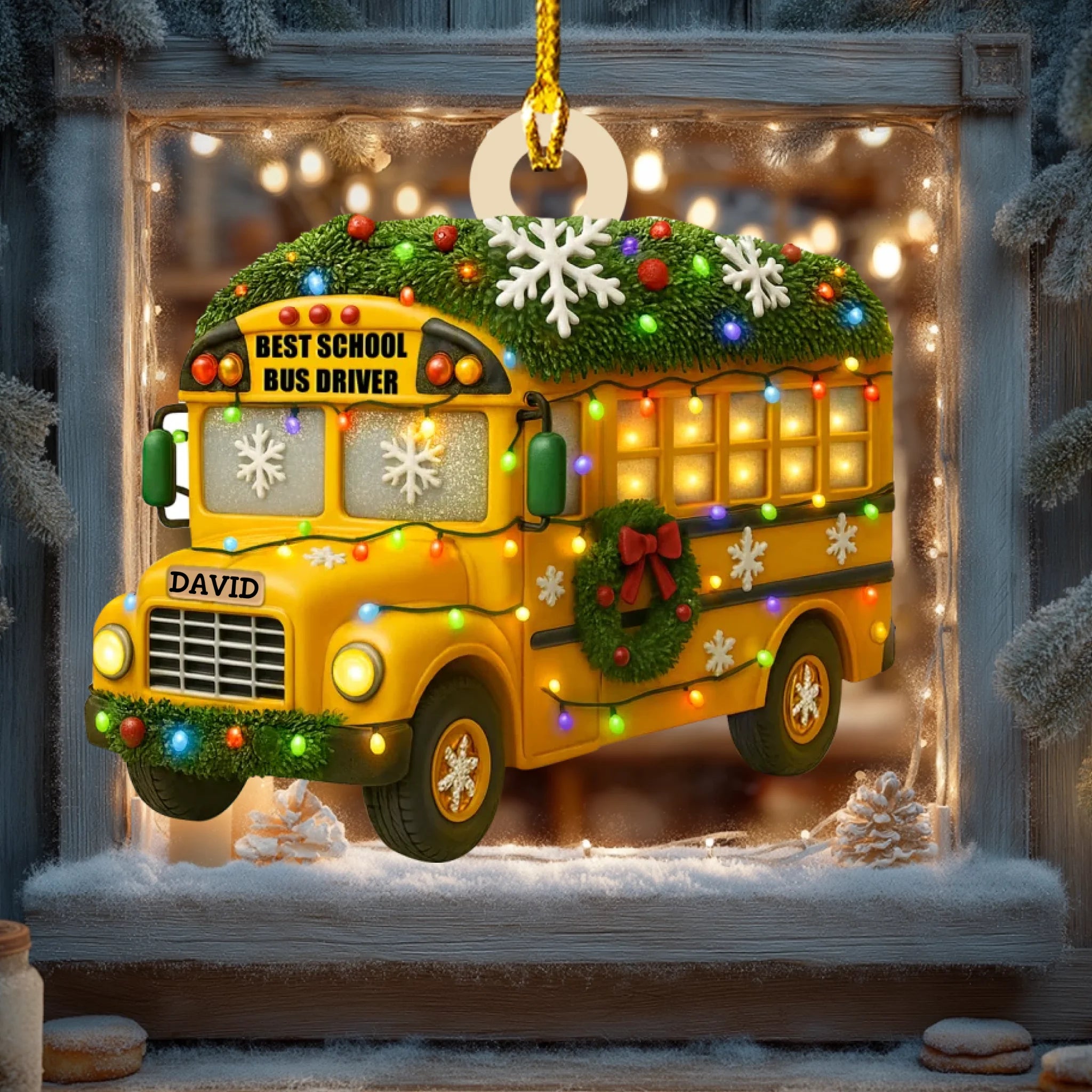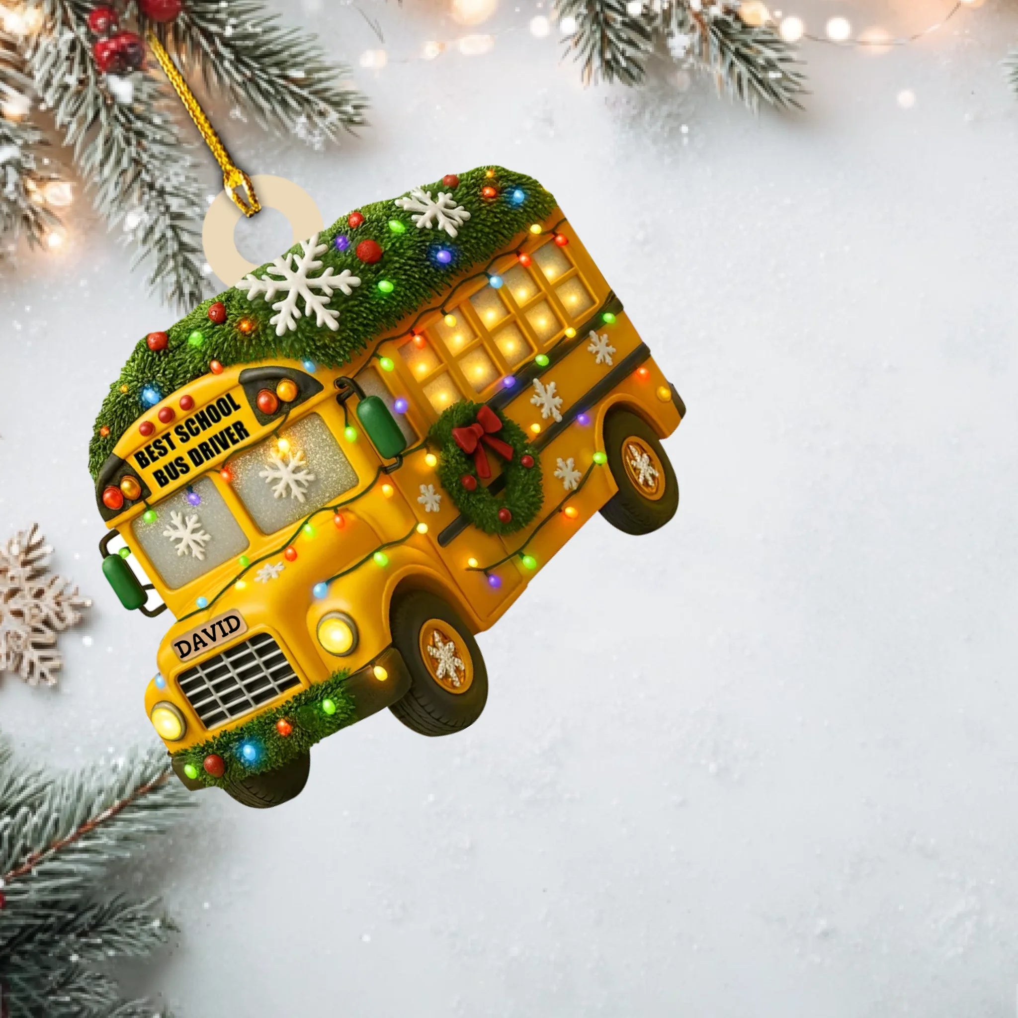 Diseñado en forma de un brillante autobús escolar amarillo adornado con luces navideñas, coronas y copos de nieve, este adorno captura el calor y la alegría de la temporada navideña. Puedes personalizarlo con el nombre del conductor en la placa frontal, convirtiéndolo en un recuerdo sincero o un regalo de agradecimiento para aquellos que guían a los estudiantes de manera segura todos los días.