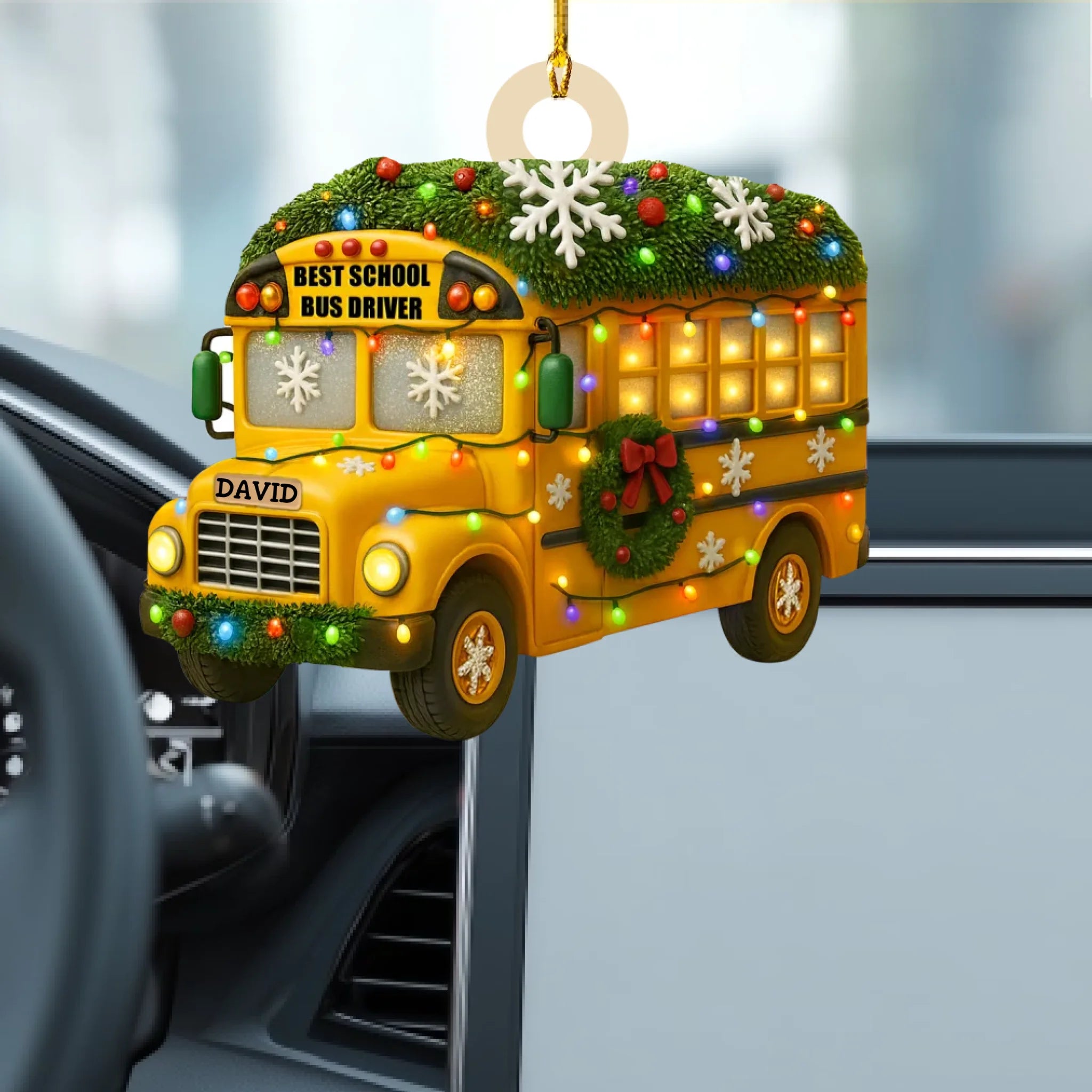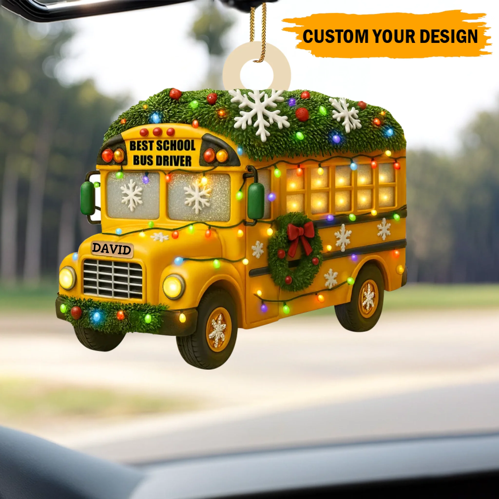 Este diseño detallado añade un toque festivo a cualquier espacio, perfecto para colgar en un árbol de Navidad, espejo del coche, o exhibir en casa o en el aula. Ya sea que se lo estés regalando a un conductor de autobús escolar, personal de transporte u profesor, es una forma encantadora de mostrar aprecio.