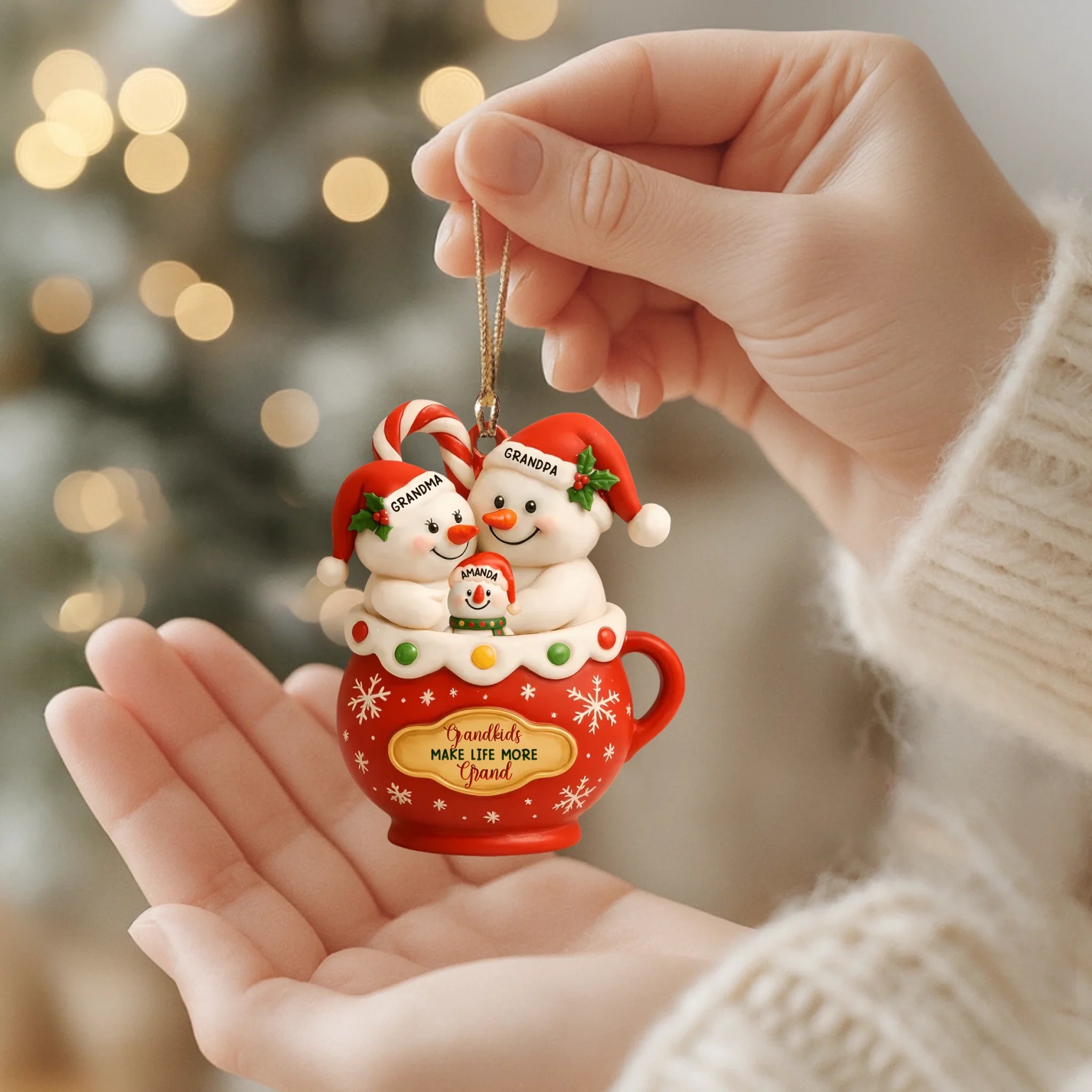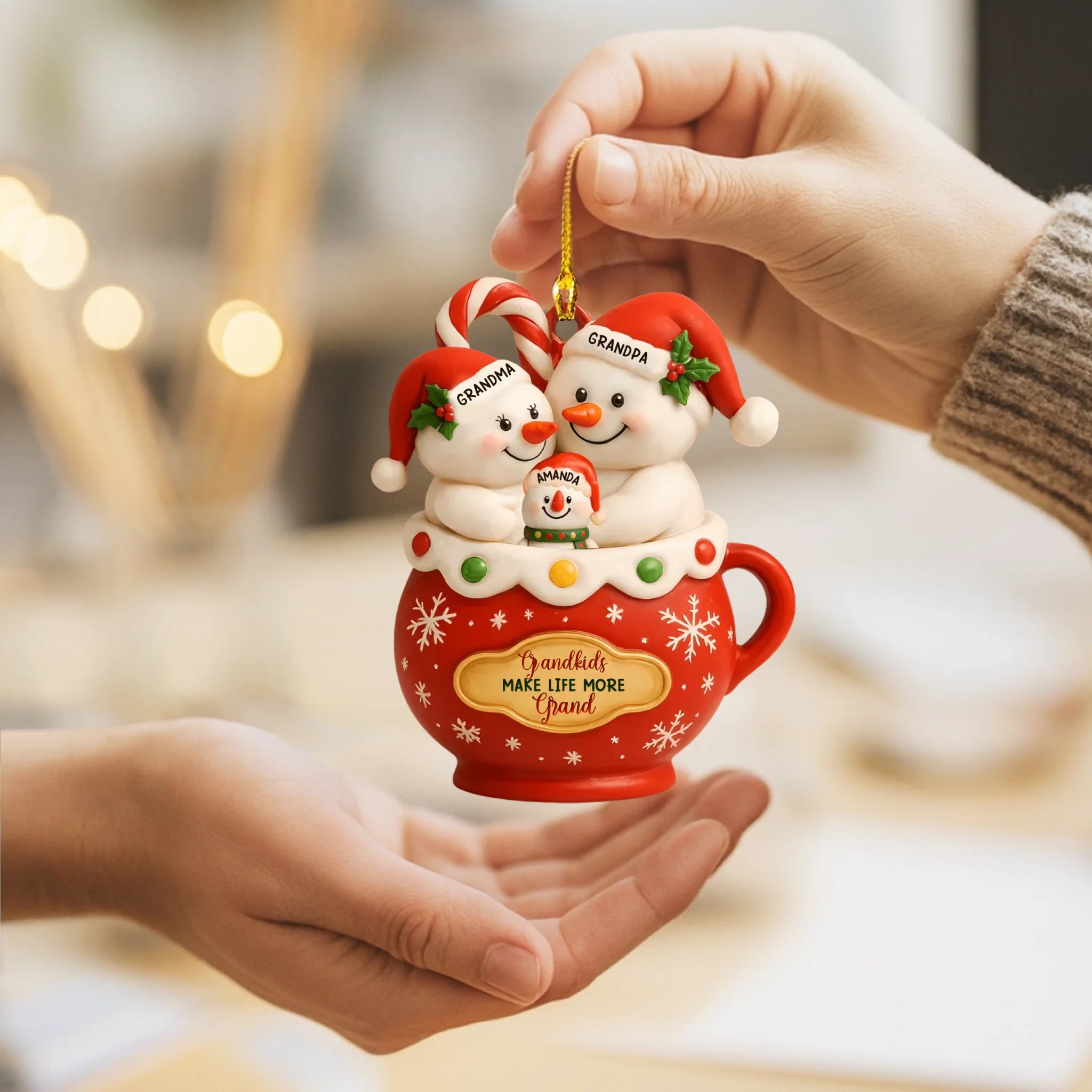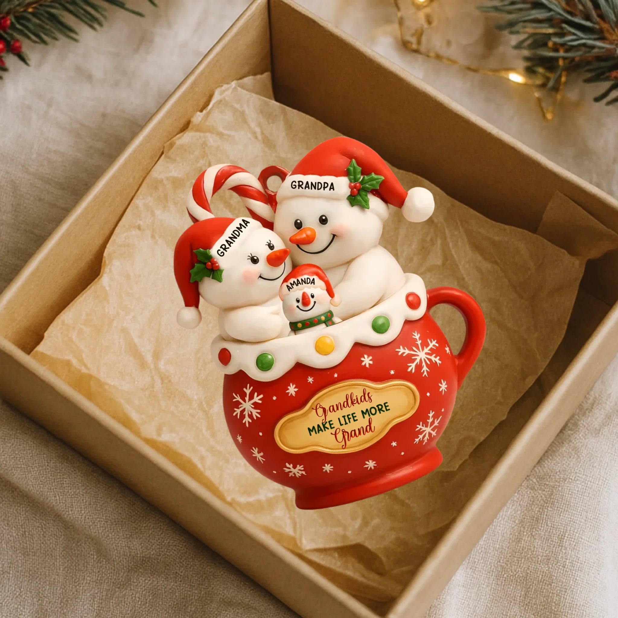 Con adorables abuelos y nietos de nieve sentados juntos en una taza roja festiva, este adorno captura perfectamente la alegría y el amor que hacen inolvidables los momentos familiares.
