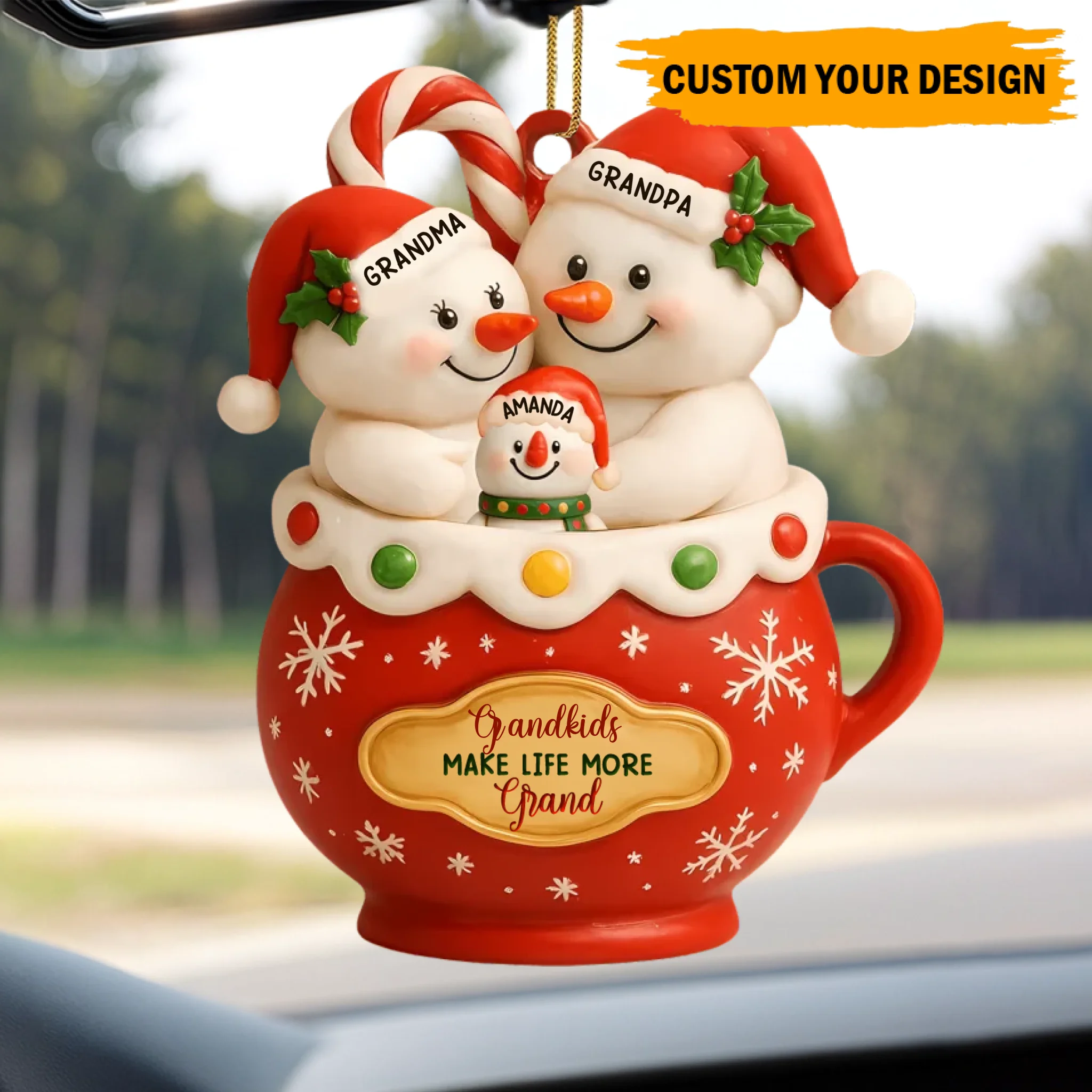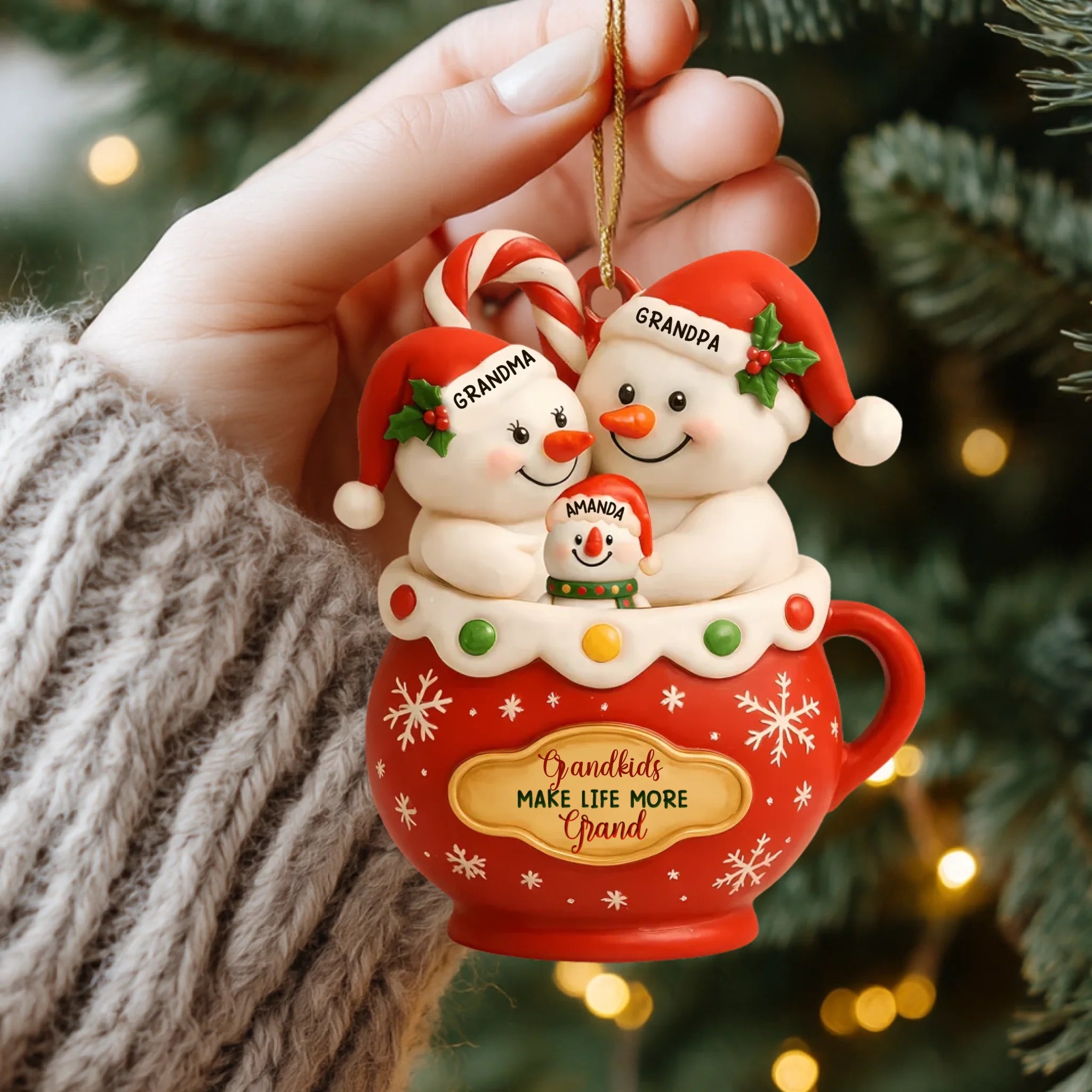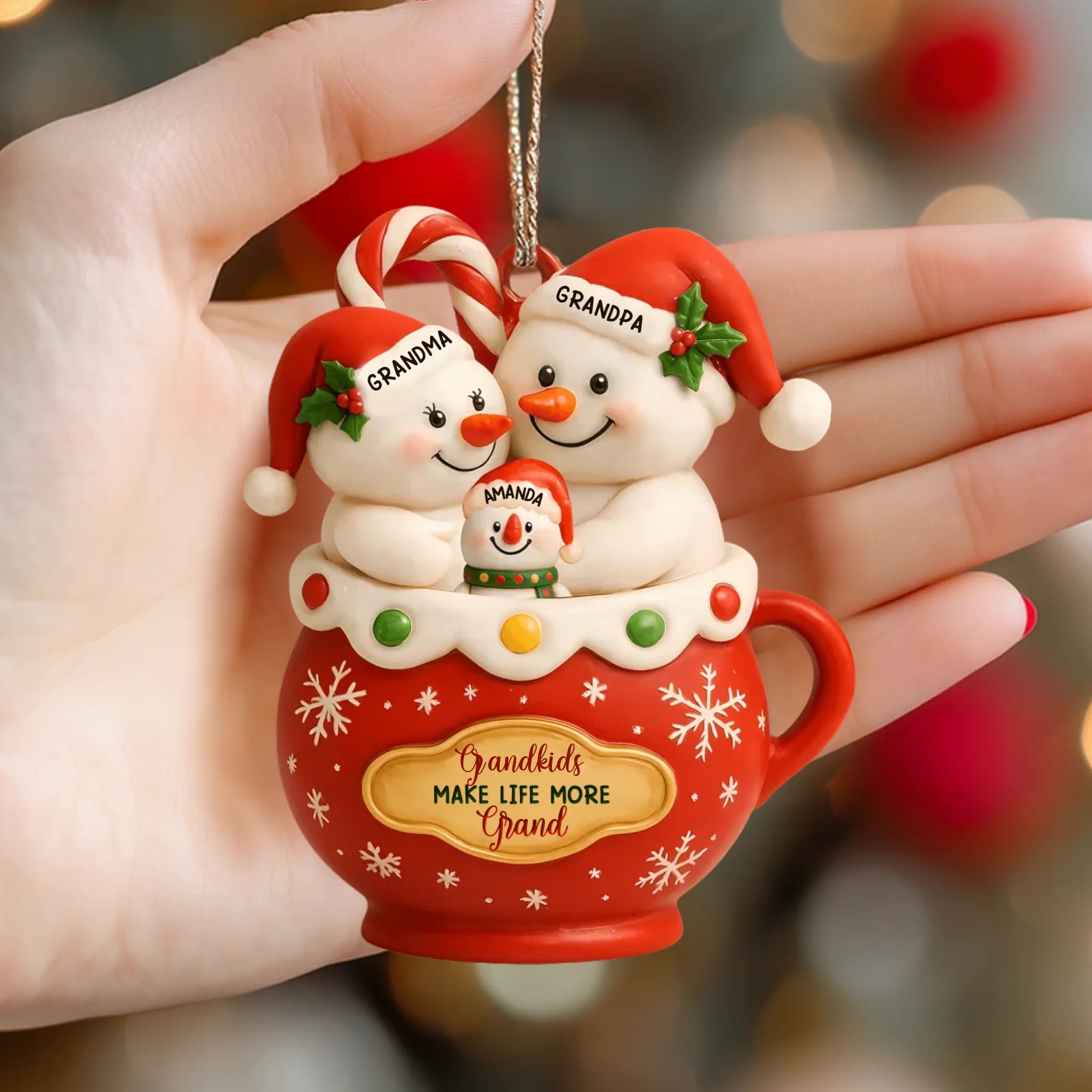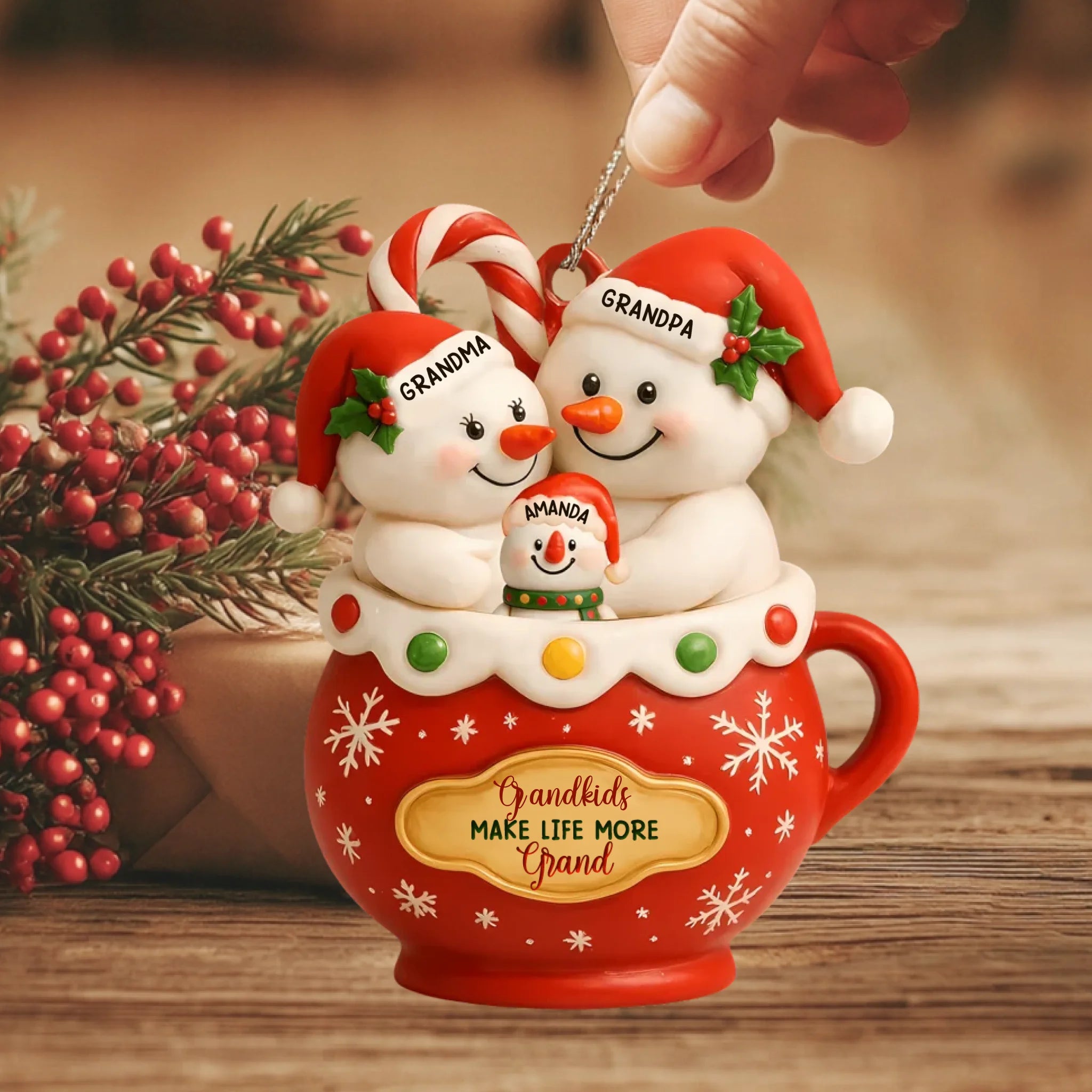 Con adorables abuelos y nietos de nieve sentados juntos en una taza roja festiva, este adorno captura perfectamente la alegría y el amor que hacen inolvidables los momentos familiares.