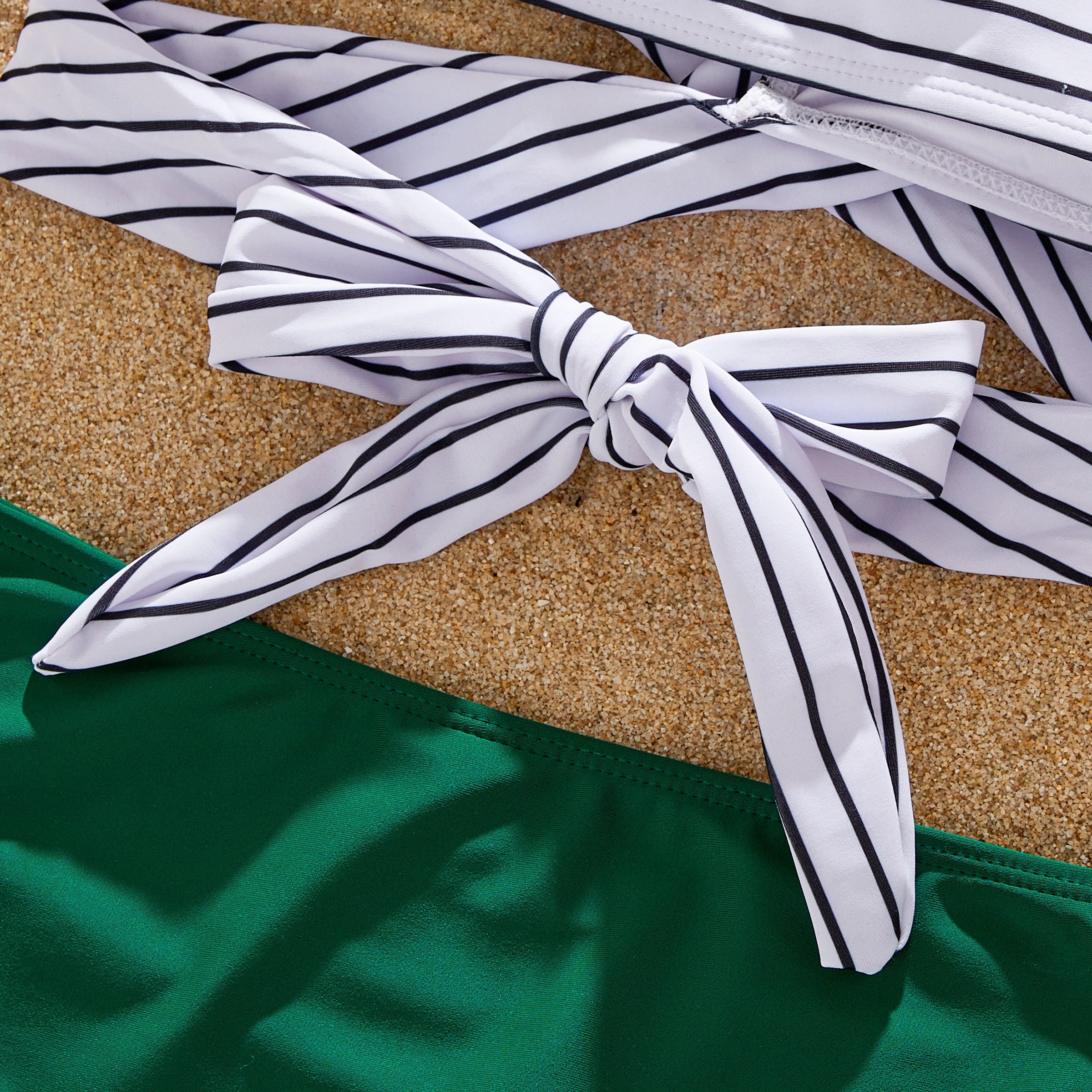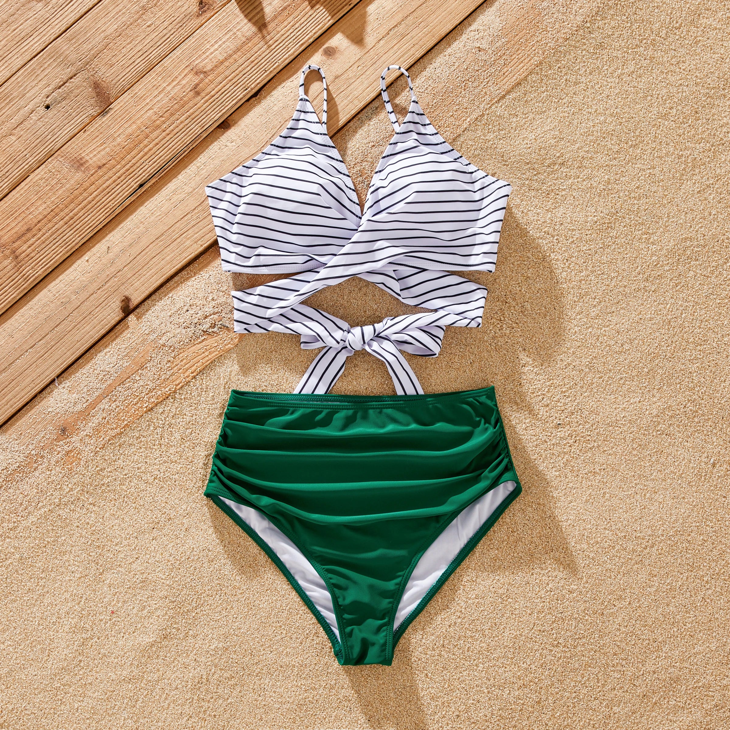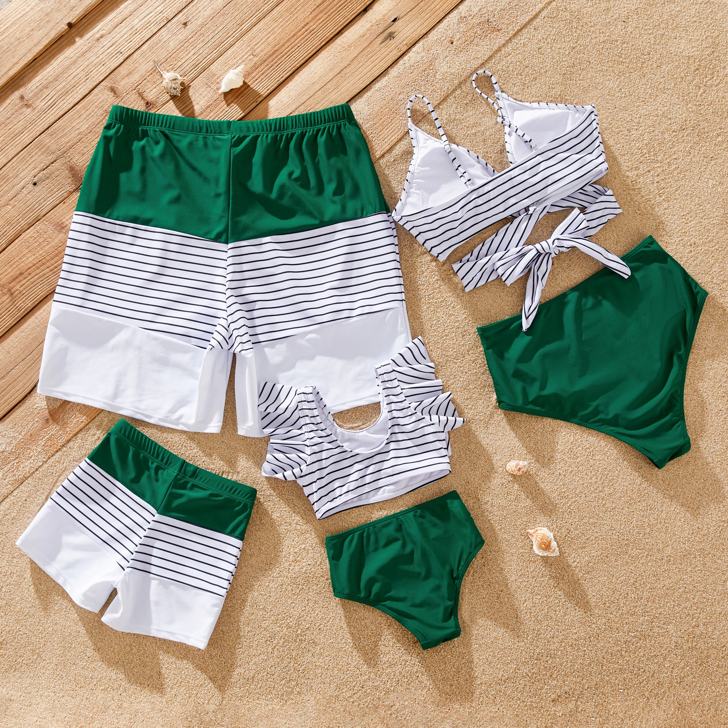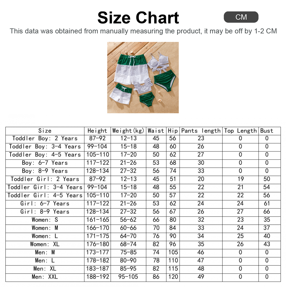 Prepárate para un verano lleno de aventuras en la playa con nuestros trajes de baño familiares a juego en vibrantes rayas verdes. Confeccionado con una mezcla de poliéster y spandex suave e impermeable, este conjunto de traje de baño es perfecto para crear recuerdos inolvidables con sus seres queridos bajo el sol.
